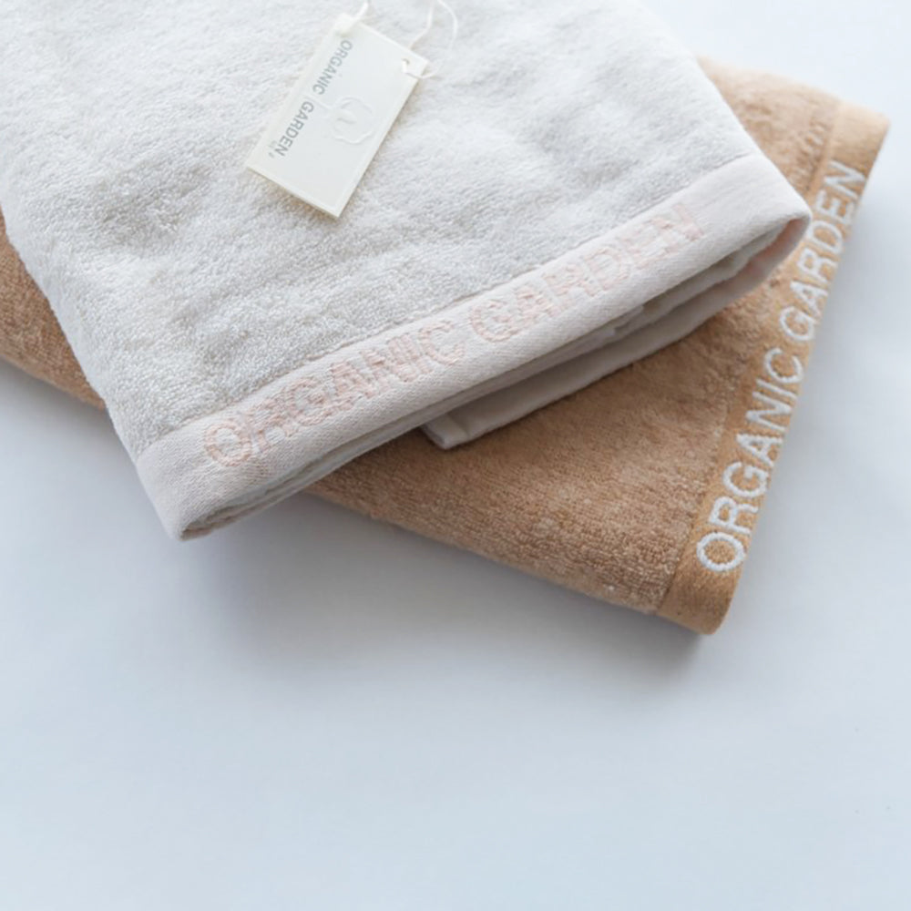 ヘムにはORGANIC GARDENのロゴ織り入り。どちらの色も無着色なので、綿本来のナチュラルな色をお楽しみください。