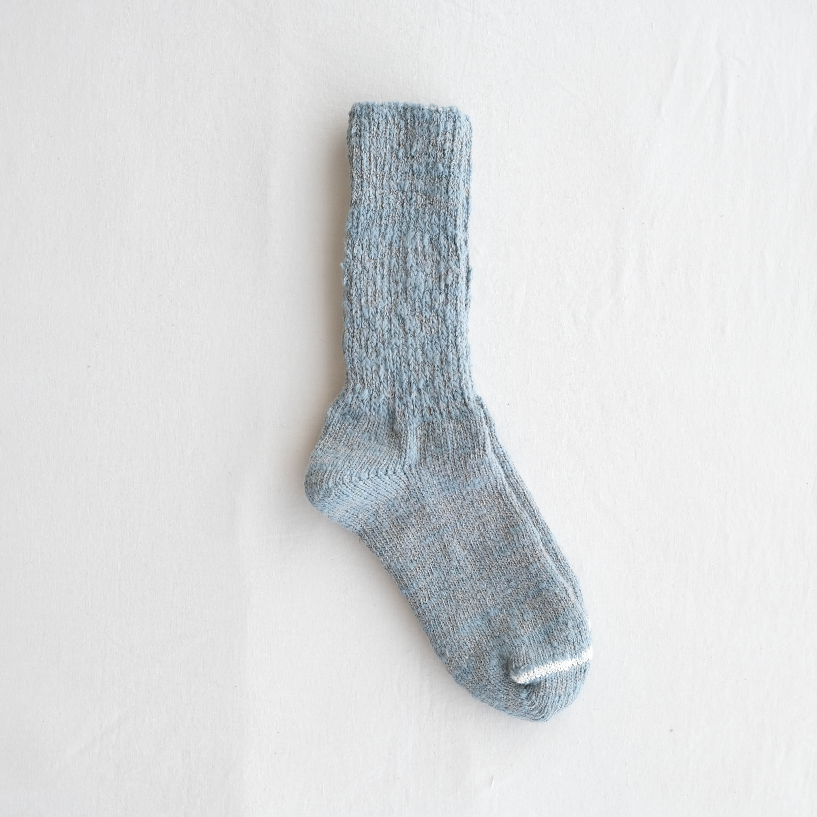 日本独自の紡績方法「ガラ紡」の糸をオリジナルカラー染めした特別な一足です。締め付けの少ない編み地で優しく編み立てているので、ルームソックスとしておうち時間に履くと心地よく毎日に寄り添ってくれます。とても豊かな風合いで、タオルのように優しく足を包み込んでくれます。