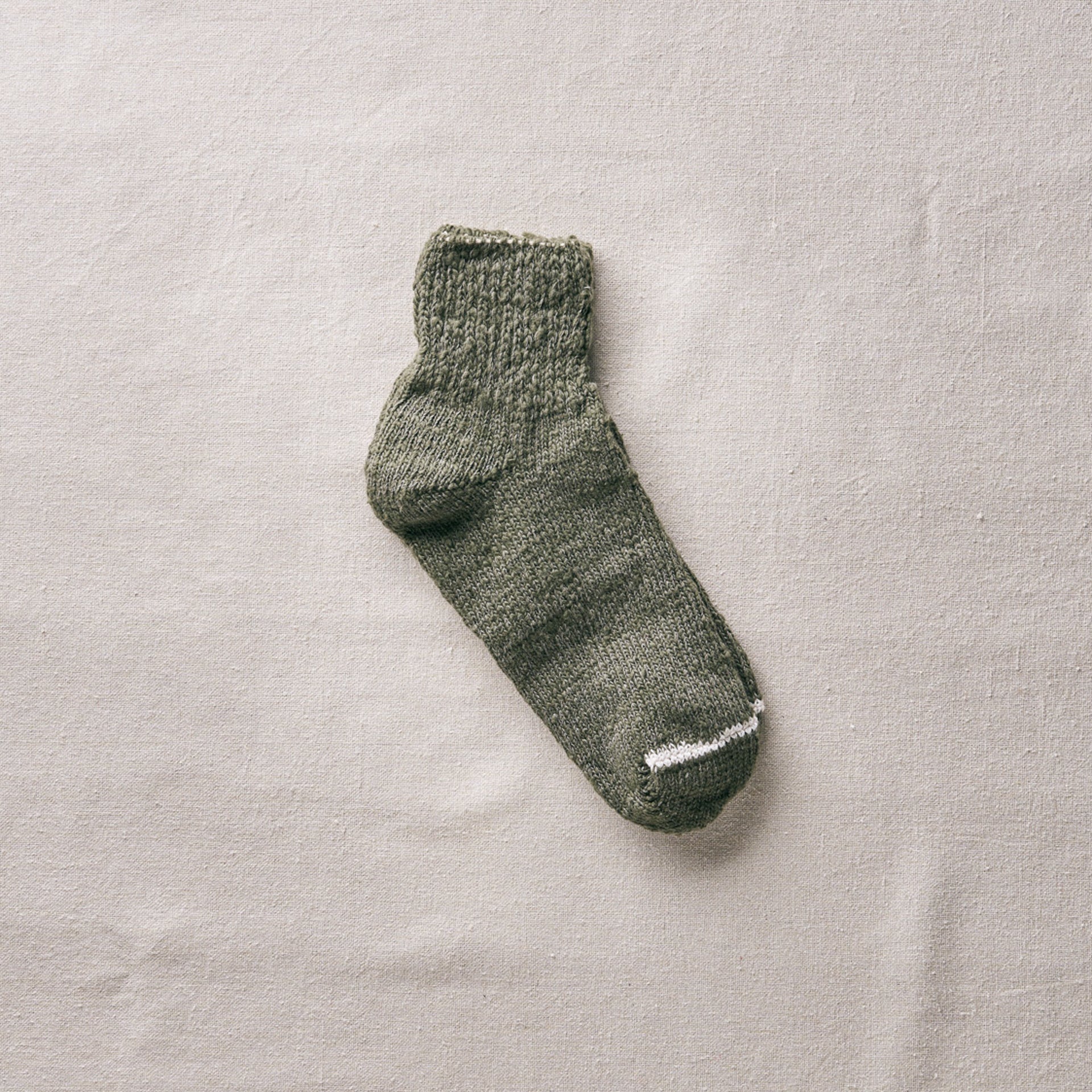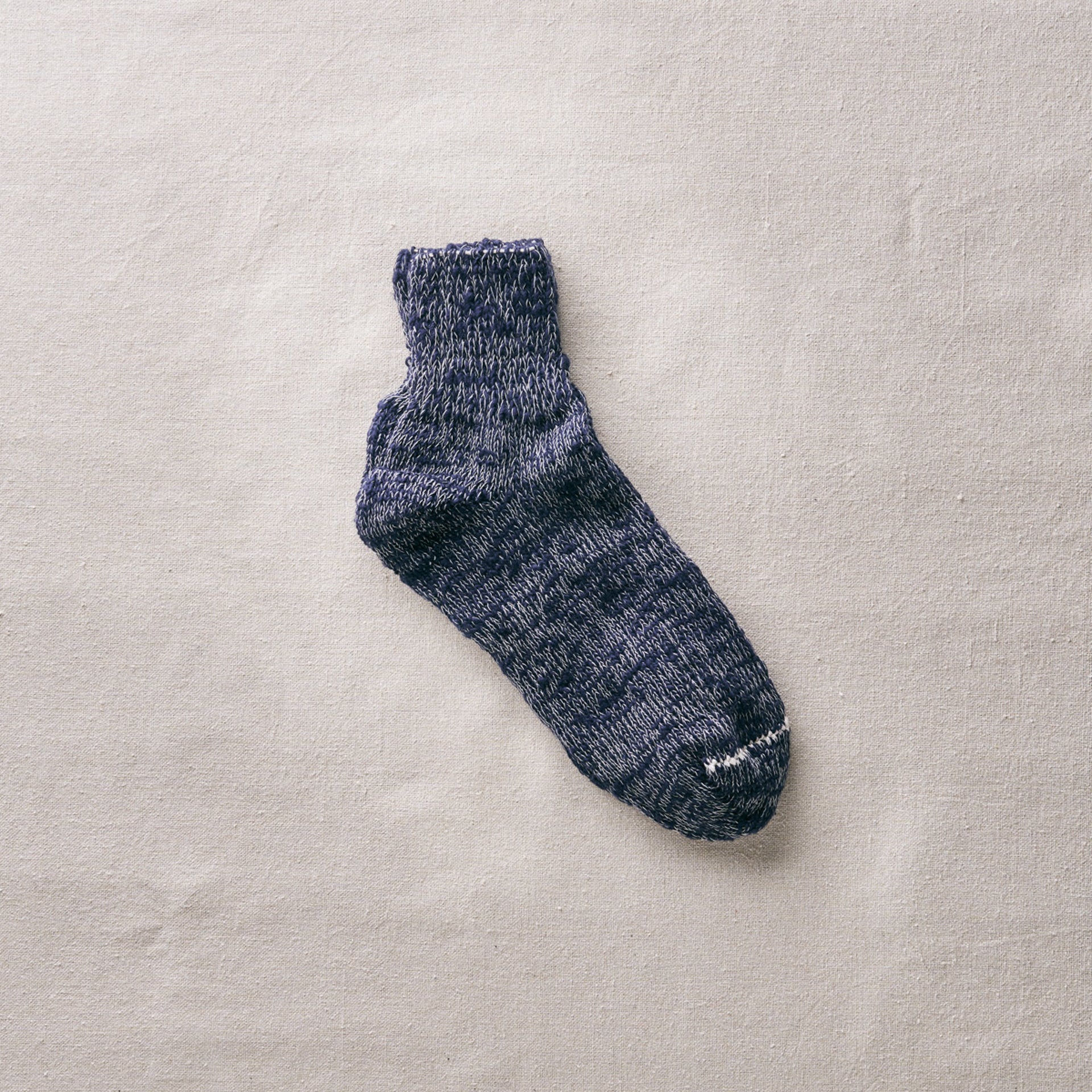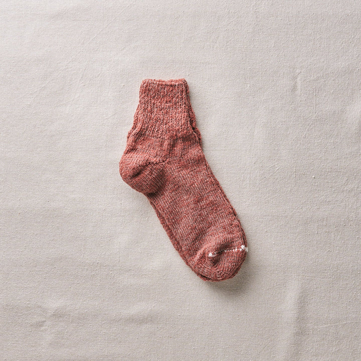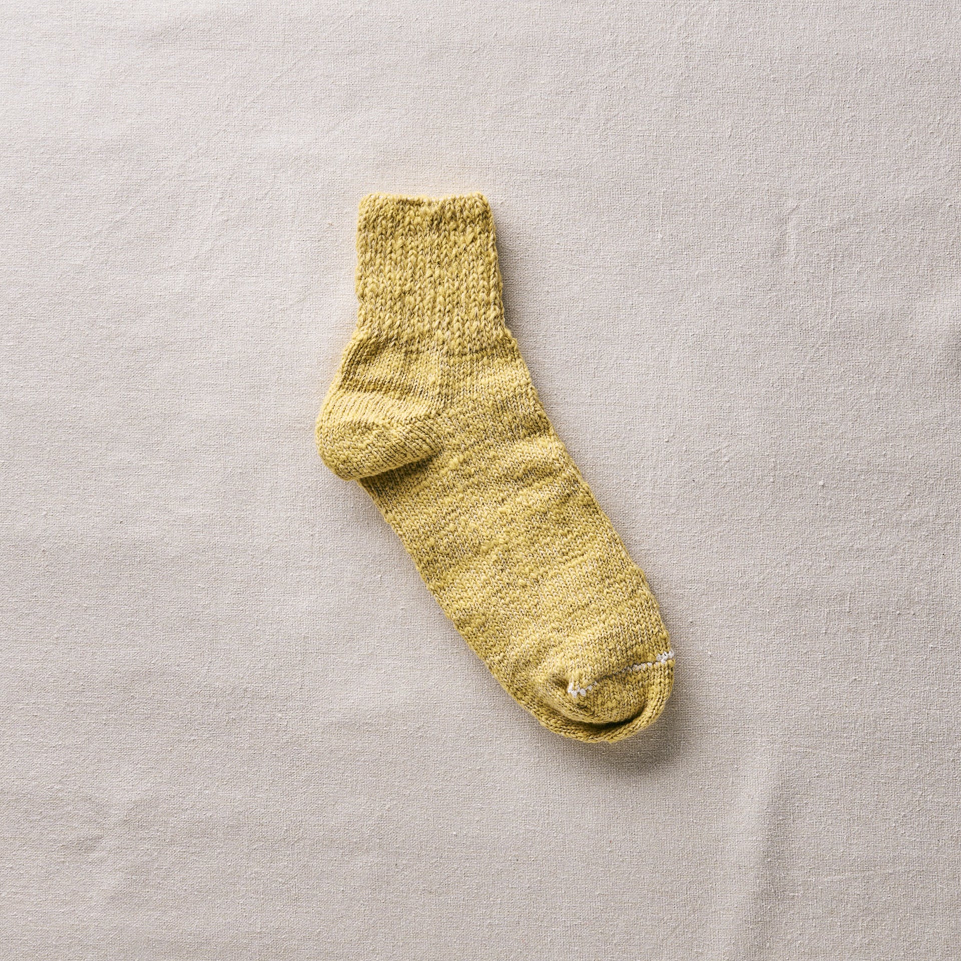 日本独自の紡績方法「ガラ紡」の糸をオリジナルカラー染めした特別な一足です。締め付けの少ない編み地で優しく編み立てているので、ルームソックスとしておうち時間に履くと心地よく毎日に寄り添ってくれます。とても豊かな風合いで、タオルのように優しく足を包み込んでくれます。