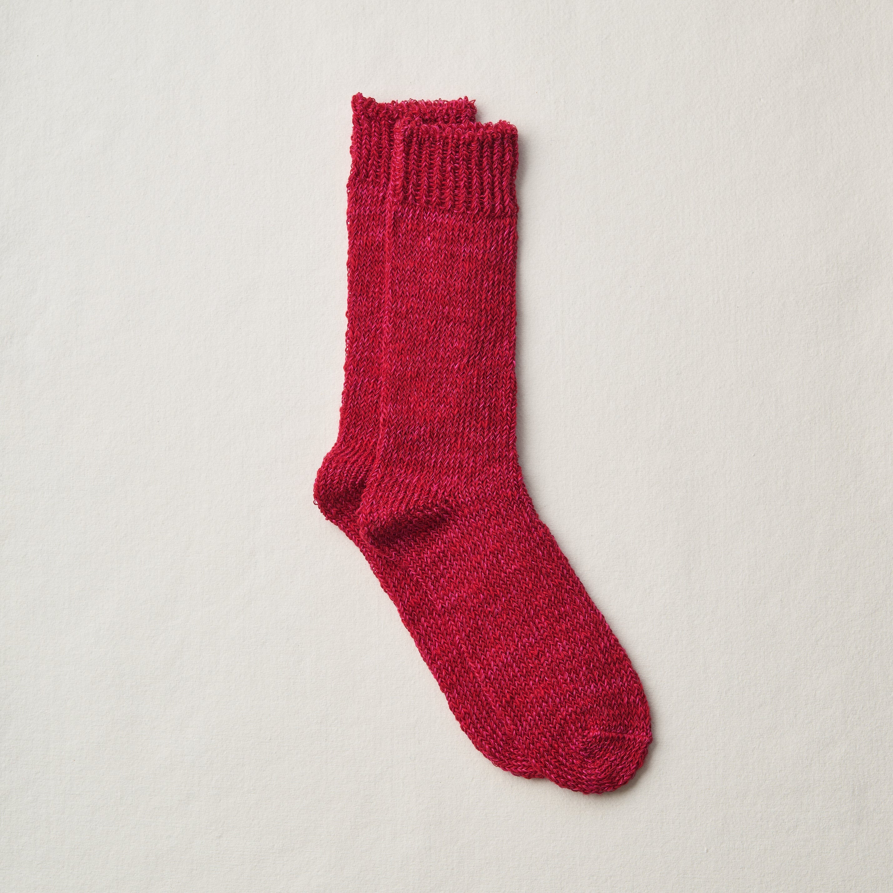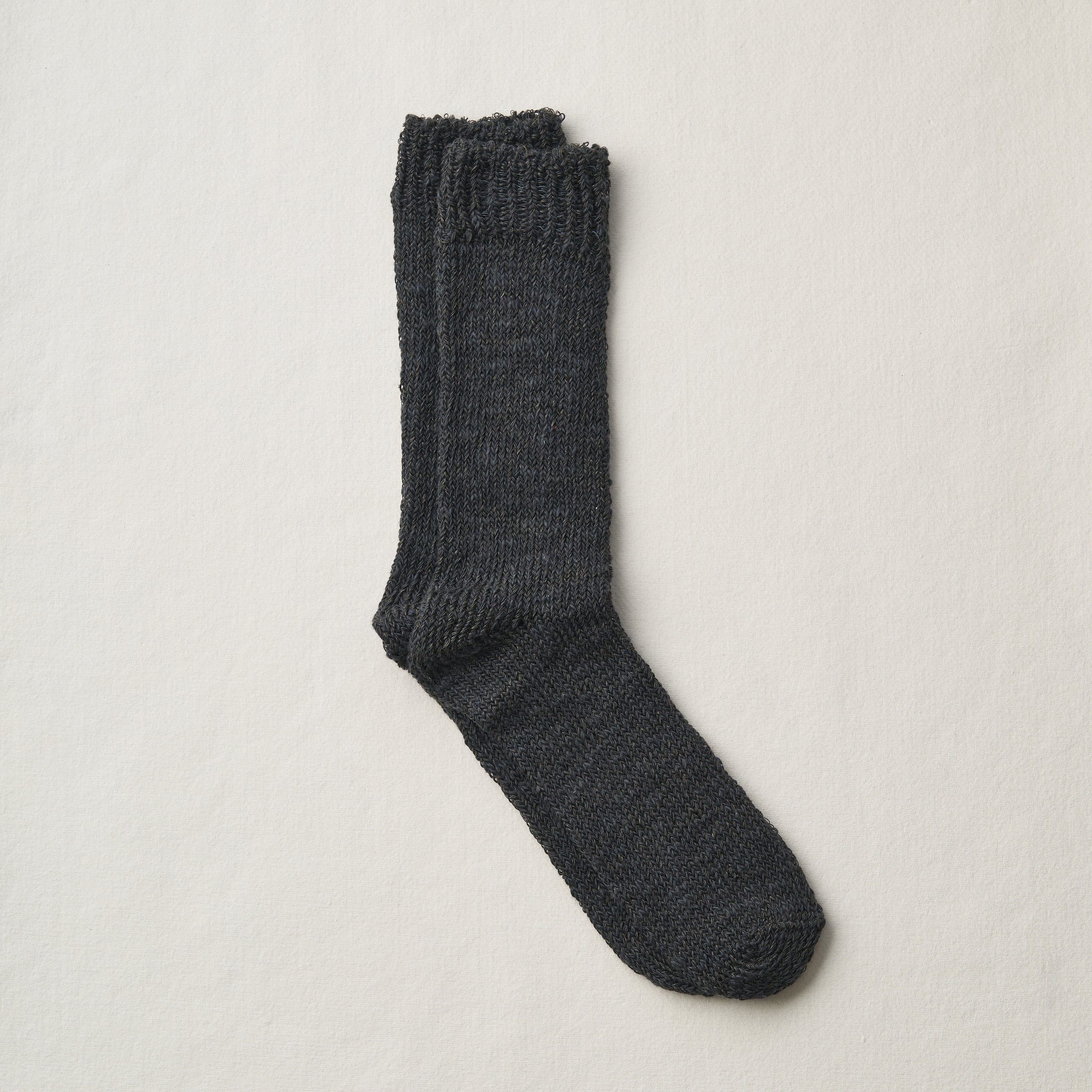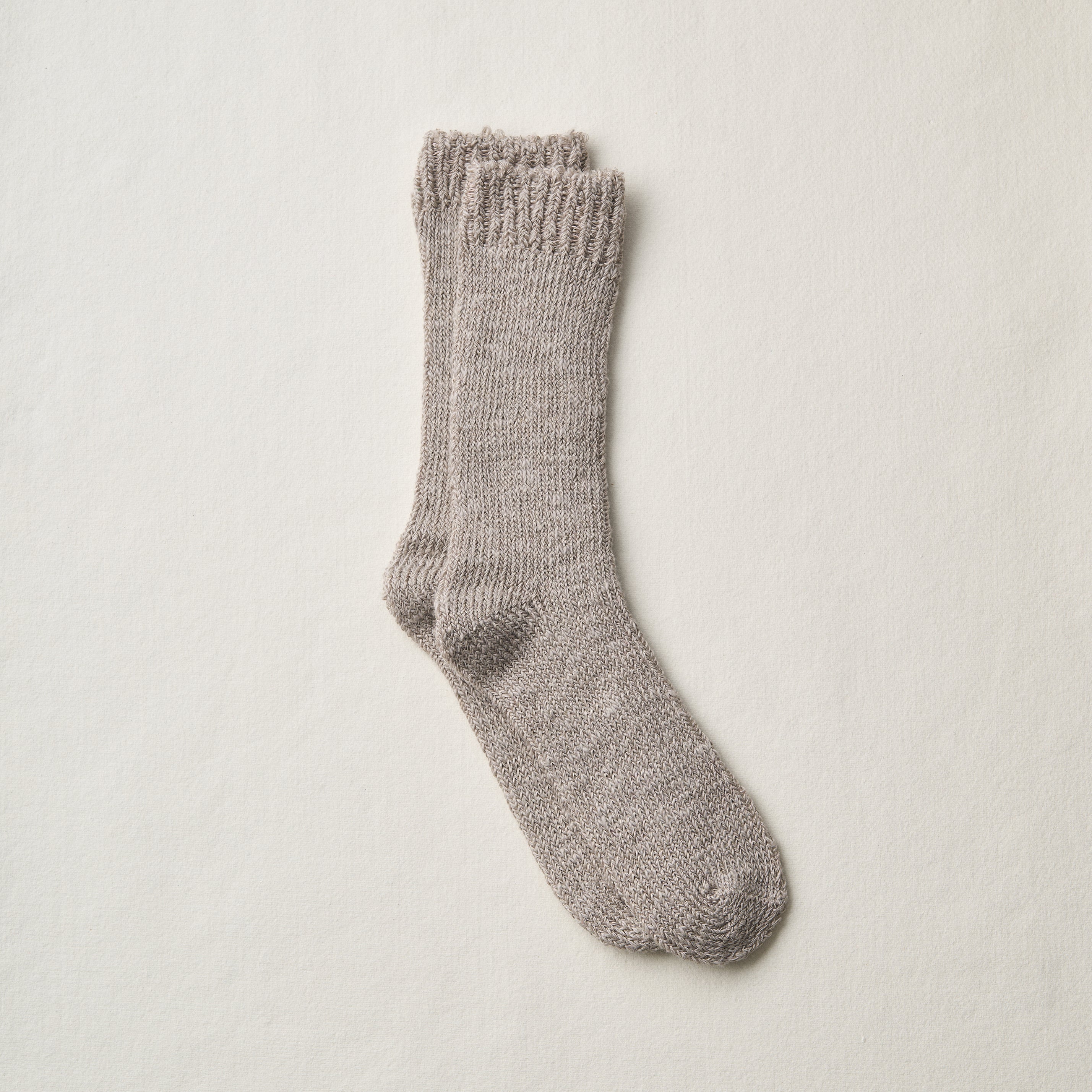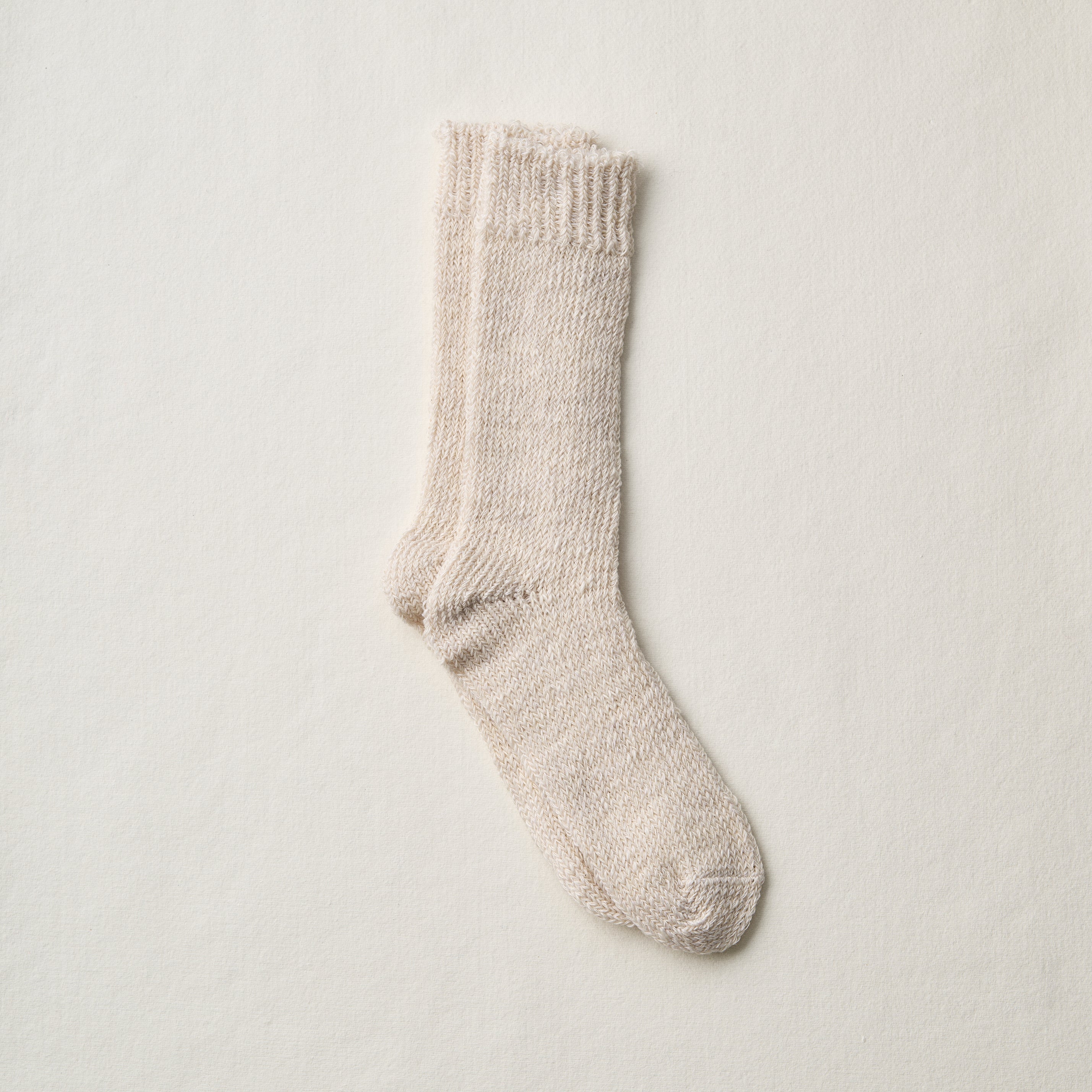 オーガニックコットンとリネンを引き揃えて編み立てたプレーンソックス。イギリスのベントレー社製の古いヴィンテージマシーンでざっくりと編み立てており、伸びが良く、快適で通気性の良い履き心地です。