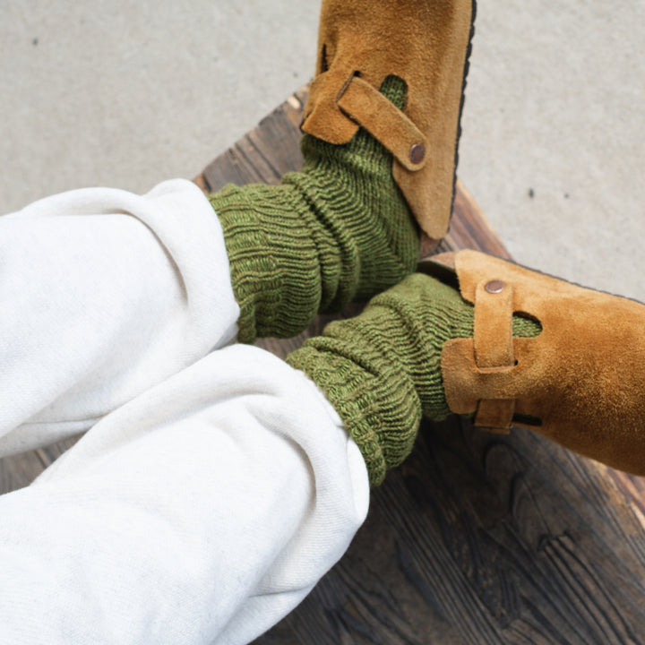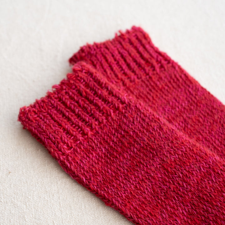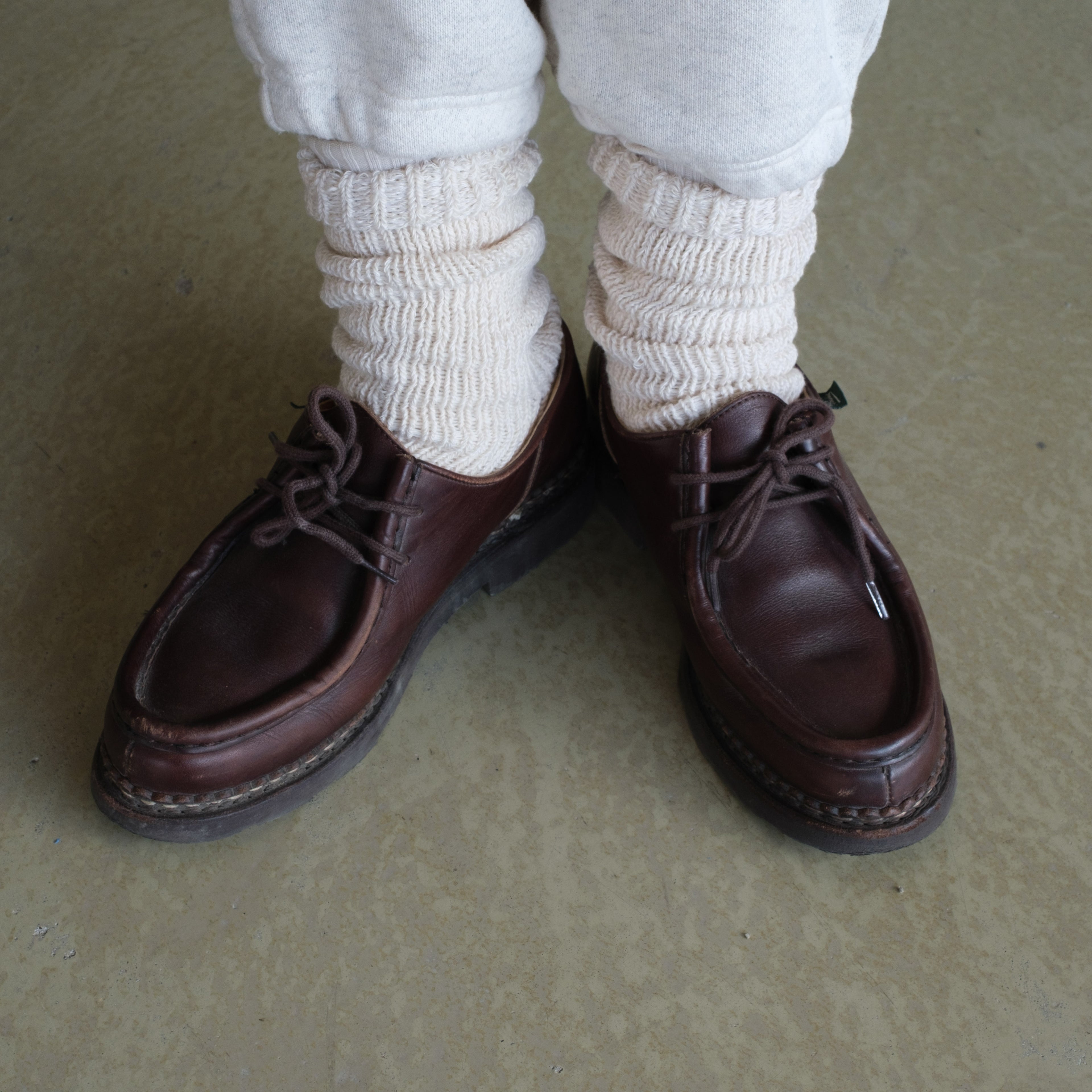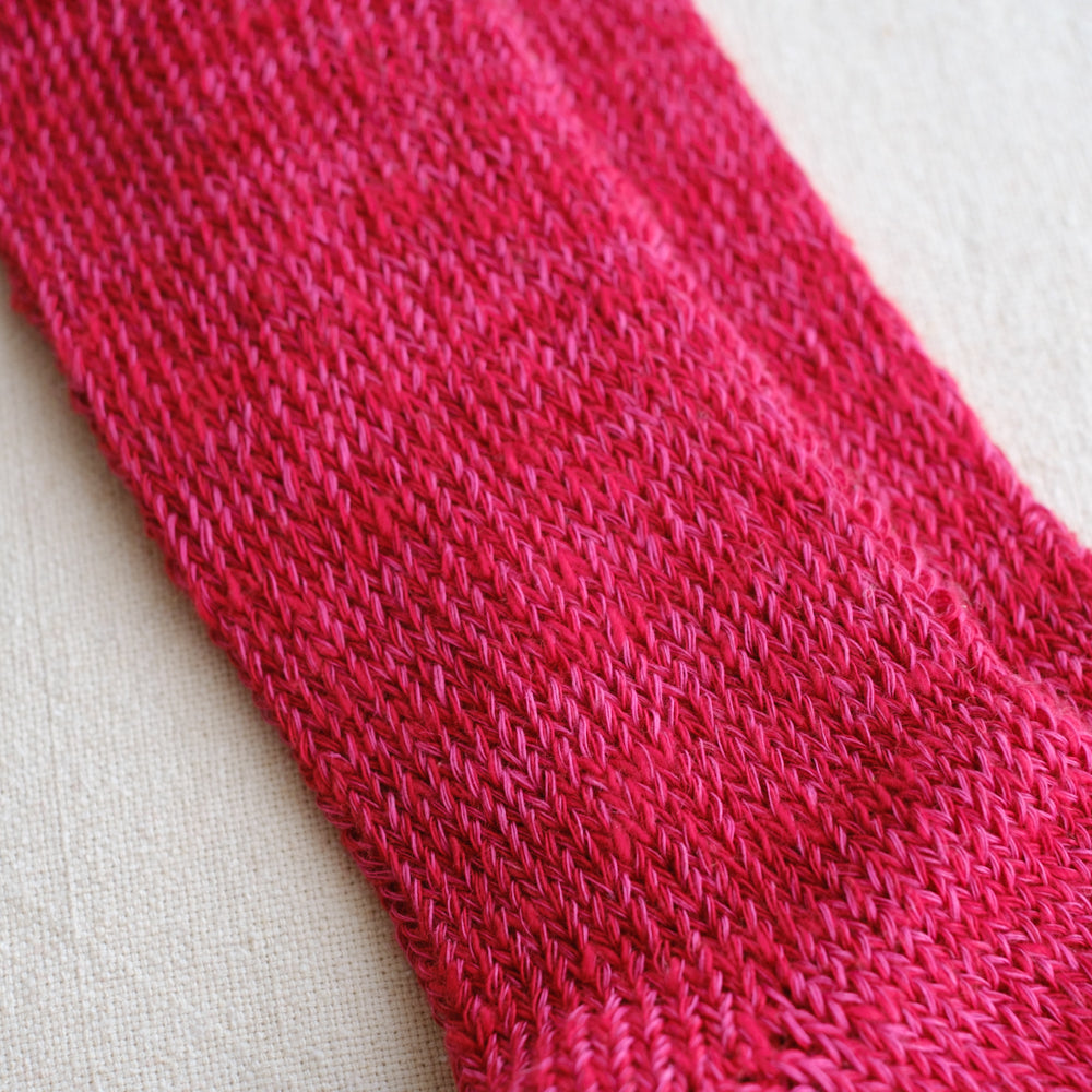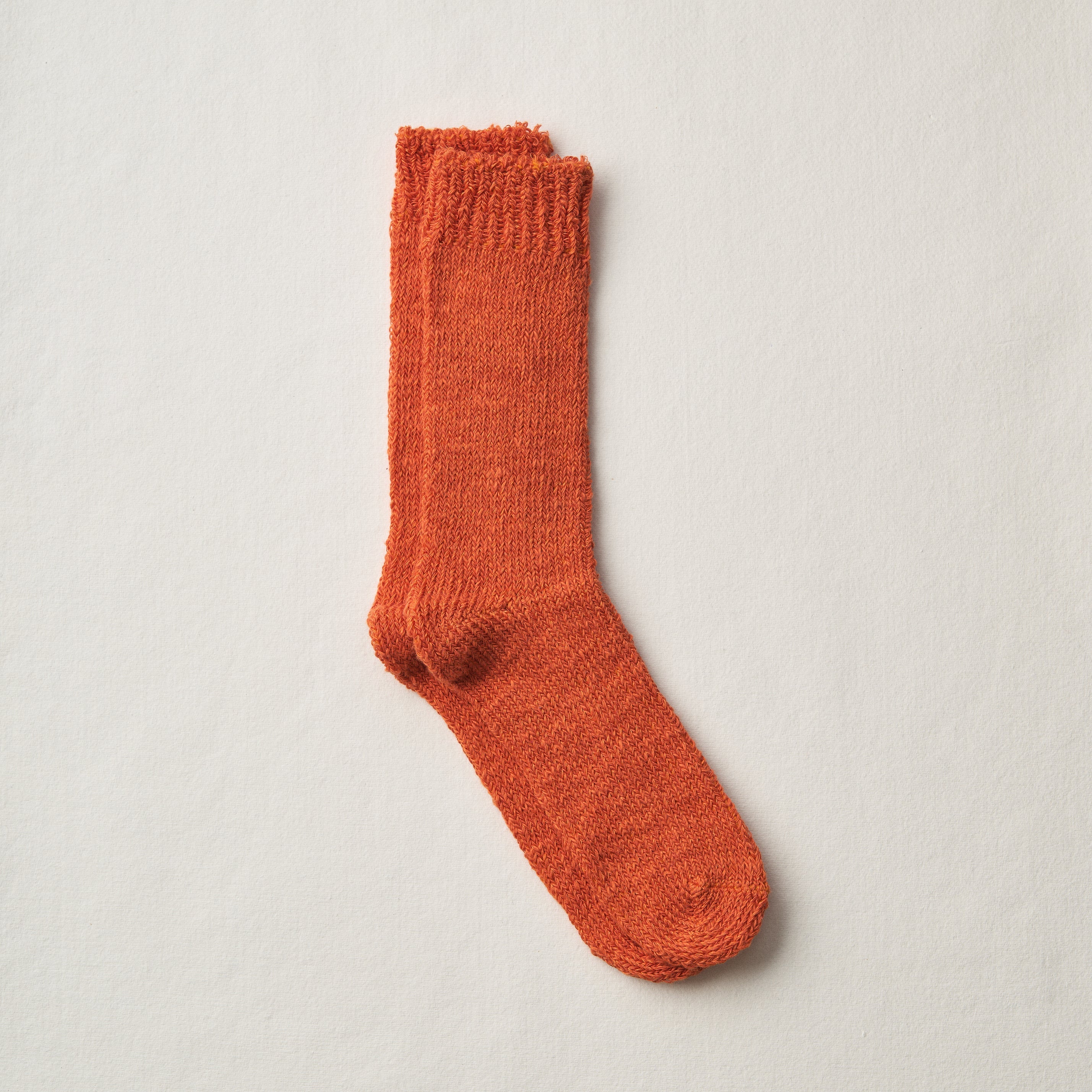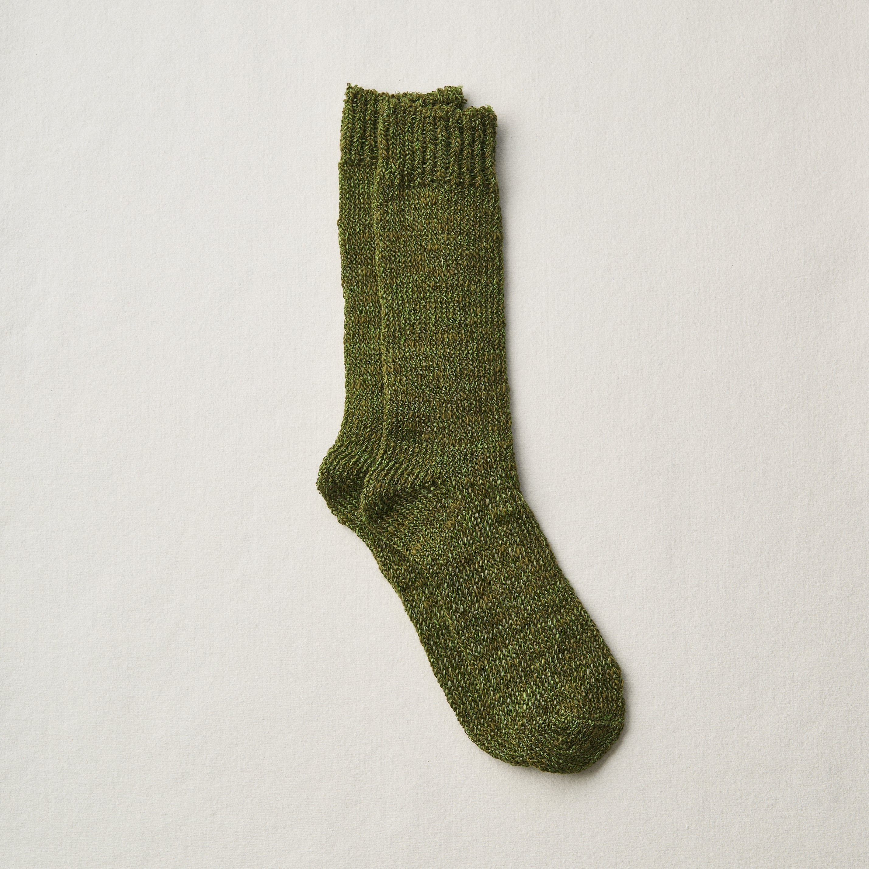 オーガニックコットンとリネンを引き揃えて編み立てたプレーンソックス。イギリスのベントレー社製の古いヴィンテージマシーンでざっくりと編み立てており、伸びが良く、快適で通気性の良い履き心地です。