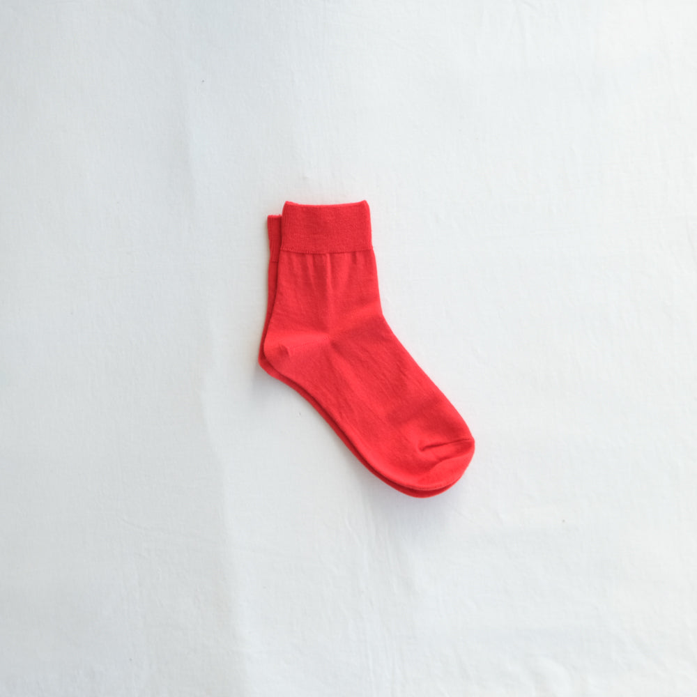 滑らかで肌触りの良い梳毛のウールで編み立てたシンプルな平編みソックス。革靴などにも合わせやすい程よい厚みの編地で、コーディネートに取り入れやすいアンクル丈です。