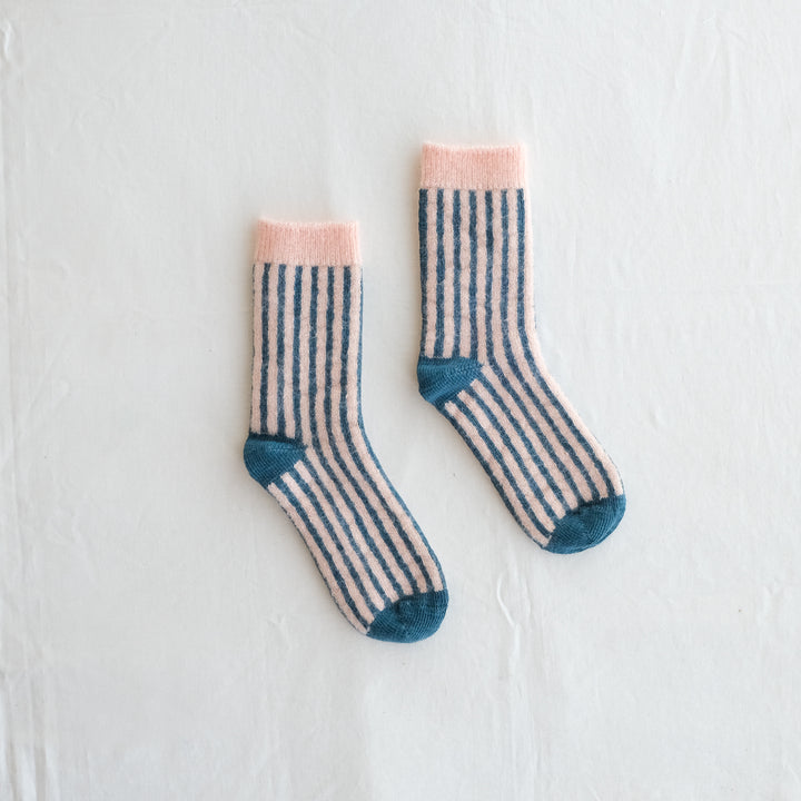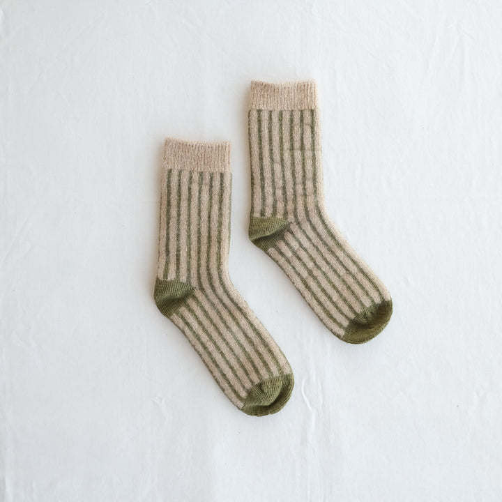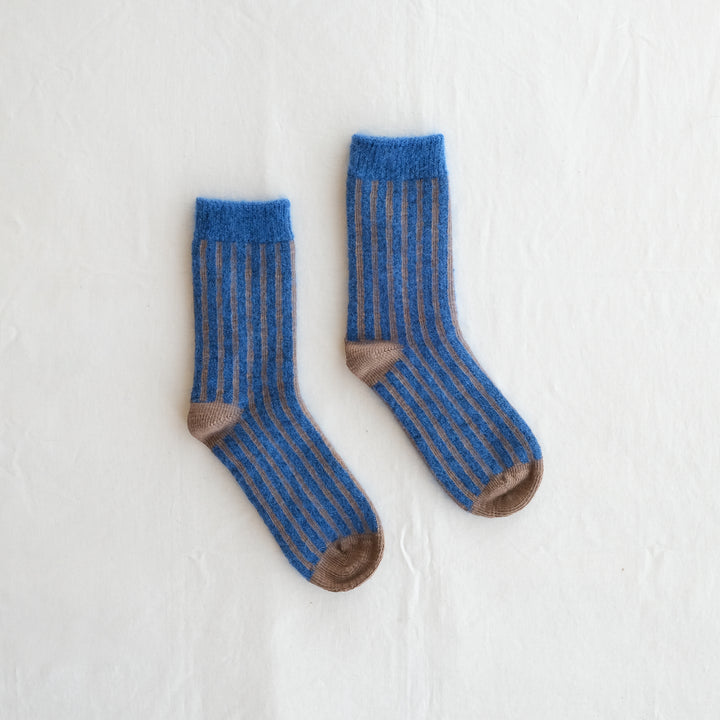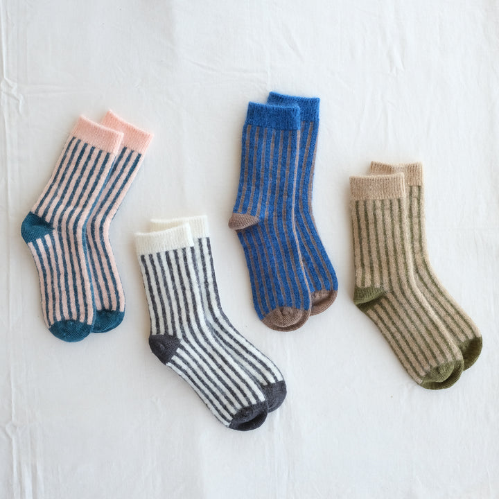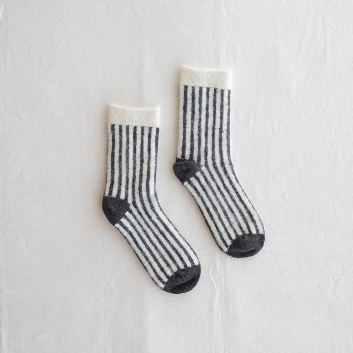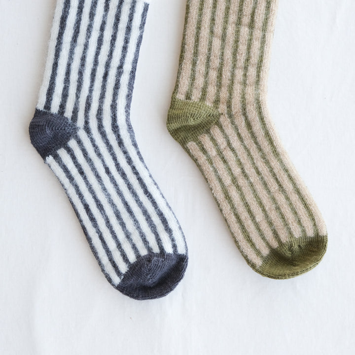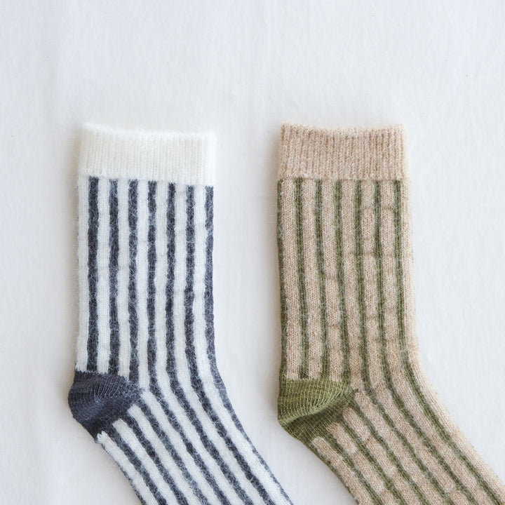 モヘアとオーガニックコットンで編み立てたストライプ柄のローゲージソックス。キッドモヘアを使用しているので、ふんわりと軽く優しい肌触りです。ベースと踵、つま先には、太番手のオーガニックコットンを使用しています。しっかりとした厚みのあるあたたかな1足です。