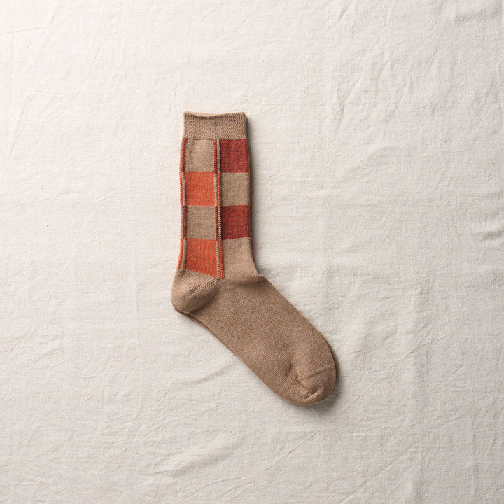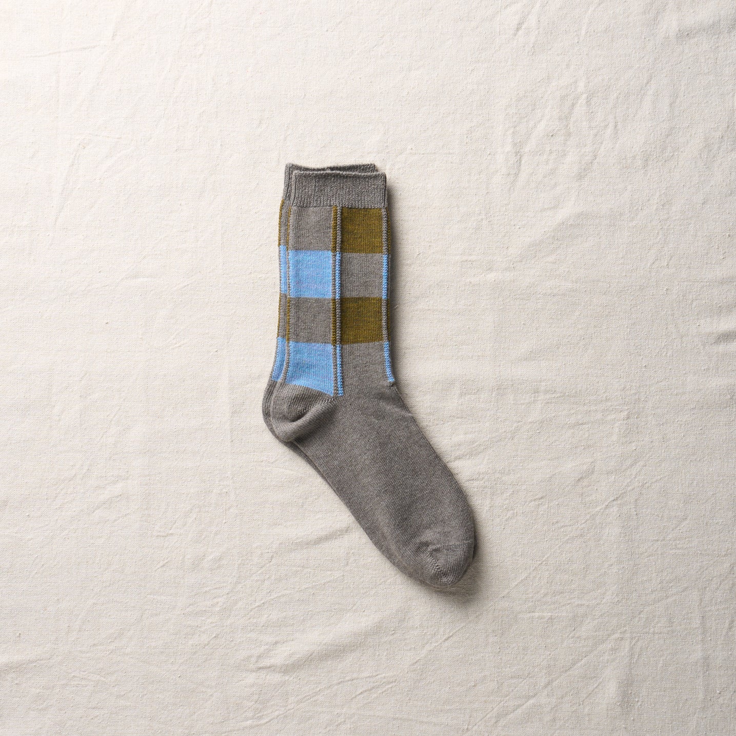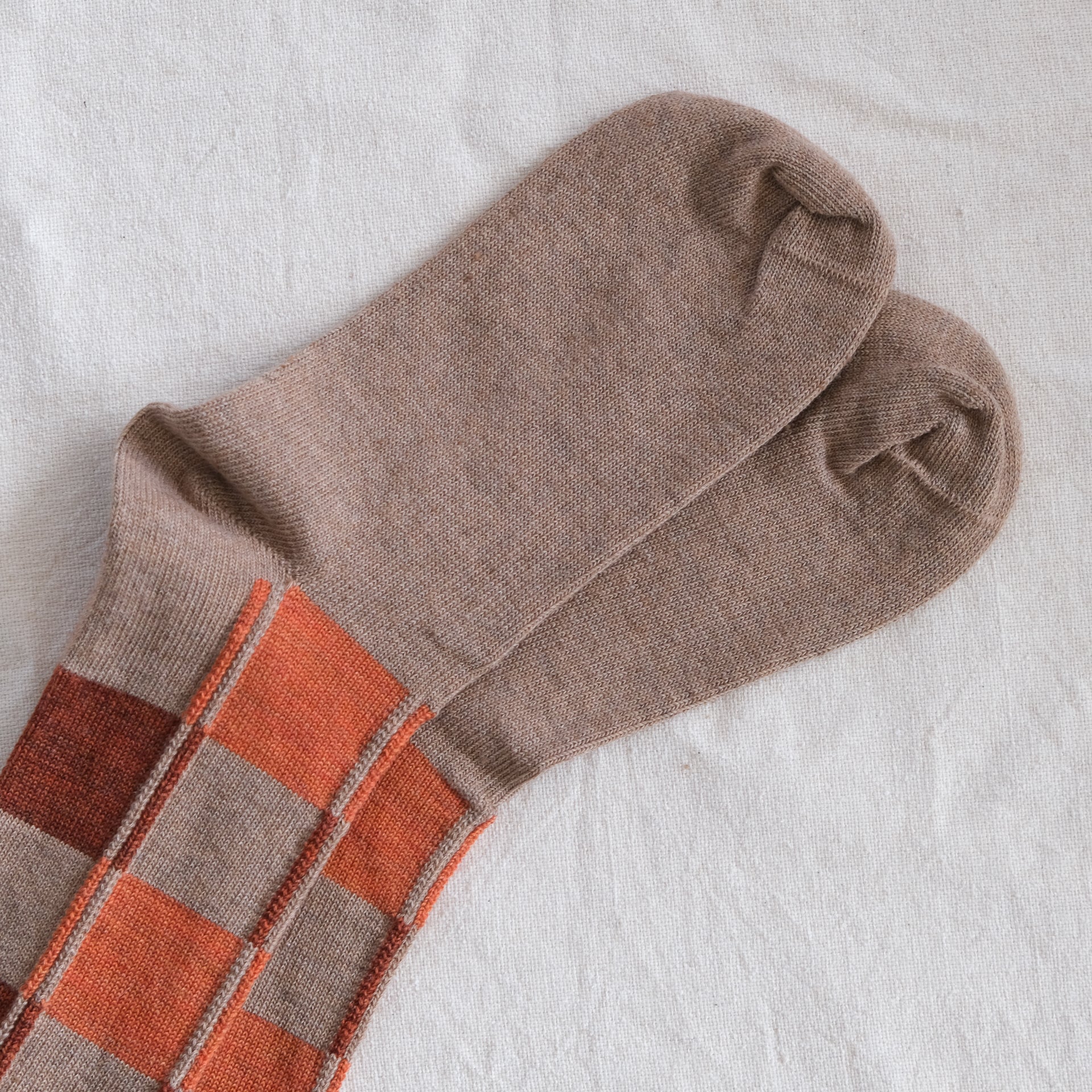 ヤクとオーガニックコットンをベースに、Xマシーンでブロック柄を編み立てたソックス。ヤクとカラードコットンがブレンドされた自然のままの色合いをベースに、柄には梳毛のウールを使用。爪先の縫い目はリンキング仕様です。保温性・吸放湿性に優れたヤクの毛は、温かさに加えて、蒸れない快適さがあります。秋冬シーズン以外でも一年を通して履いていただけます。