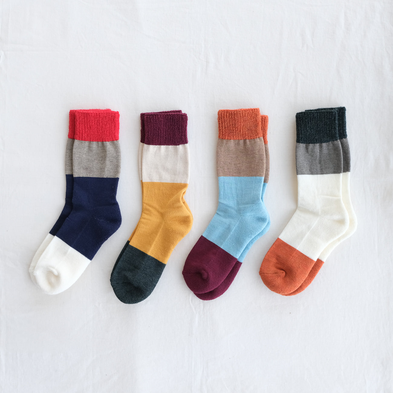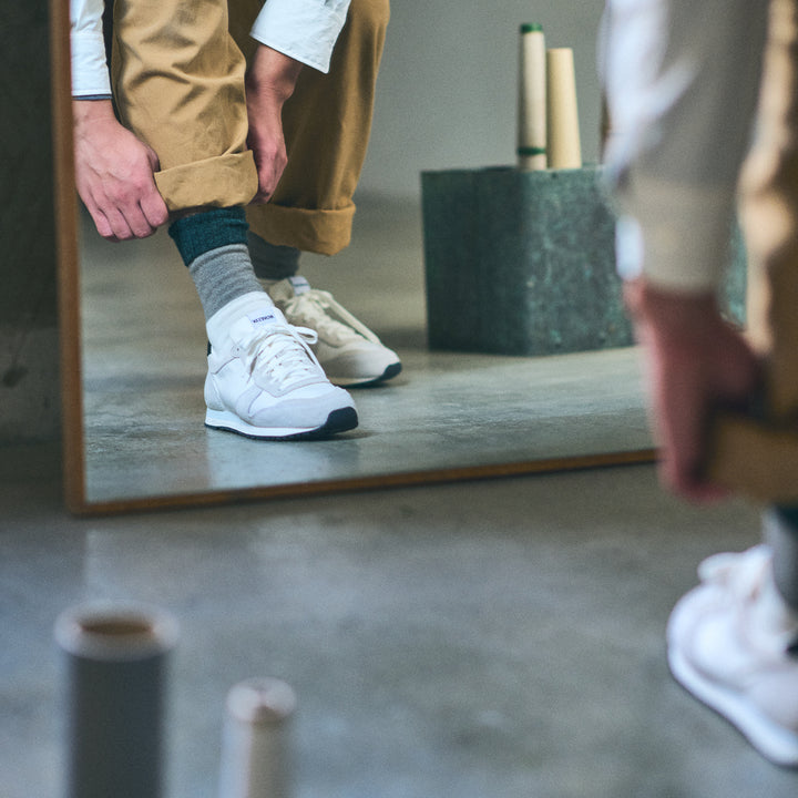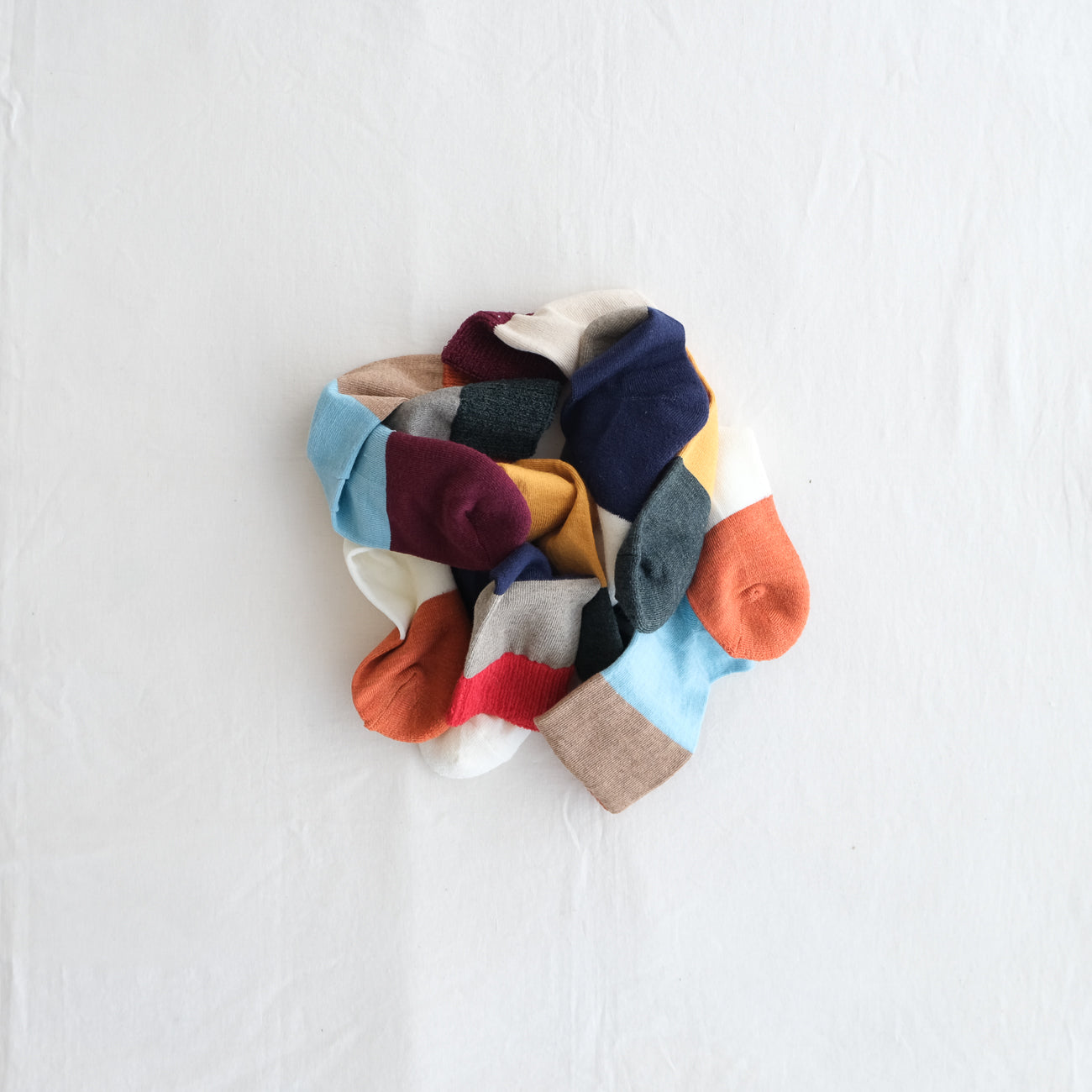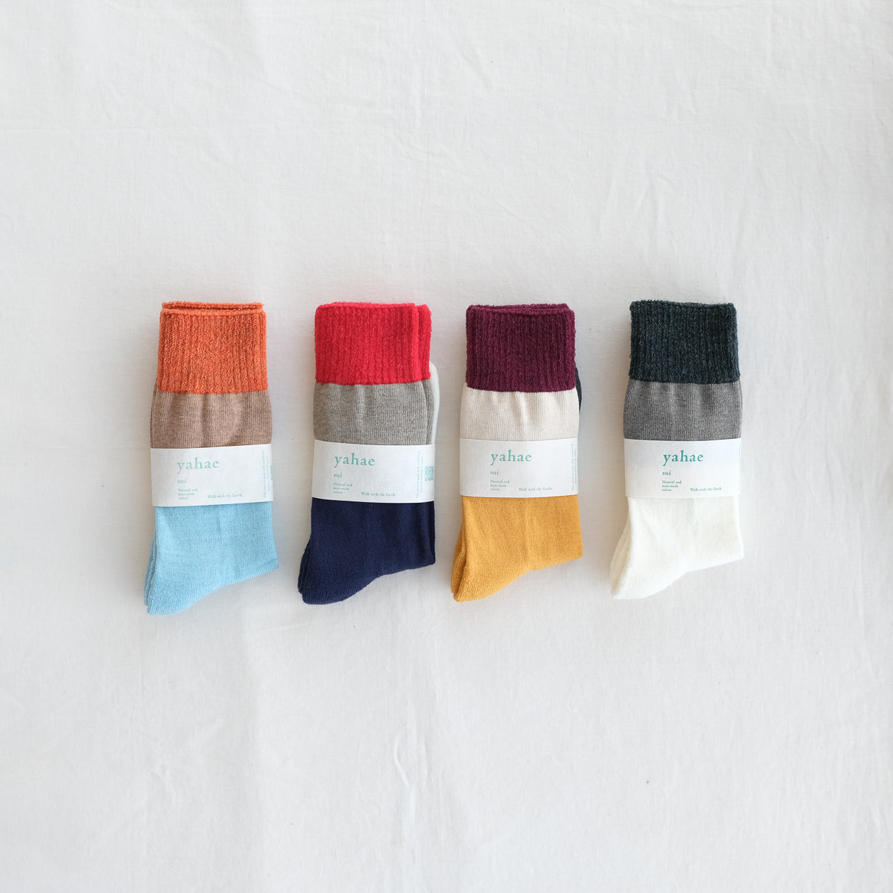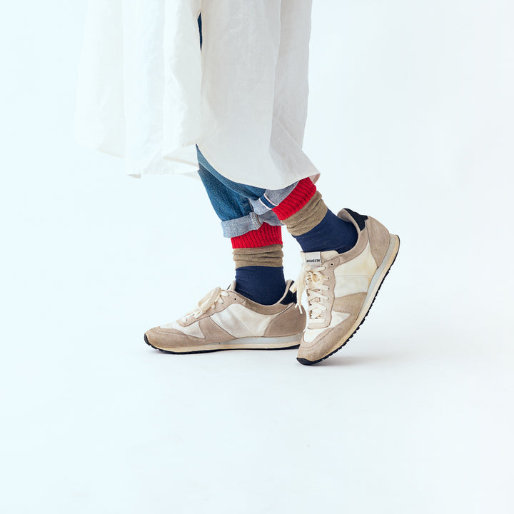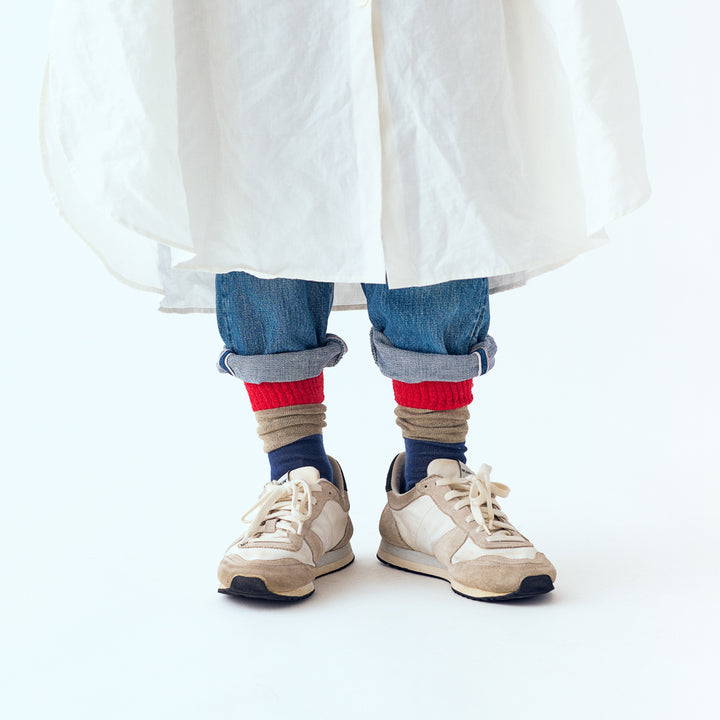 滑らかで肌触りの良い梳毛のウールで編み立てたパイルソックス。足底はパイル編みでクッション性を持たせ、甲側は靴の中で圧迫感が少ない平編みを用いました。履き口はあたたかみのある編み方で変化を付けています。配色の一部には、ヤクとカラードコットンがブレンドされた自然のままの色合いを使用しています。