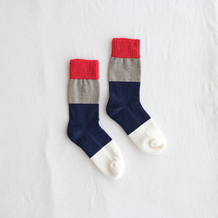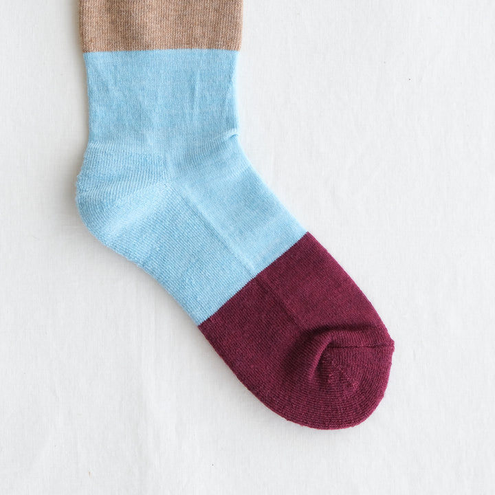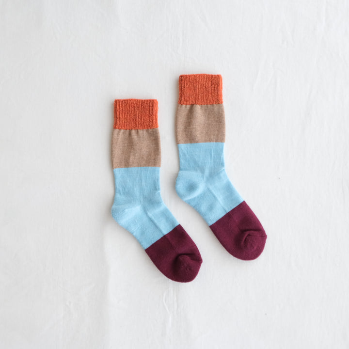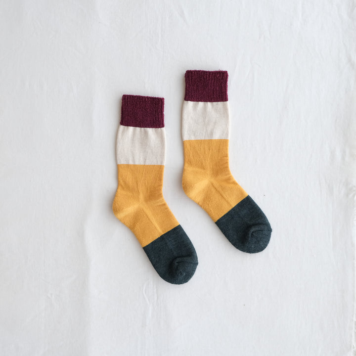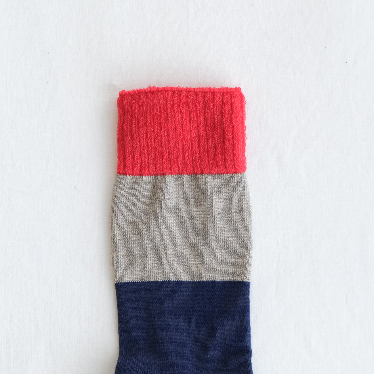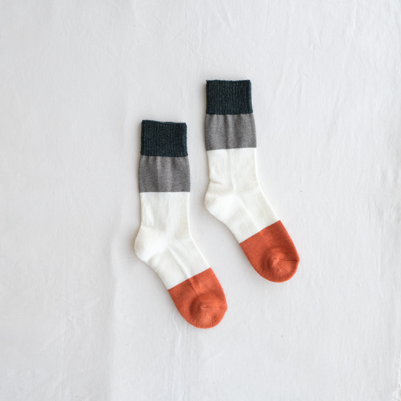 滑らかで肌触りの良い梳毛のウールで編み立てたパイルソックス。足底はパイル編みでクッション性を持たせ、甲側は靴の中で圧迫感が少ない平編みを用いました。履き口はあたたかみのある編み方で変化を付けています。配色の一部には、ヤクとカラードコットンがブレンドされた自然のままの色合いを使用しています。