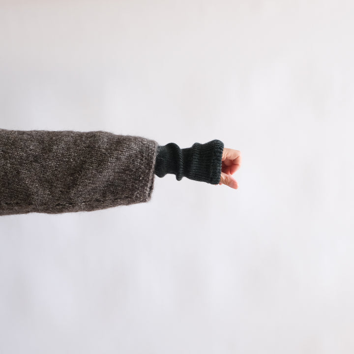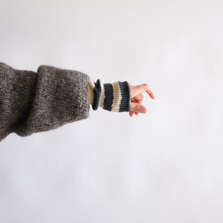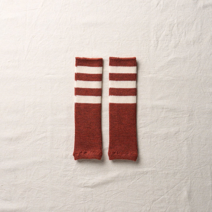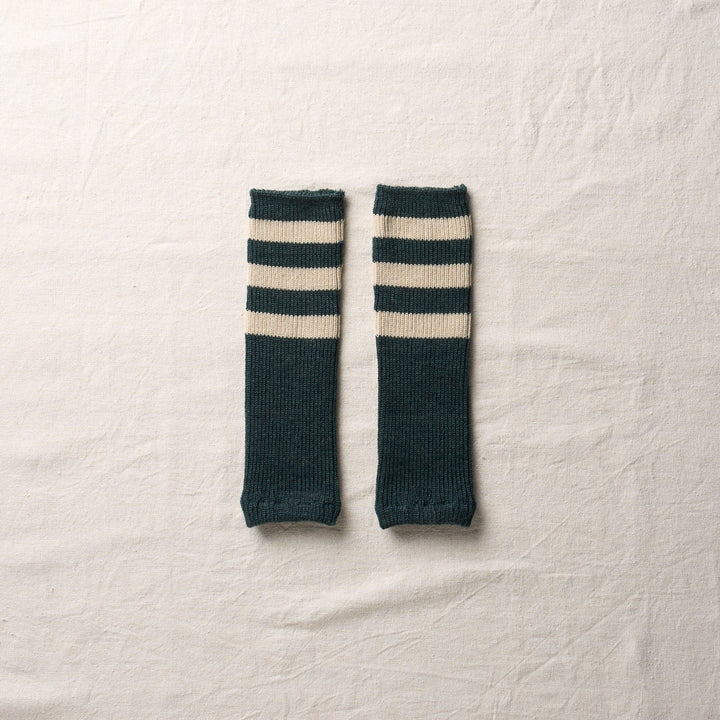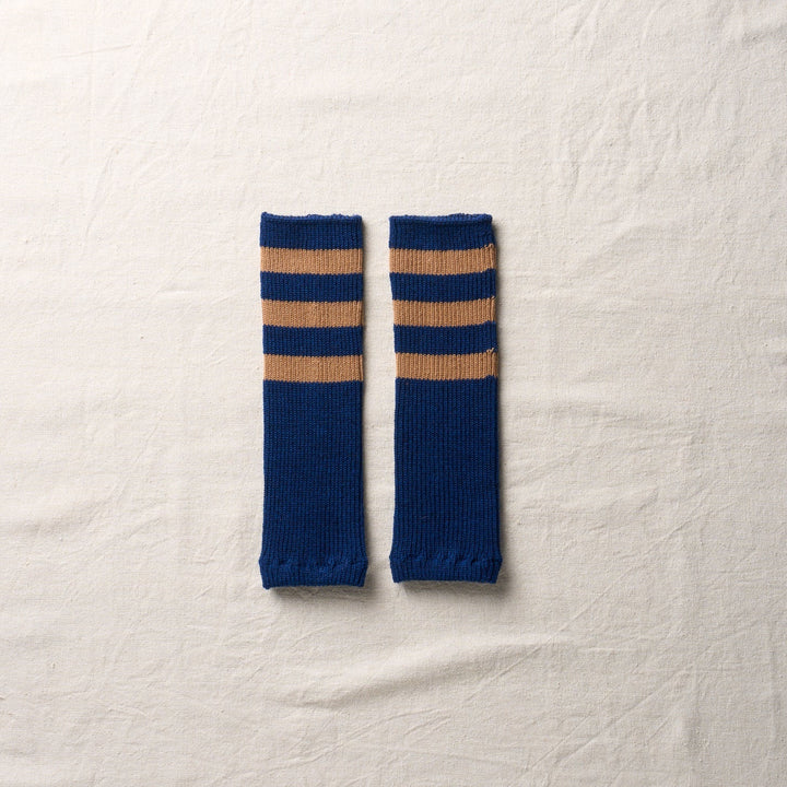 滑らかで肌触りの良い梳毛のウールで編み立てたアーム・レッグ兼用のウォーマー。ボーダーの配色にはオーガニックカラードコットンを使用しています。コットンの原色、そのままの色です。