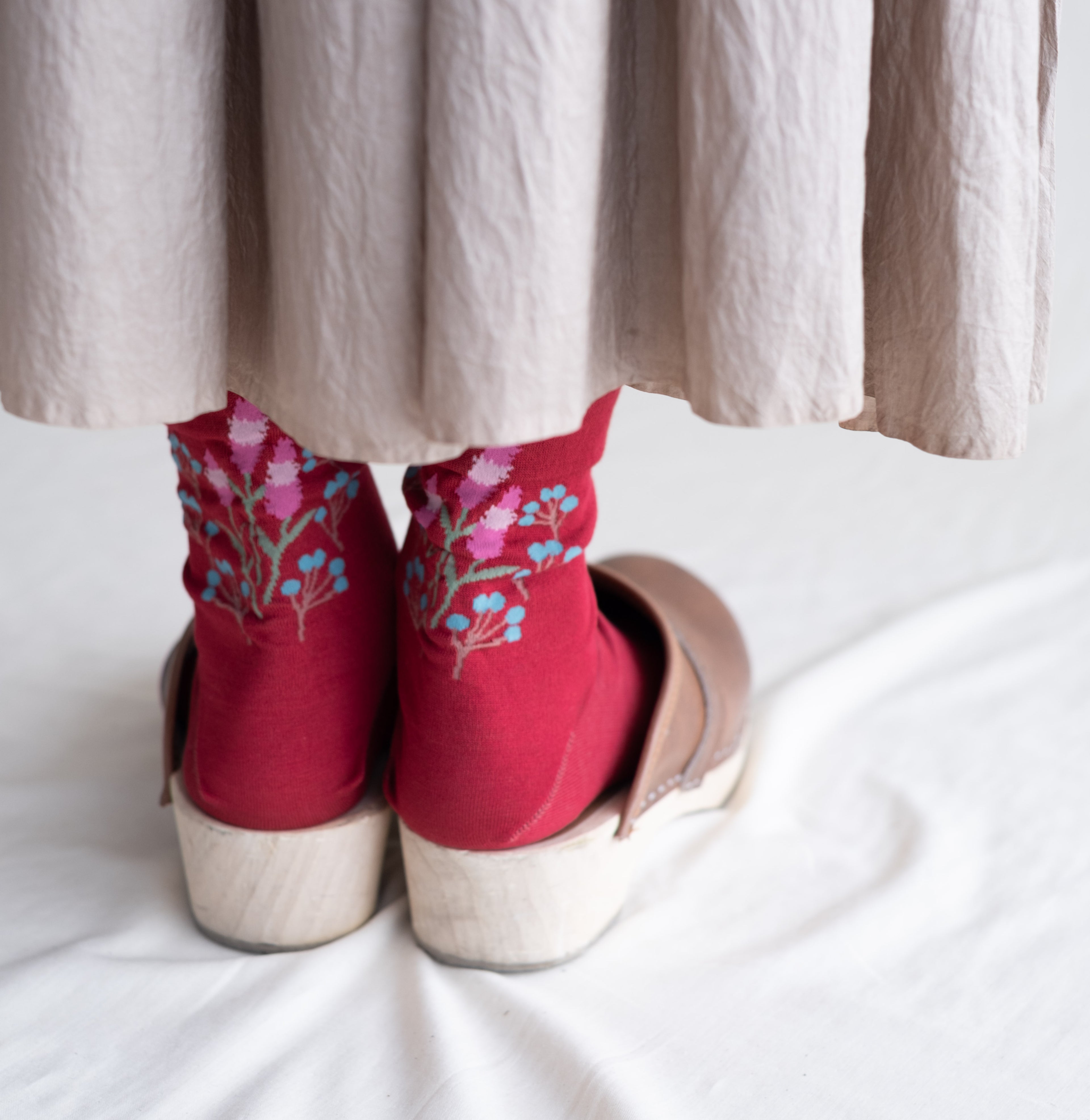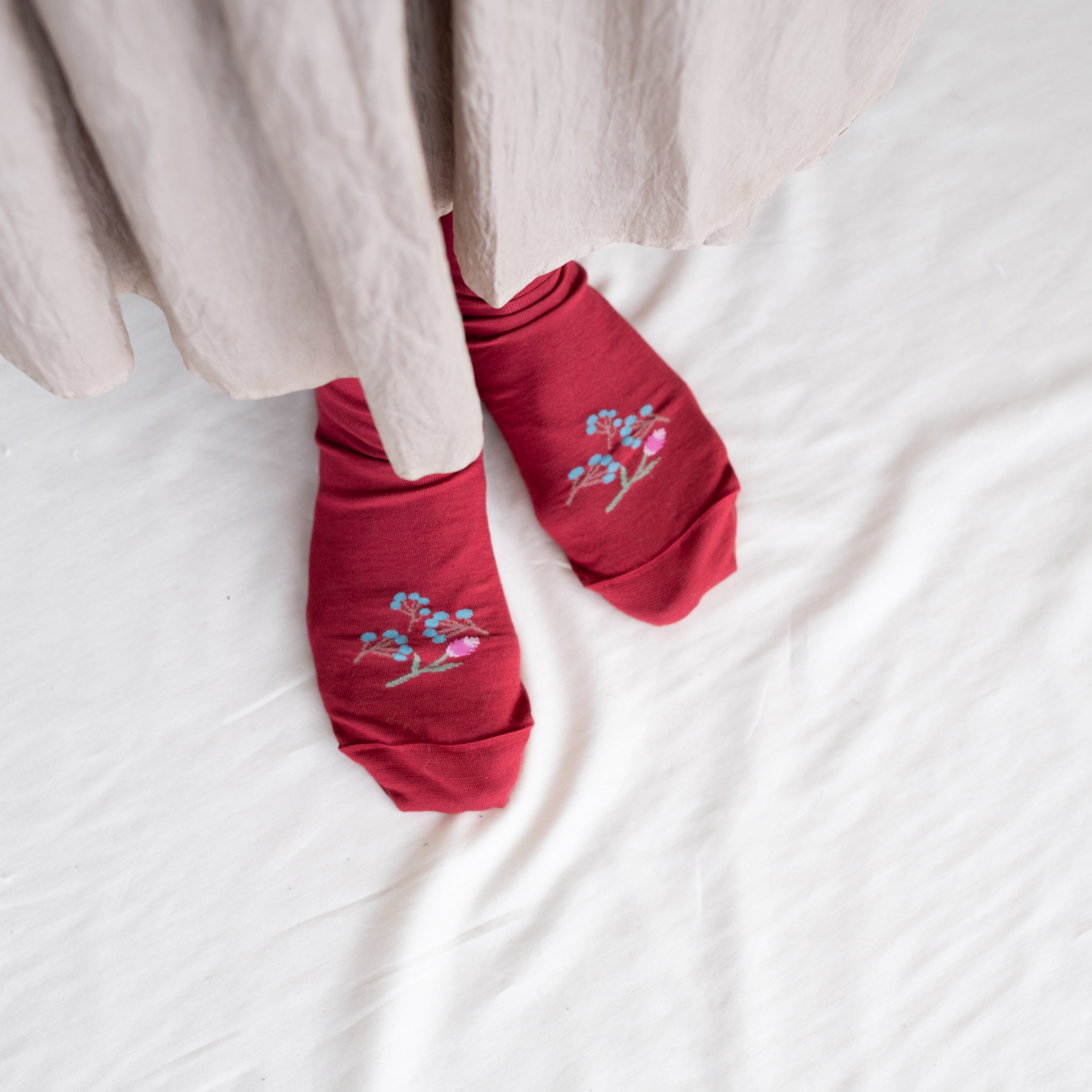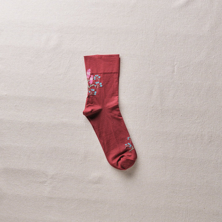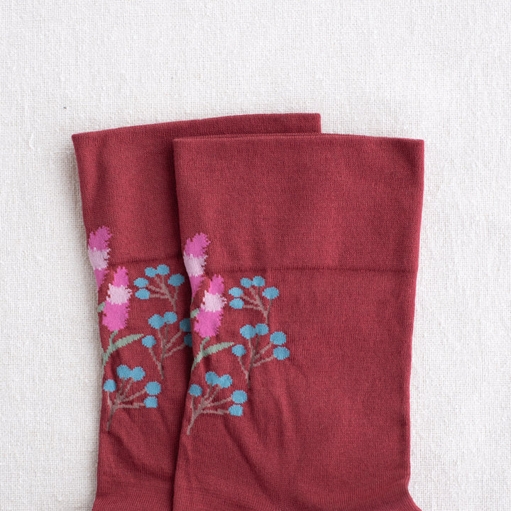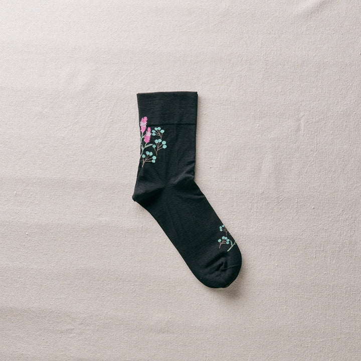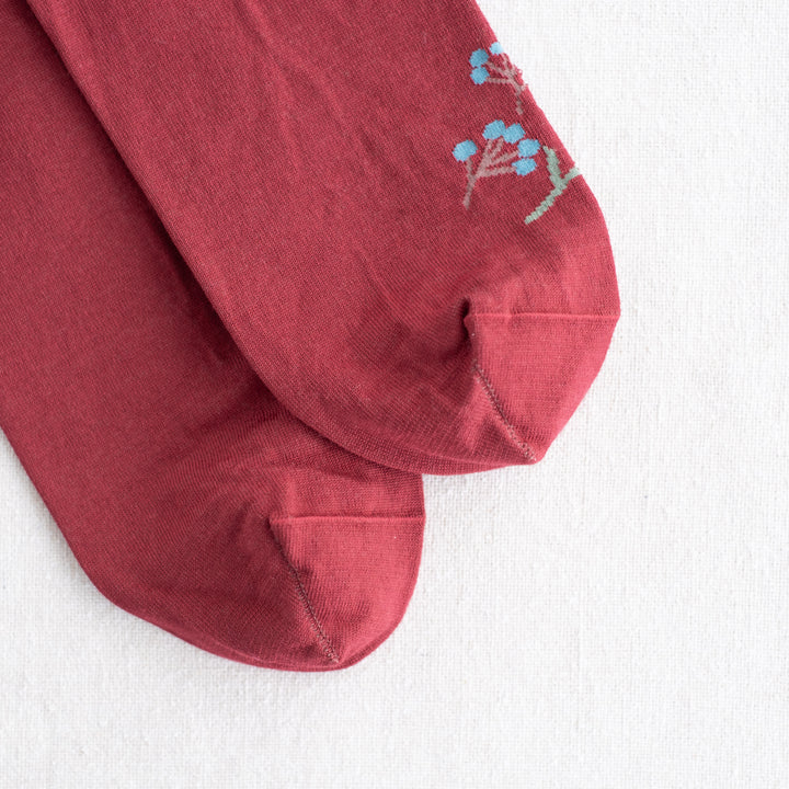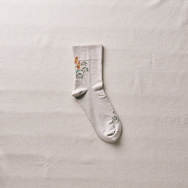 自然な光沢のある細番手のオーガニック超長綿を使用した、薄手の花柄ソックス。履き口はゴムなし仕様です。野に咲くノゲイトウと草の実を描いています。「おしゃれ」を花言葉に持つケイトウ、秋に楽しみたい一足です。