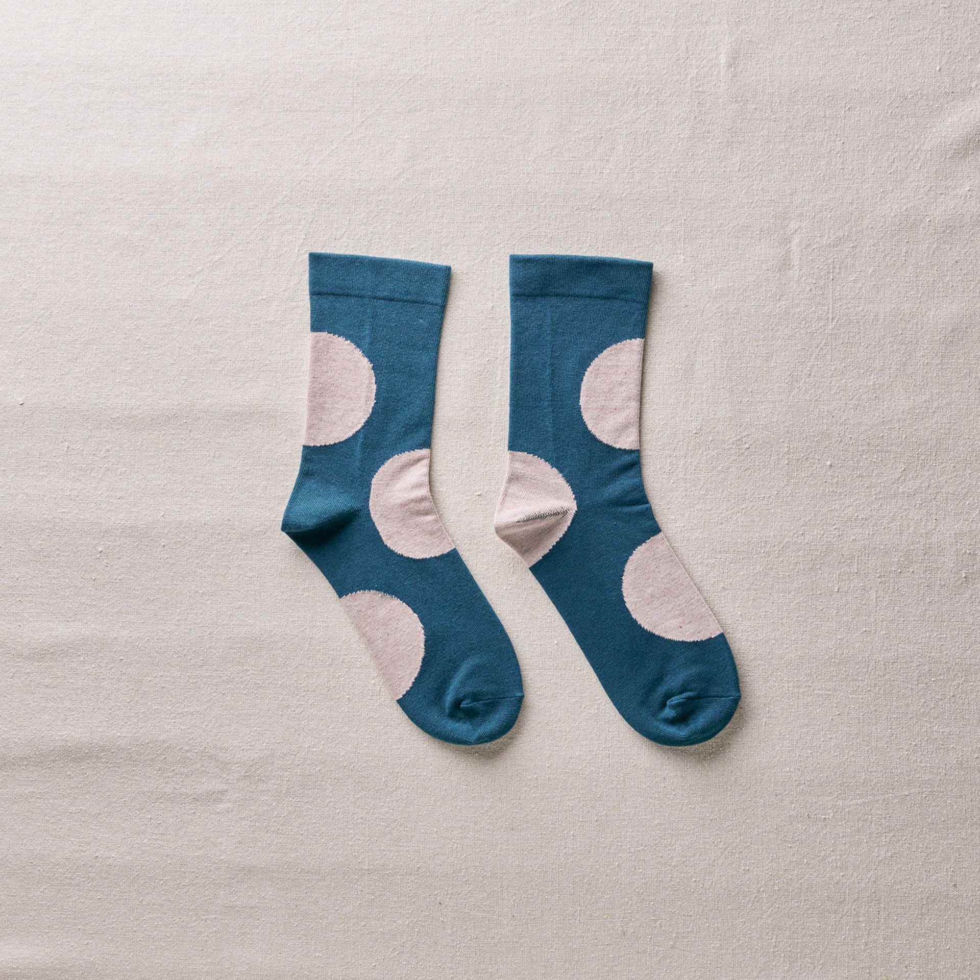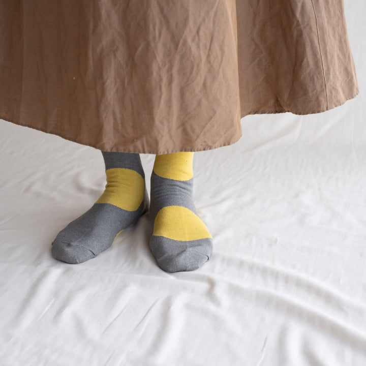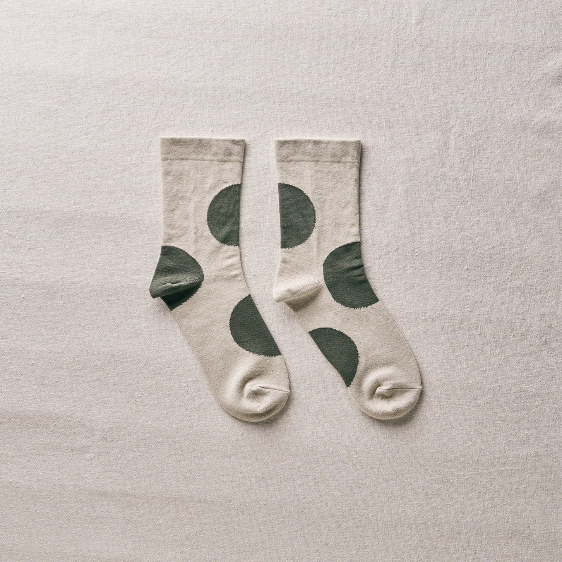 オーガニックコットンで編み立てた大きなドットが印象的なミドルゲージソックス。履き口はゴムなしです。両足の左右それぞれでドットの位置を変えたアシンメトリー柄なのでいろいろな角度からドットを楽しめます。