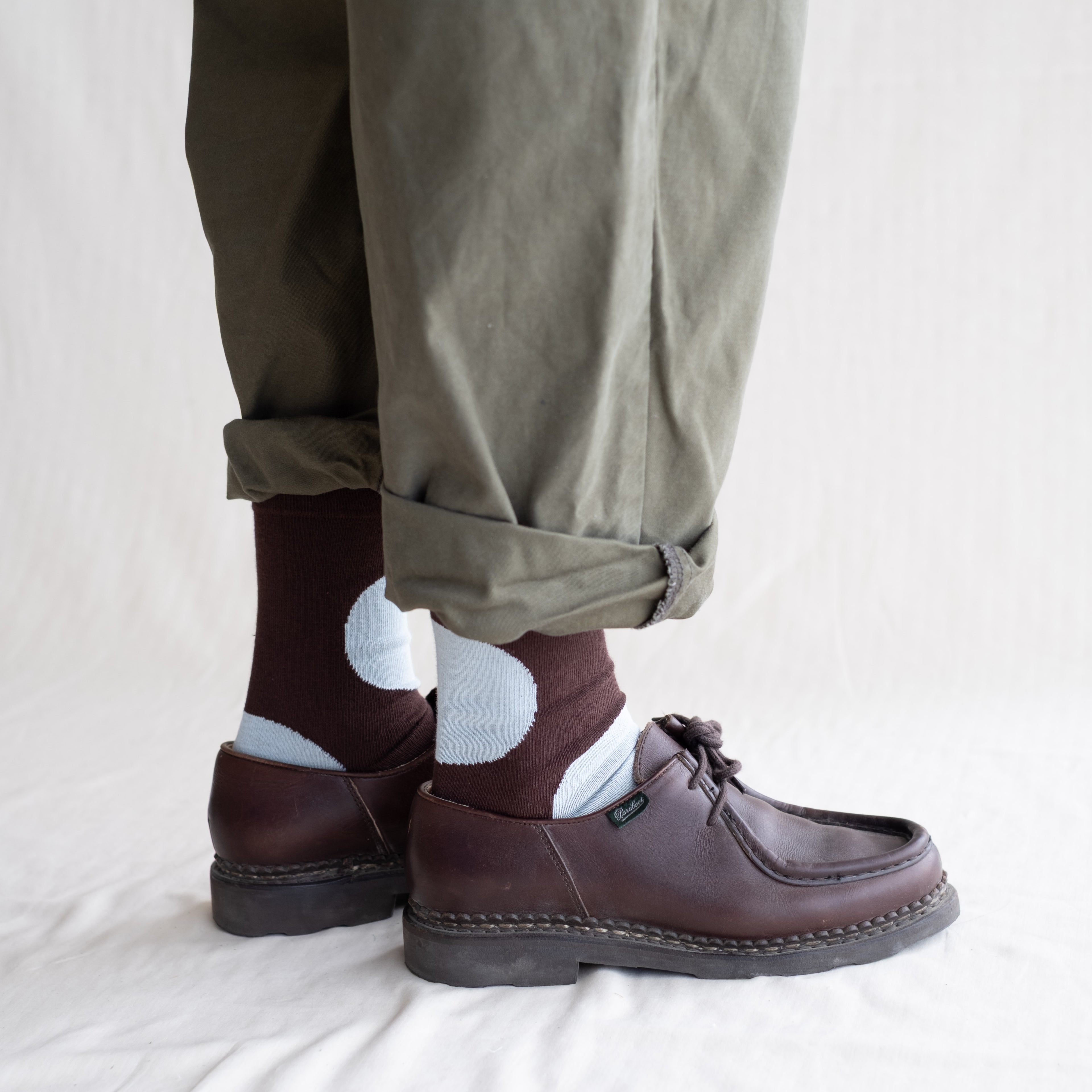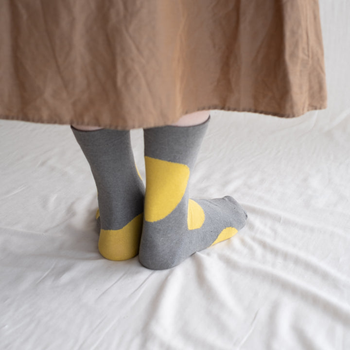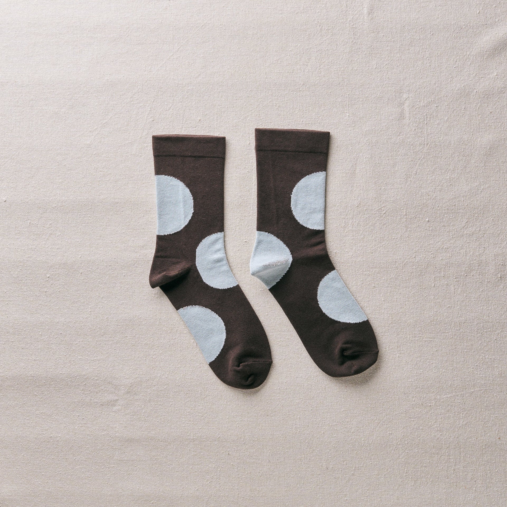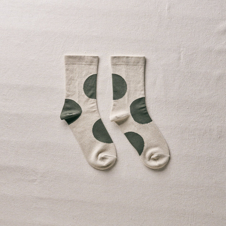 オーガニックコットンで編み立てた大きなドットが印象的なミドルゲージソックス。履き口はゴムなしです。両足の左右それぞれでドットの位置を変えたアシンメトリー柄なのでいろいろな角度からドットを楽しめます。