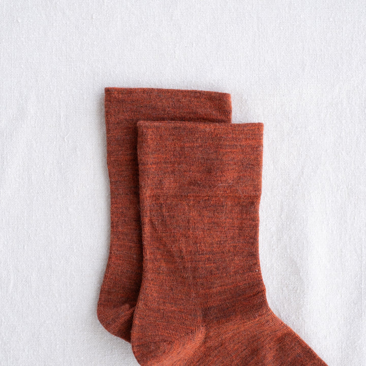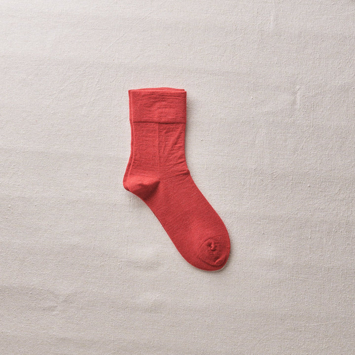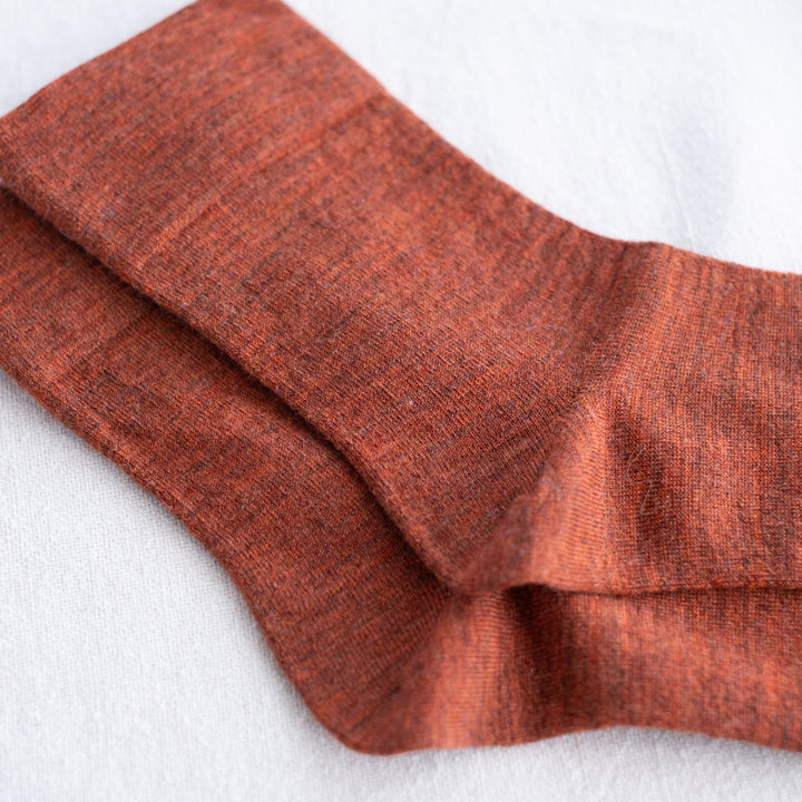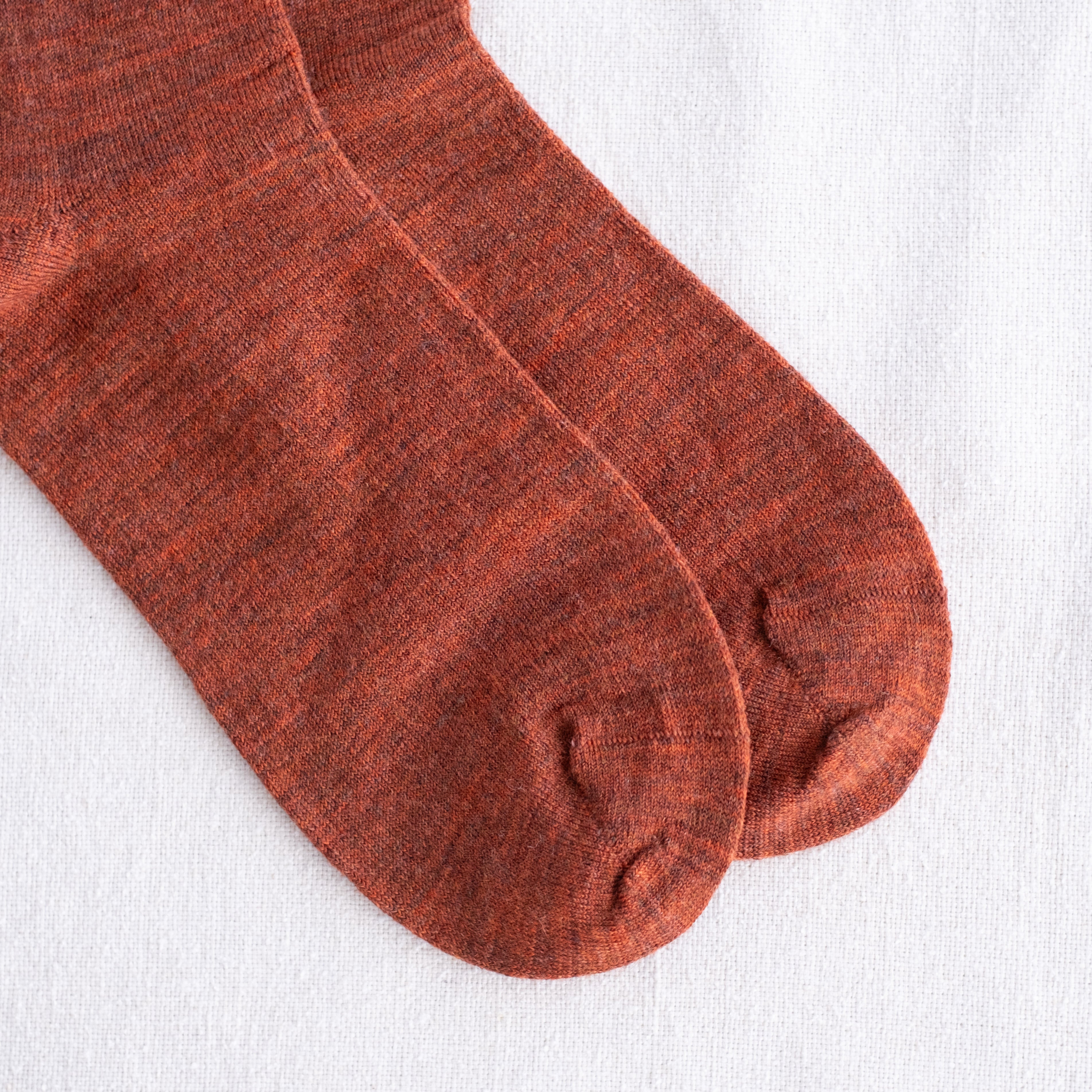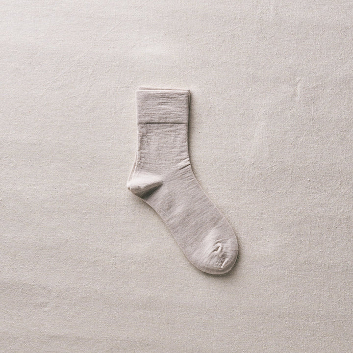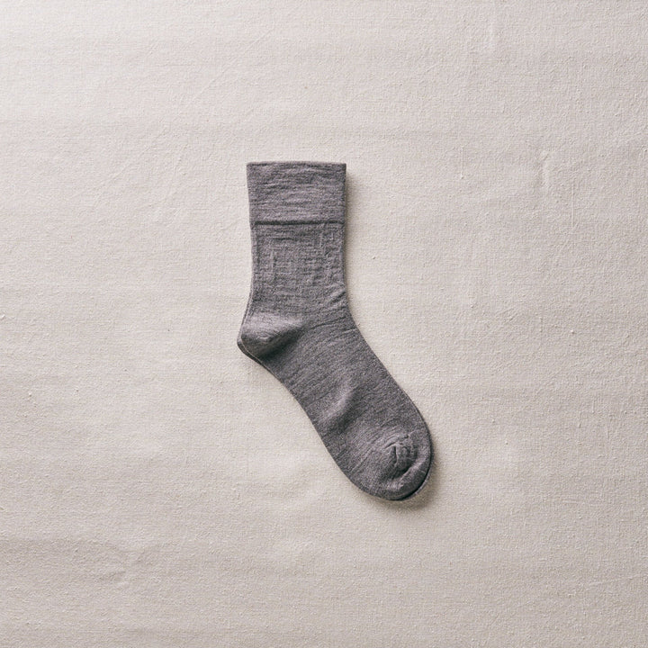 滑らかで肌触りの良い梳毛ウールを使用し、薄手に編み立てたゴムなしソックス。締め付け感がなく、足に優しくフィットします。爪先はリンキング仕様で、縫い目がごろつかず快適な履き心地です。軽やかで柔らかな素材感は、肌に触れるたびに心地よさを実感していただけます。