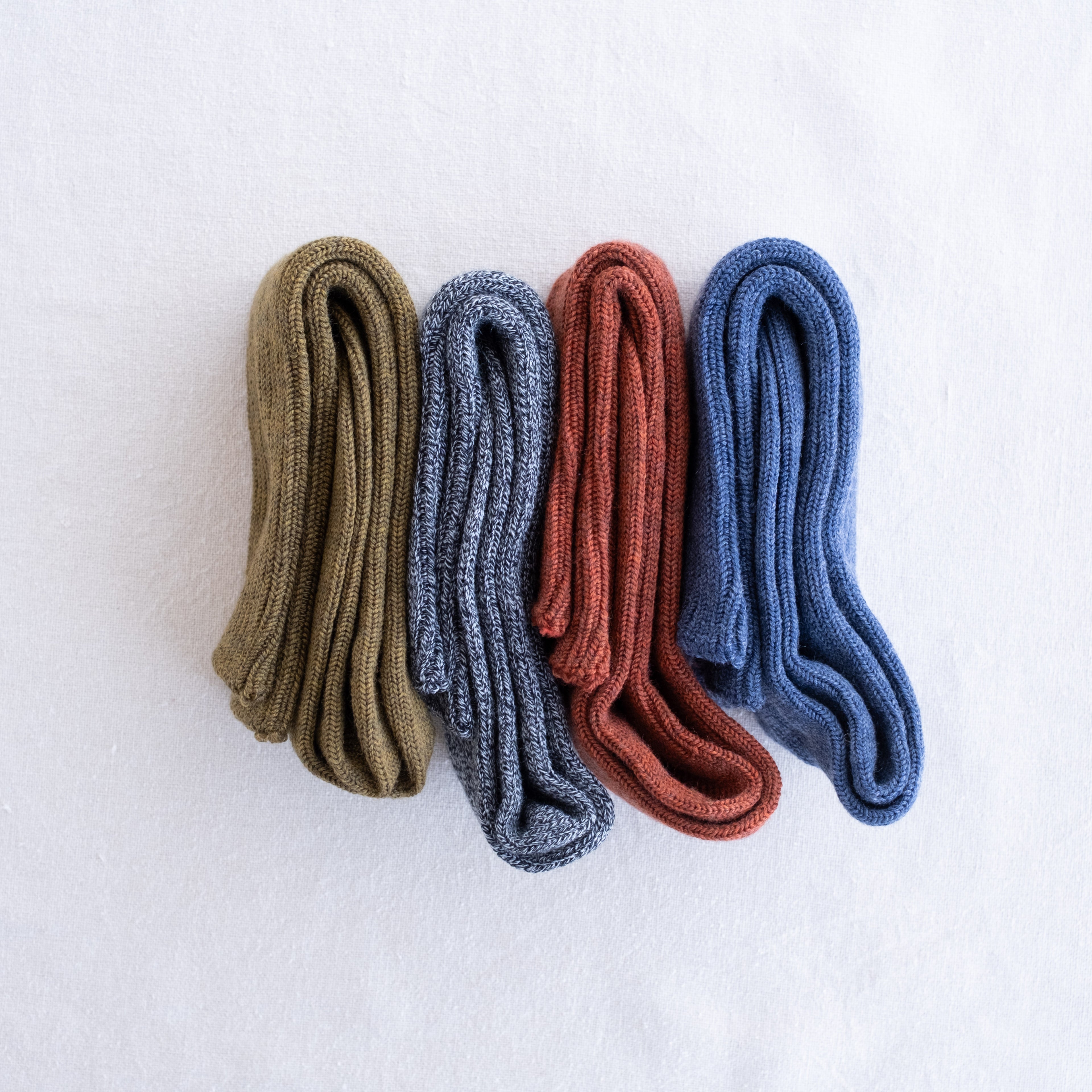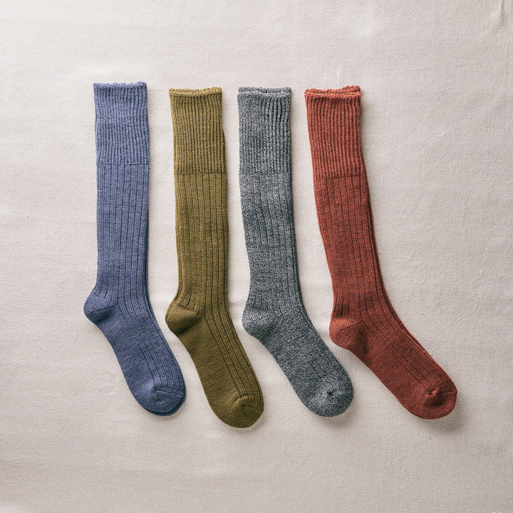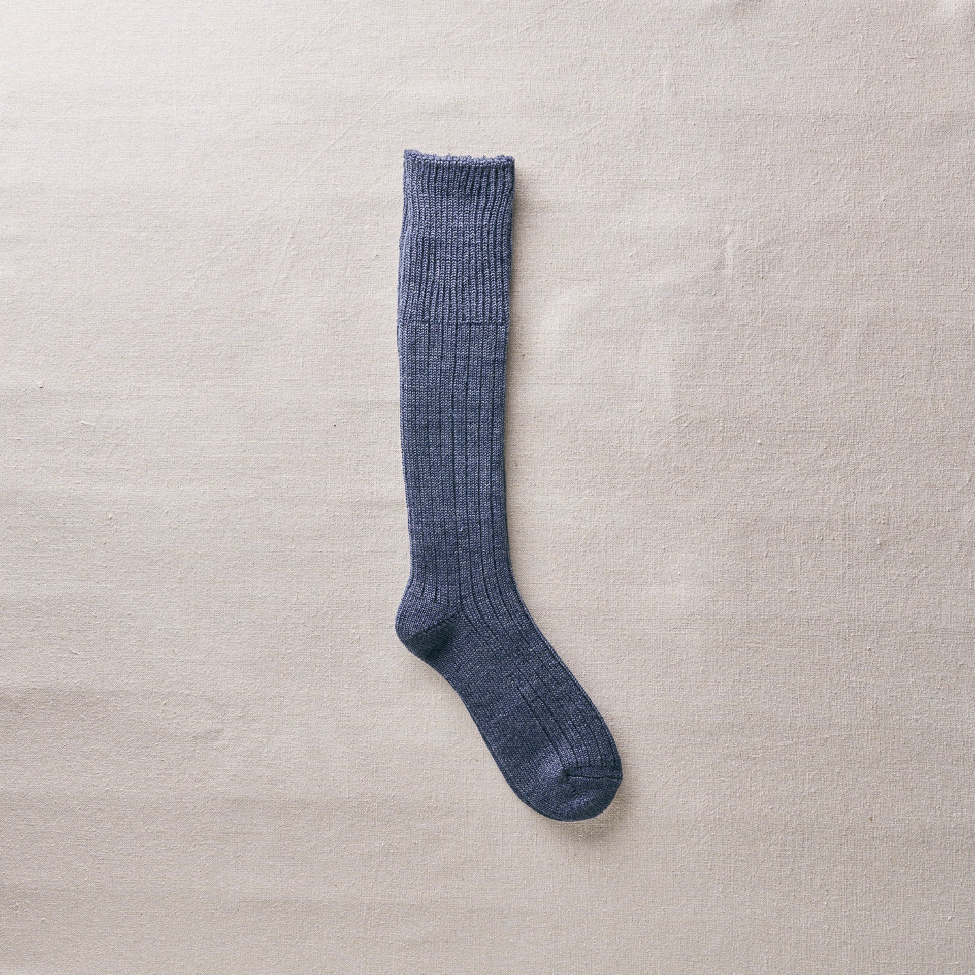 滑らかで肌触りの良い梳毛ウールをざっくりと編み立てたローゲージのハイソックス。旧式の編み機で時間をかけて丁寧に編み立てることで、しっかりとした厚みと温かさを実現しました。リラックス感のある風合いと履き心地が魅力の一足です。