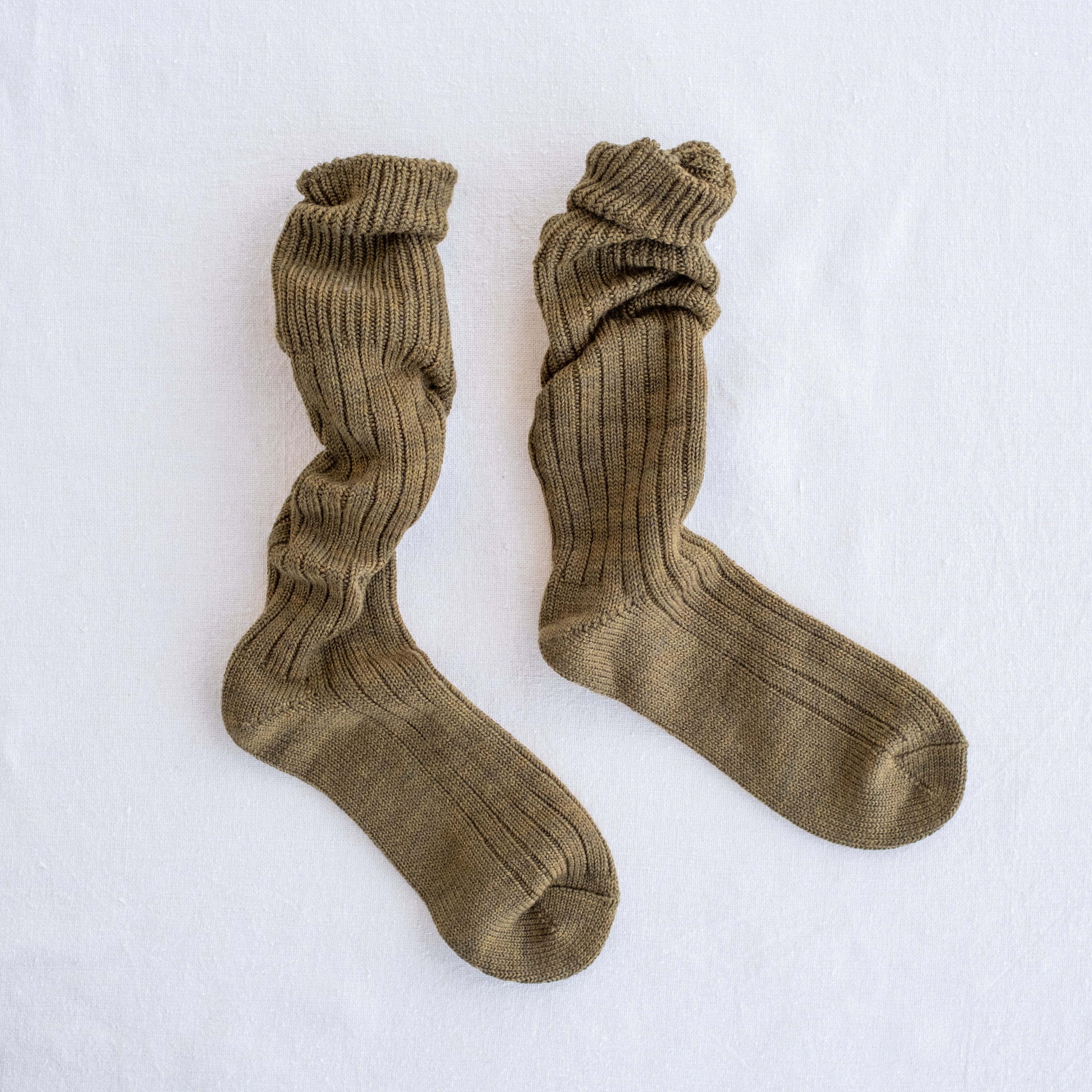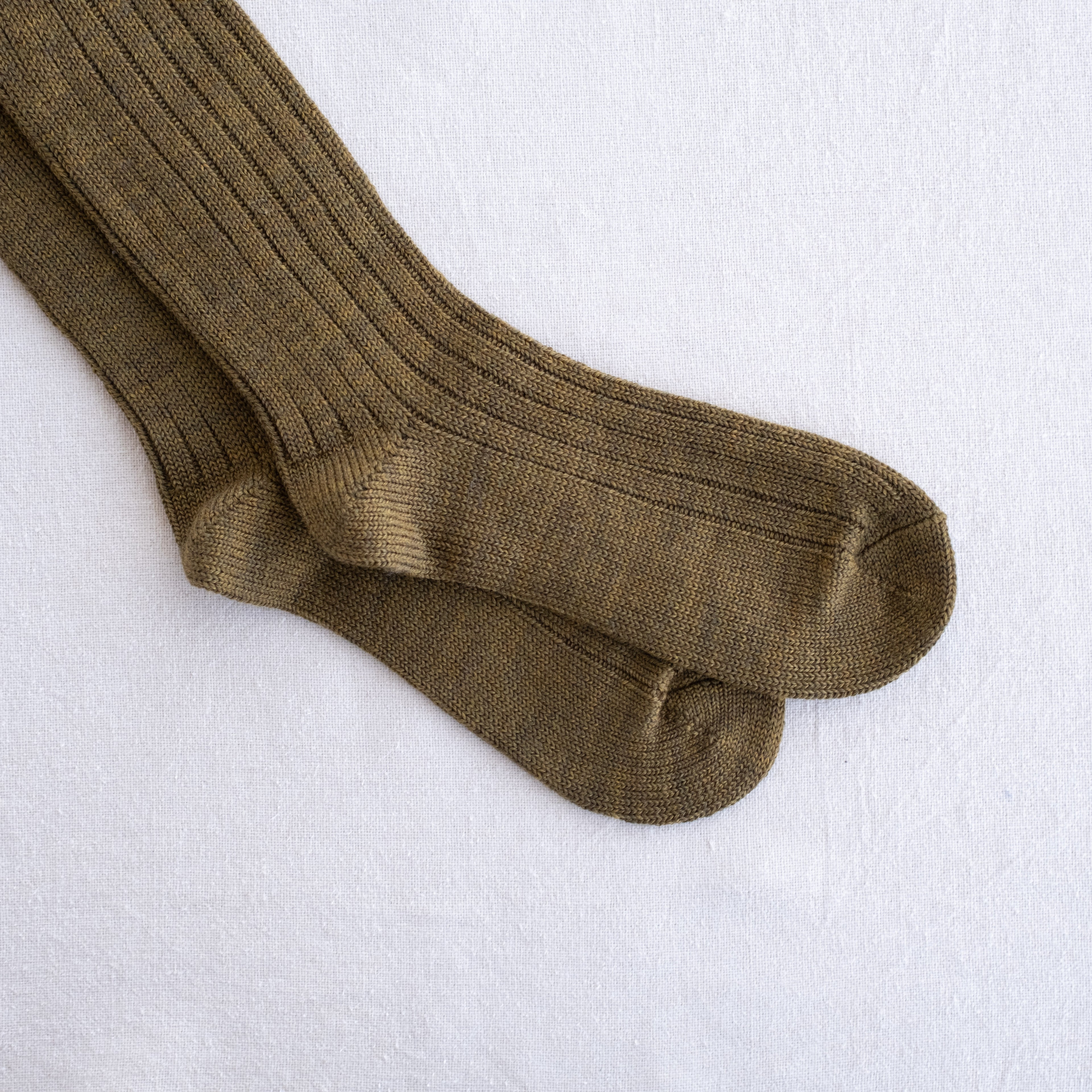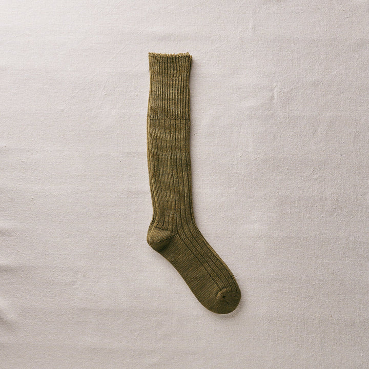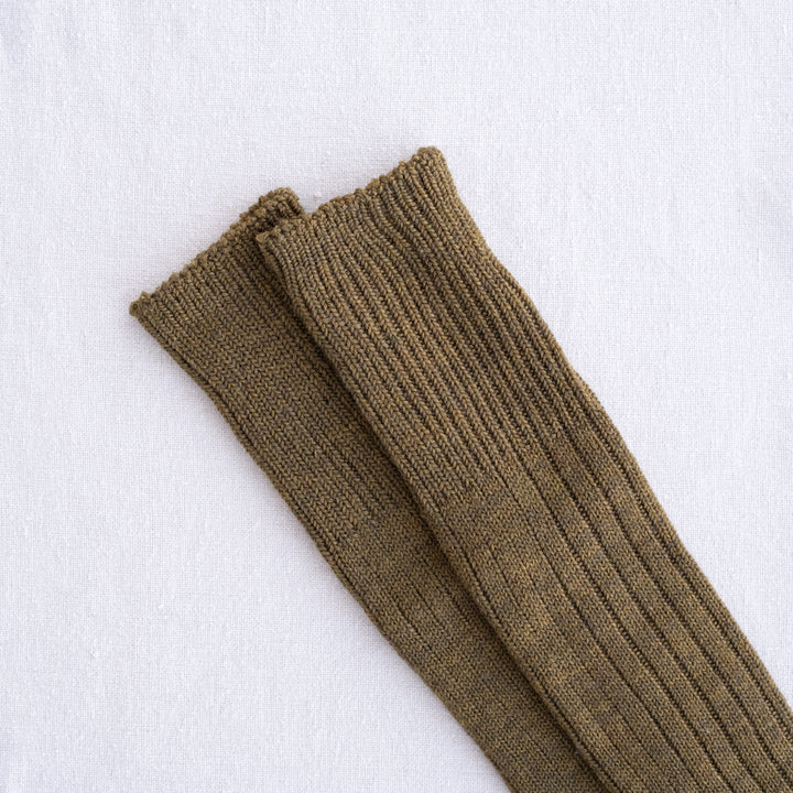 滑らかで肌触りの良い梳毛ウールをざっくりと編み立てたローゲージのハイソックス。旧式の編み機で時間をかけて丁寧に編み立てることで、しっかりとした厚みと温かさを実現しました。リラックス感のある風合いと履き心地が魅力の一足です。