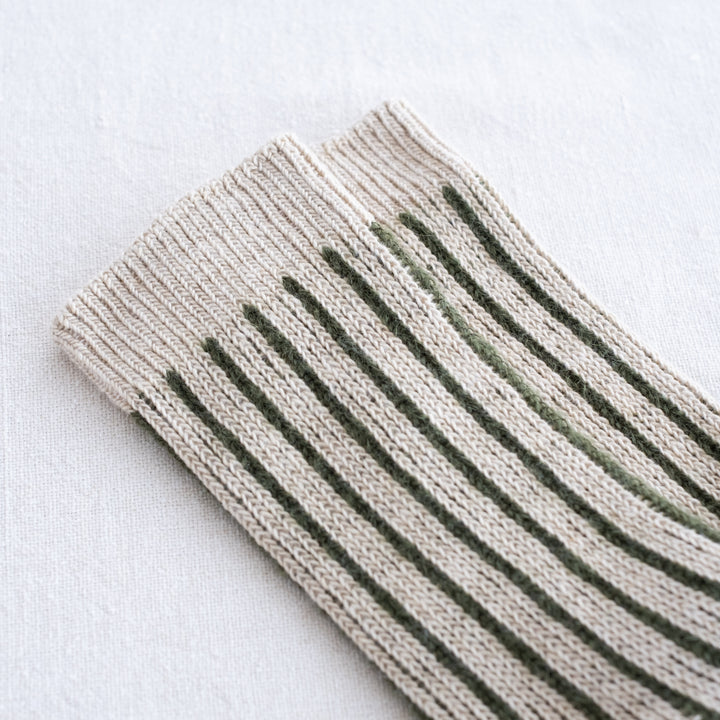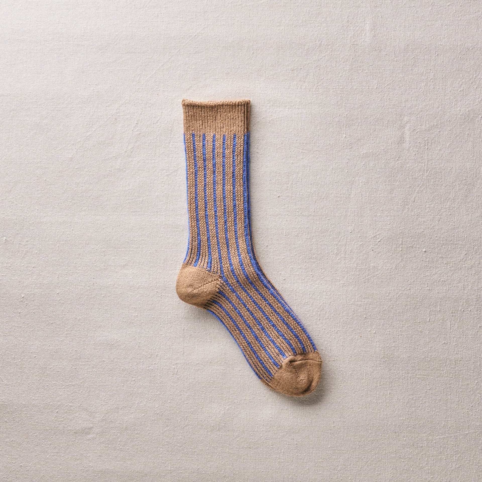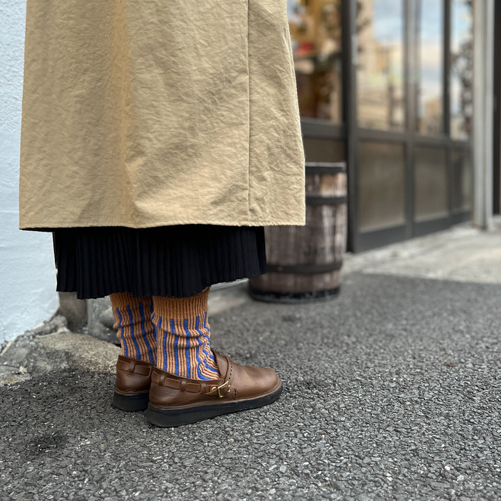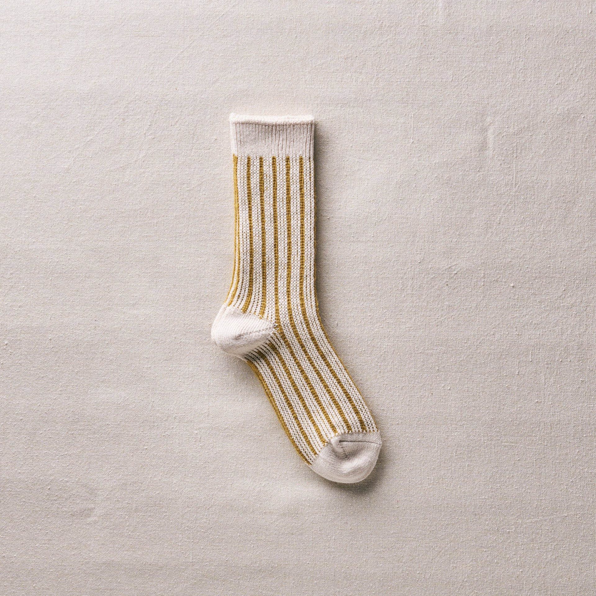 ベースにカラードオーガニックコットンを使用し、ストライプ柄にモヘアをあしらったソックス。ローゲージの編み機でざっくりと編み立てたことで、ナチュラルな風合いと柔らかな履き心地を実現しました。素材の個性が引き立つデザインで、足元にさりげないアクセントを加えます。