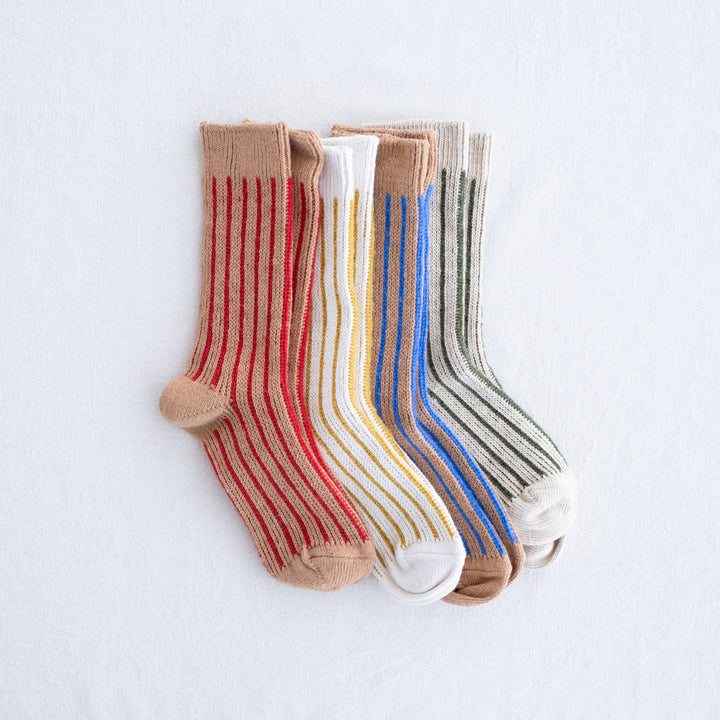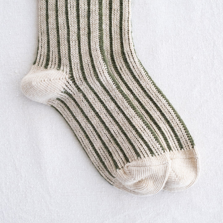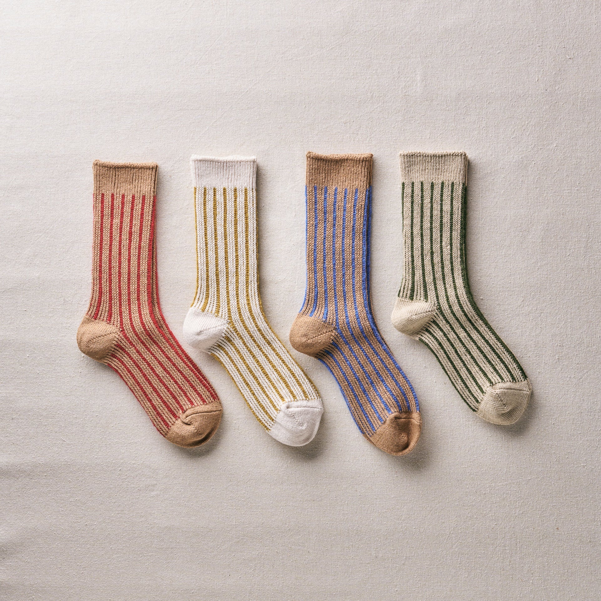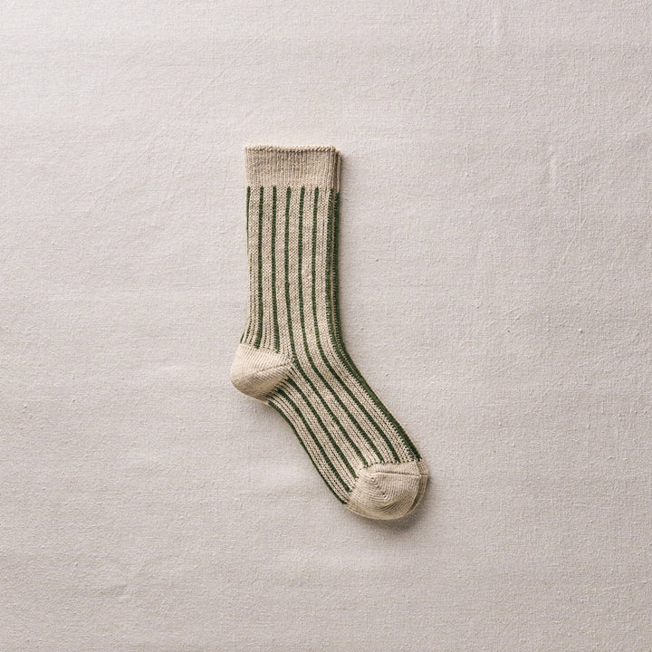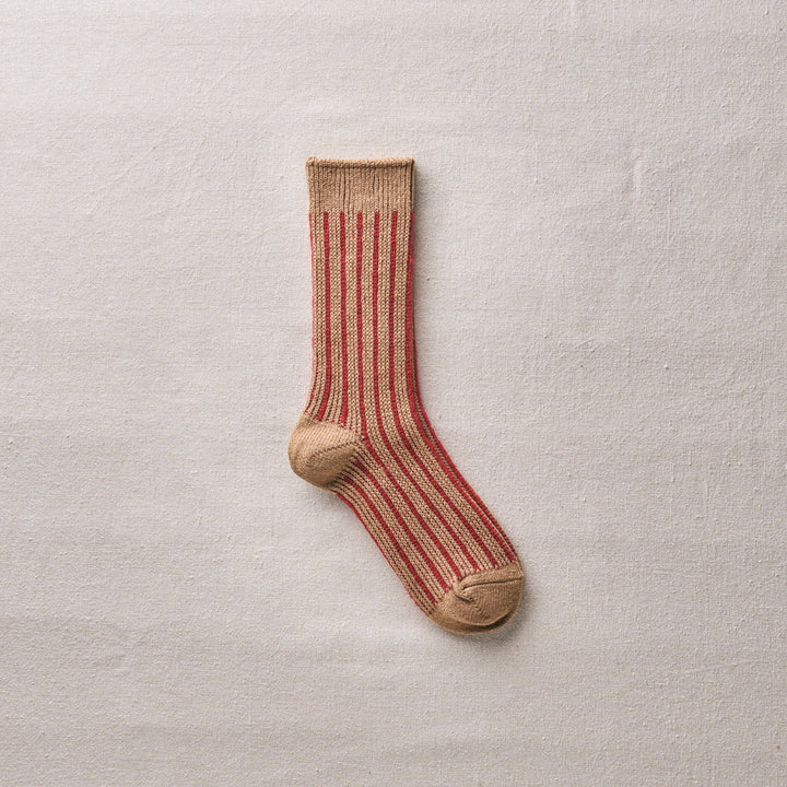 ベースにカラードオーガニックコットンを使用し、ストライプ柄にモヘアをあしらったソックス。ローゲージの編み機でざっくりと編み立てたことで、ナチュラルな風合いと柔らかな履き心地を実現しました。素材の個性が引き立つデザインで、足元にさりげないアクセントを加えます。
