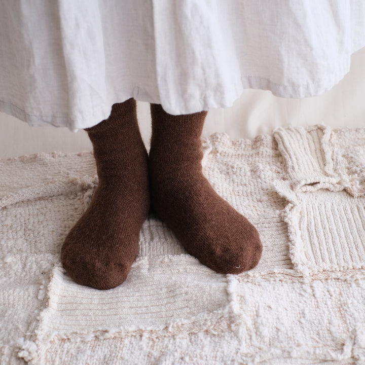 モヘアとウールをたっぷり使用して編み立てた総パイルのソックス。ふんわりとした柔らかな履き心地と優れた保温性で、寒い季節の足元をしっかりと暖かく包み込みます。心地よい厚みと素材感が特徴の一足です。