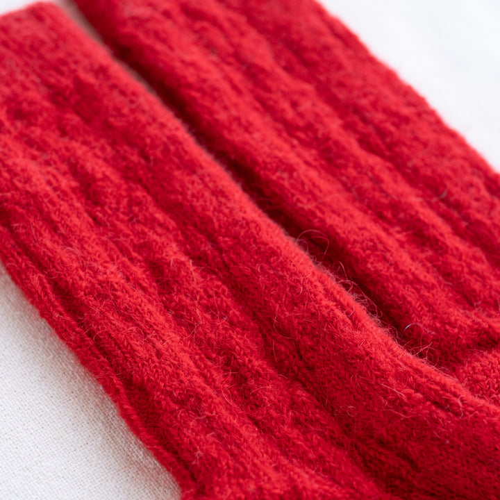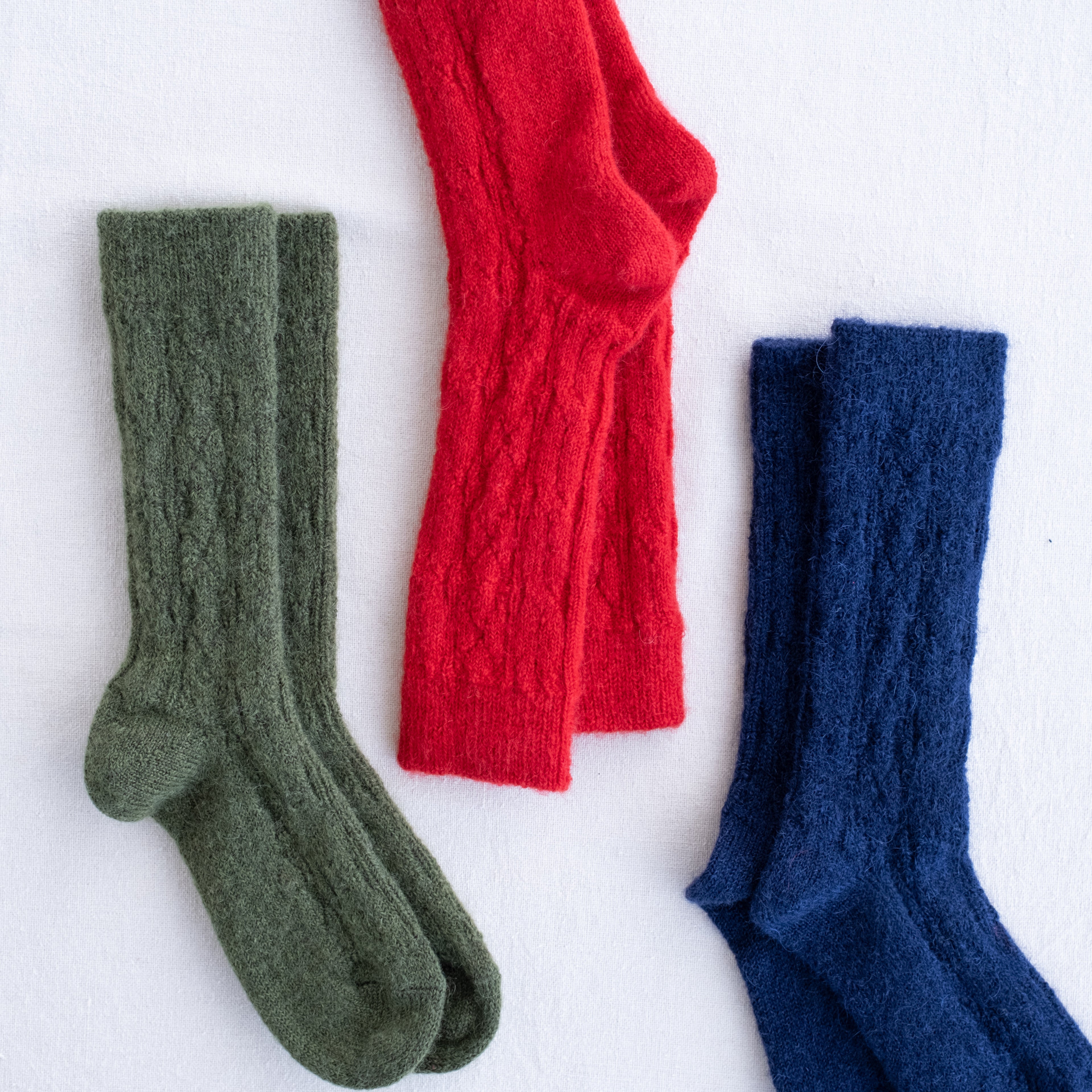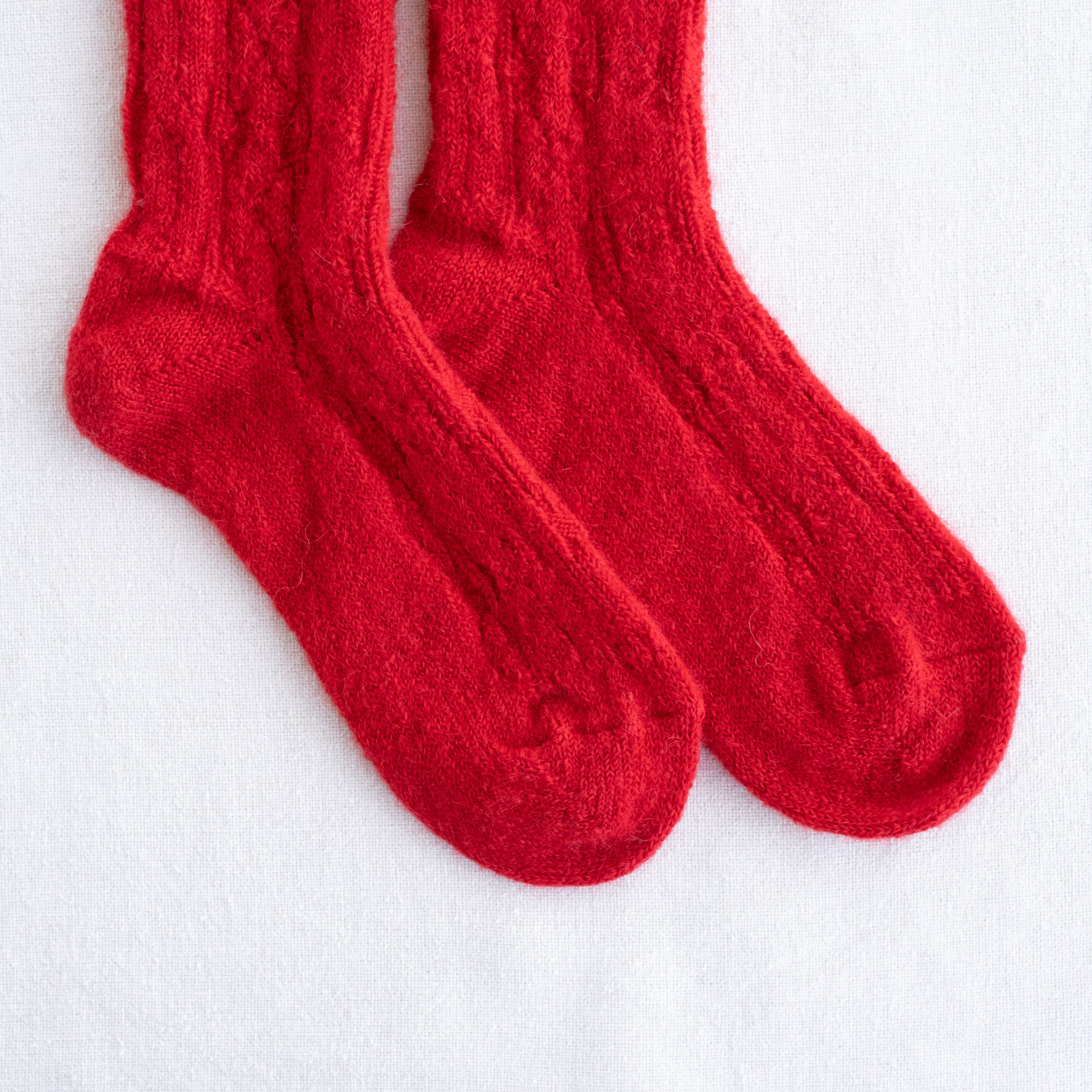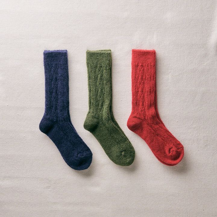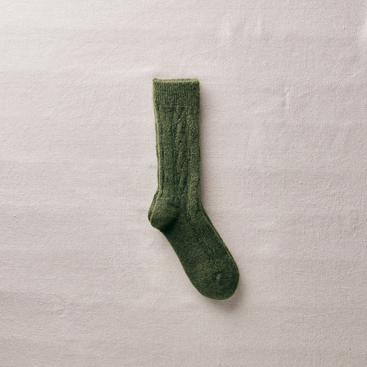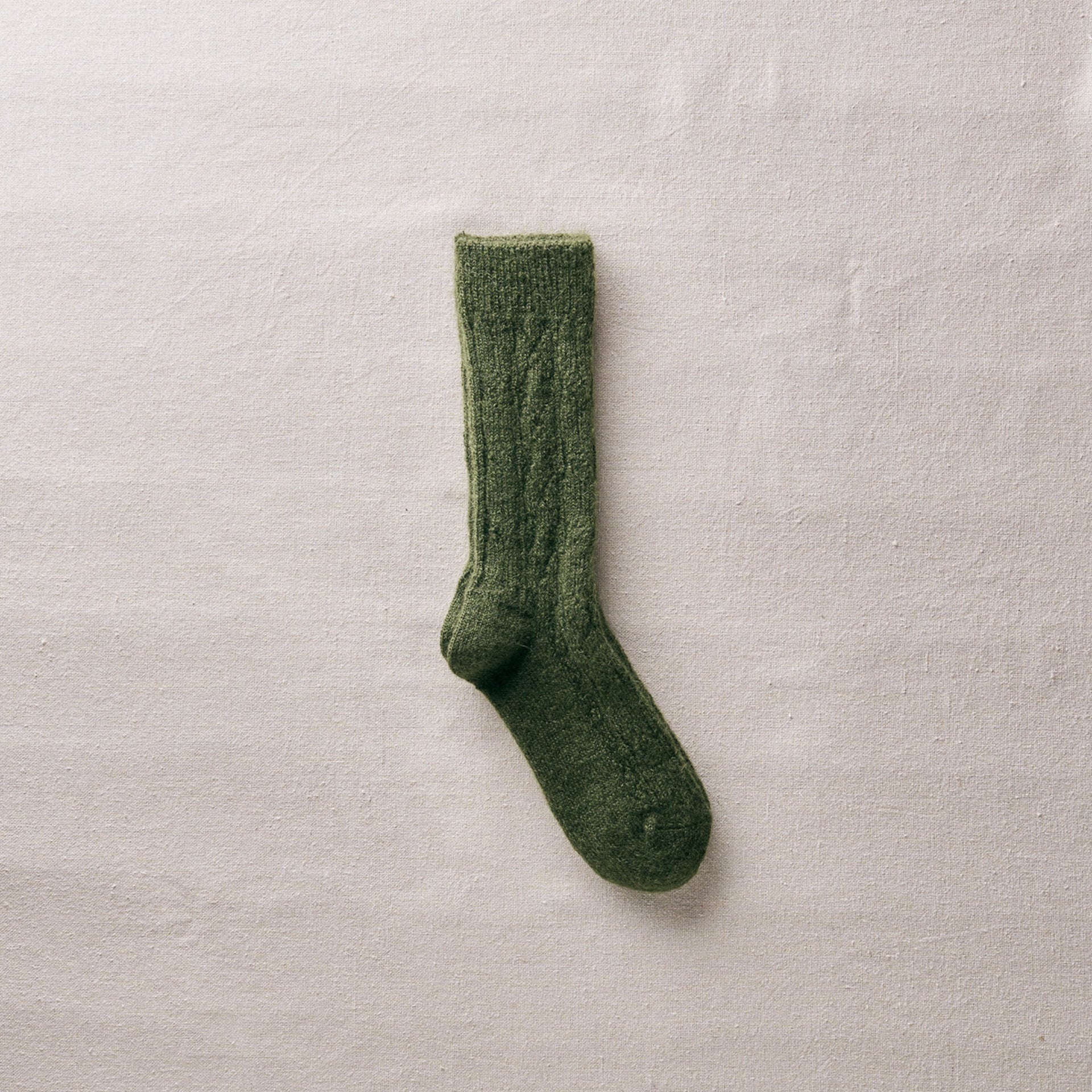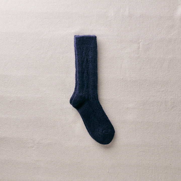 モヘアとウールを使用し、旧式の編み機で丁寧にケーブル柄に編み立てたソックス。ふっくらとした風合いが特徴で、暖かさと優しい履き心地です。素材感とクラシックなデザインが魅力の一足です。