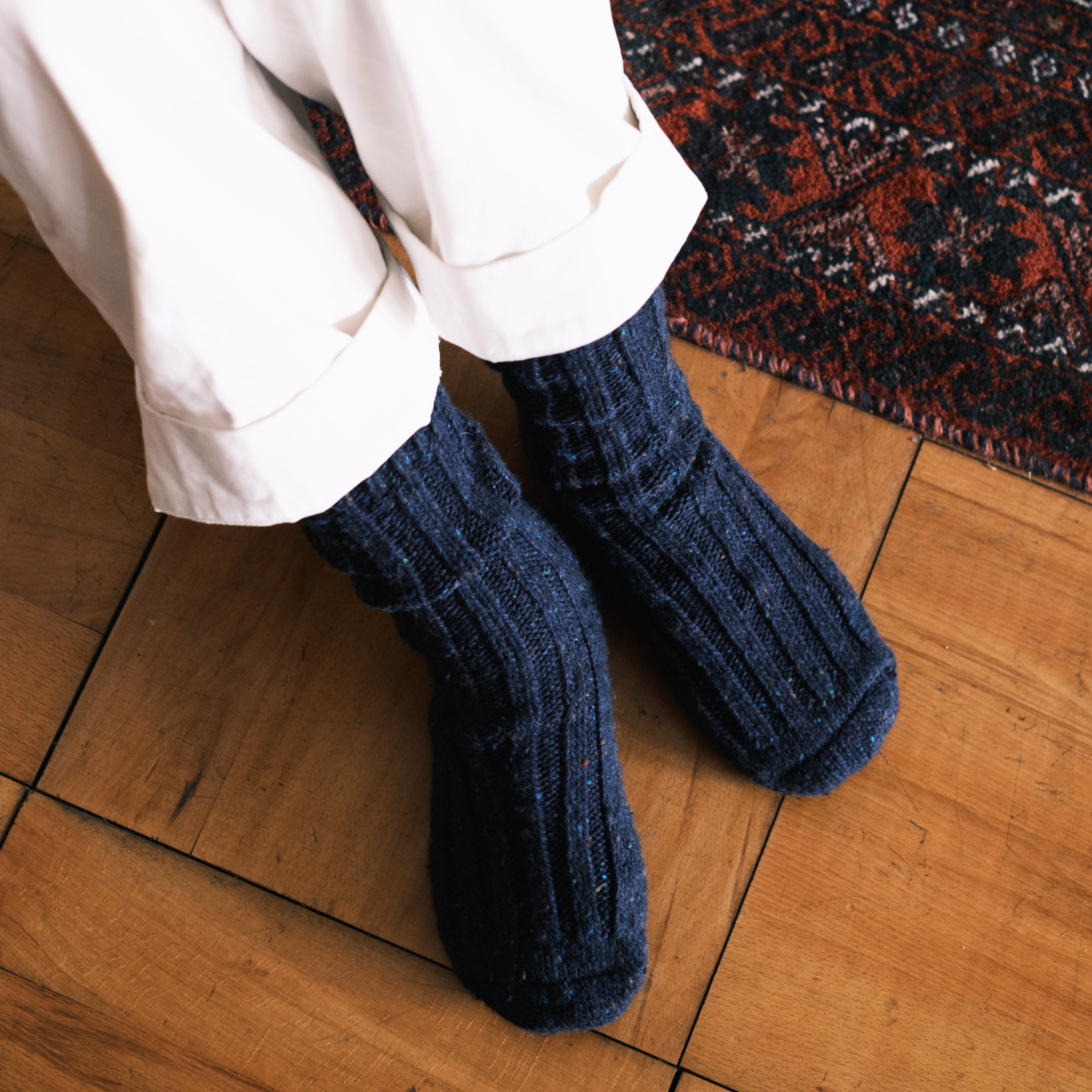 100%リサイクル素材を使用したリサイクルウールで編み立てたローゲージソックス。英国製の旧式ヴィンテージマシーンを使い、たっぷりの糸をゆっくりと編み上げることで、手編みのような優しい履き心地を実現しました。