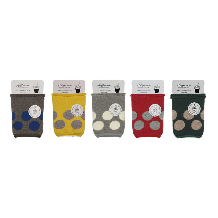 靴下編機で作ったコーヒースリーブ。パイル生地が側面の結露防止に役立ちます。靴下同様の伸縮性があり、カップのある程度のサイズ違いはこれ1つでOK。