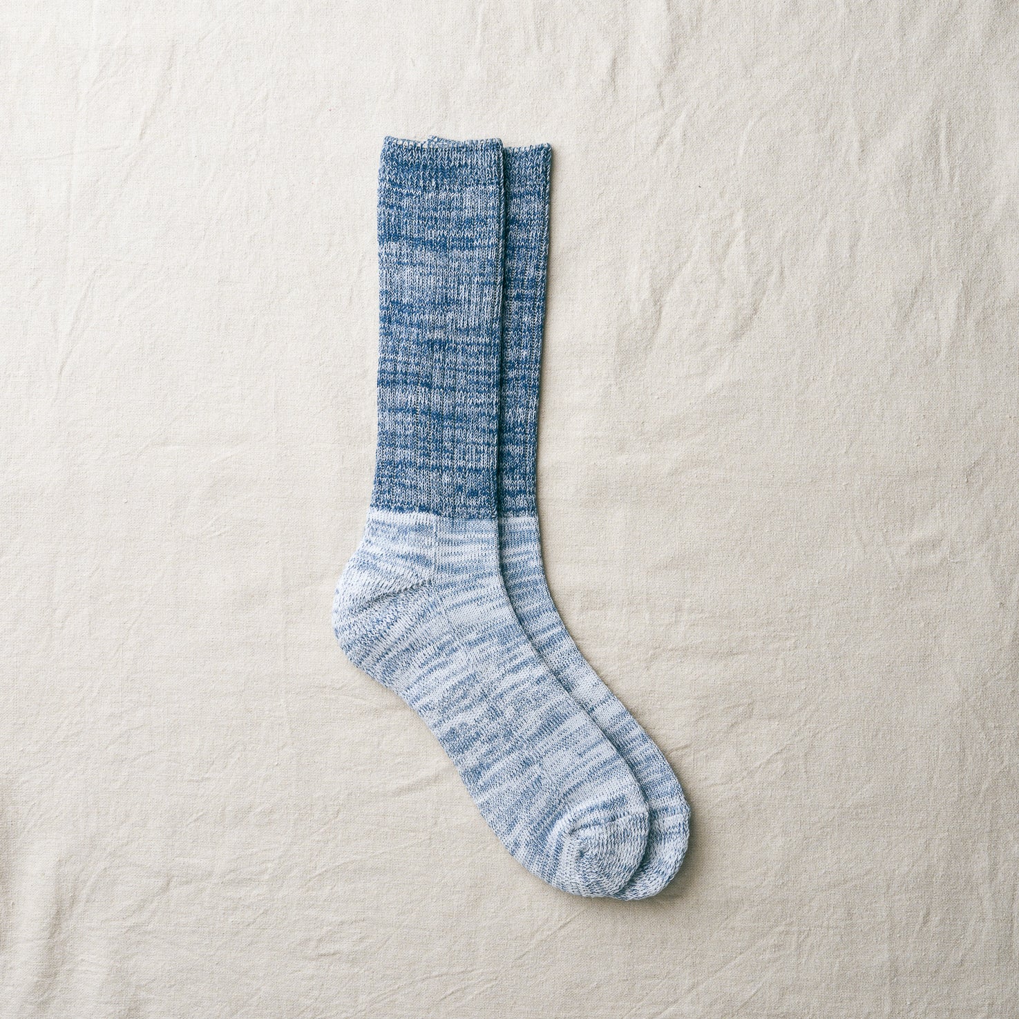 軍の靴下から着想を得た、日常使いの道具として最適な足底パイルのリブ編みソックスです。足底のパイル編みと土踏まずのサポートゴムで快適な履き心地です。丈はふくらはぎを優しく包み込む長めの丈です。毎朝の散歩などワークアウトに最適です。イタリア製のヤマヤ別注編機で編み立てることでリブ編みとパイル編みの両立を実現しました。リブ編みなので優しくフィットします。