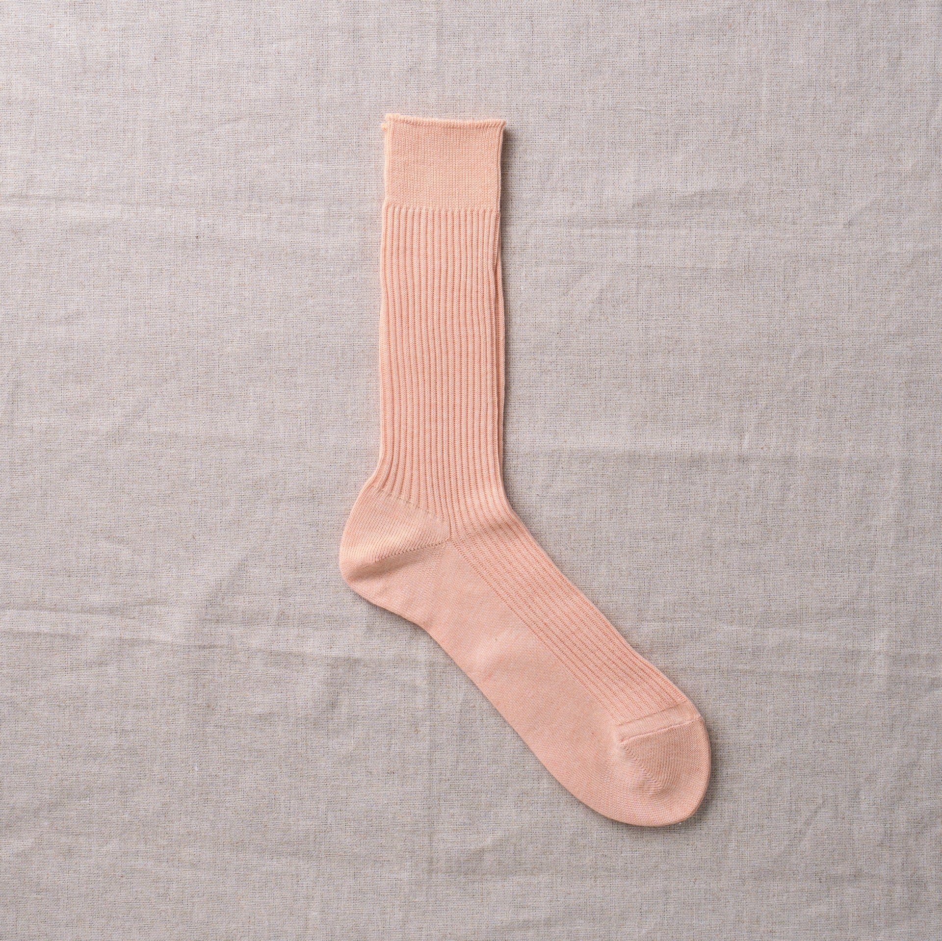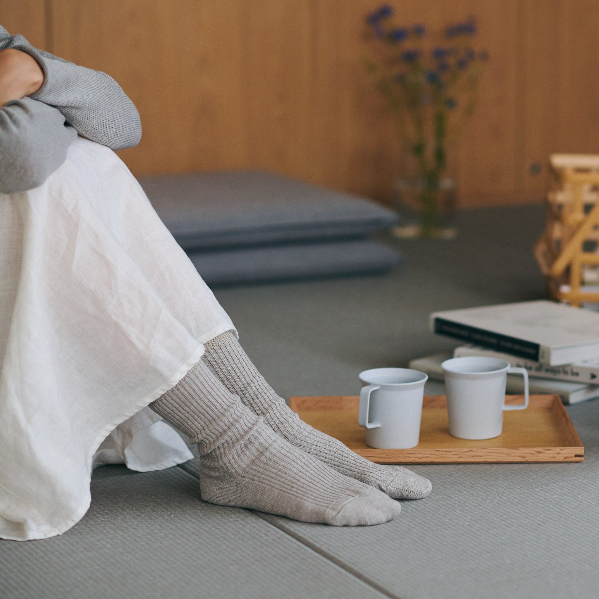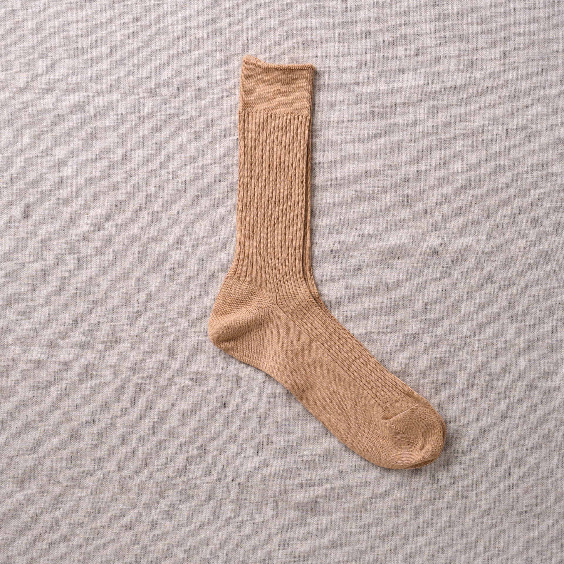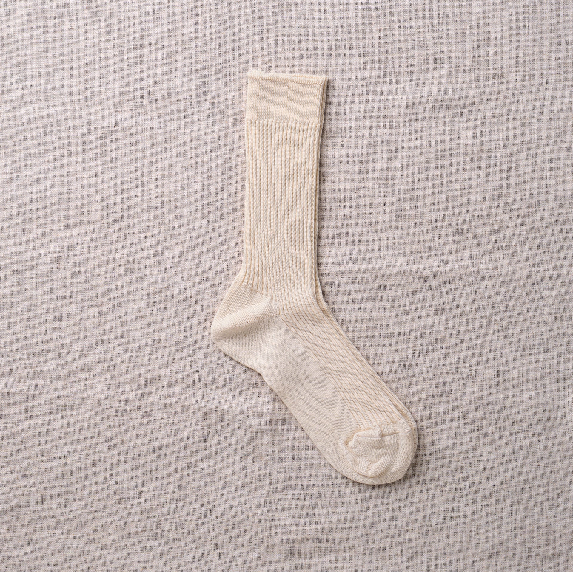 通常ソックスに入れるナイロン糸やポリウレタン糸を使用せず綿のみで編み立てたオーガニックコットン100%の靴下です。天然の素材を、化学薬品を一切使用しない自然の染め(彩土染め)で仕上げました。しめつけ感が苦手な方や敏感肌の方にオススメです。伸縮性のあるリブ編みでフィット性を出しました。履き口のゴム部分は天然ゴムを使用しています。