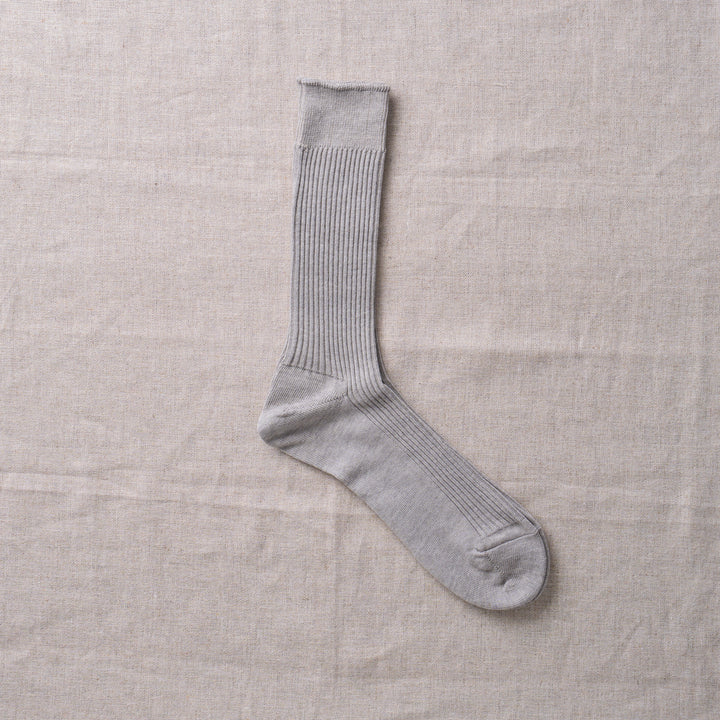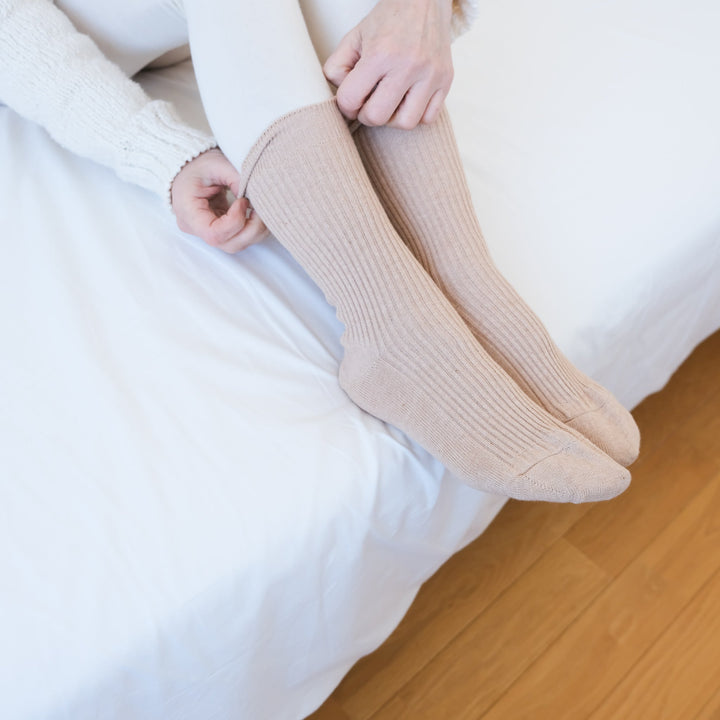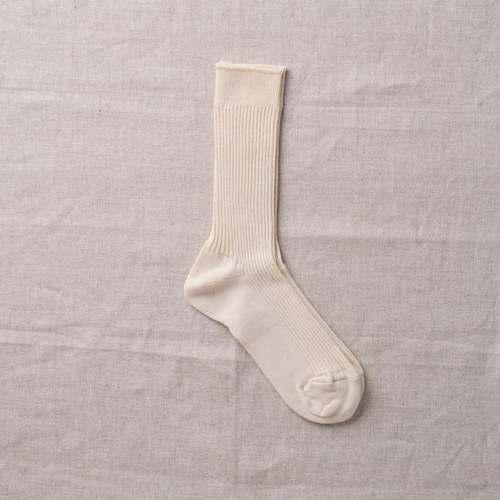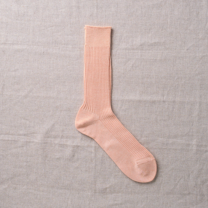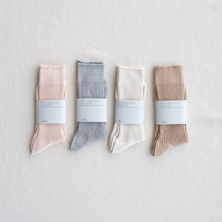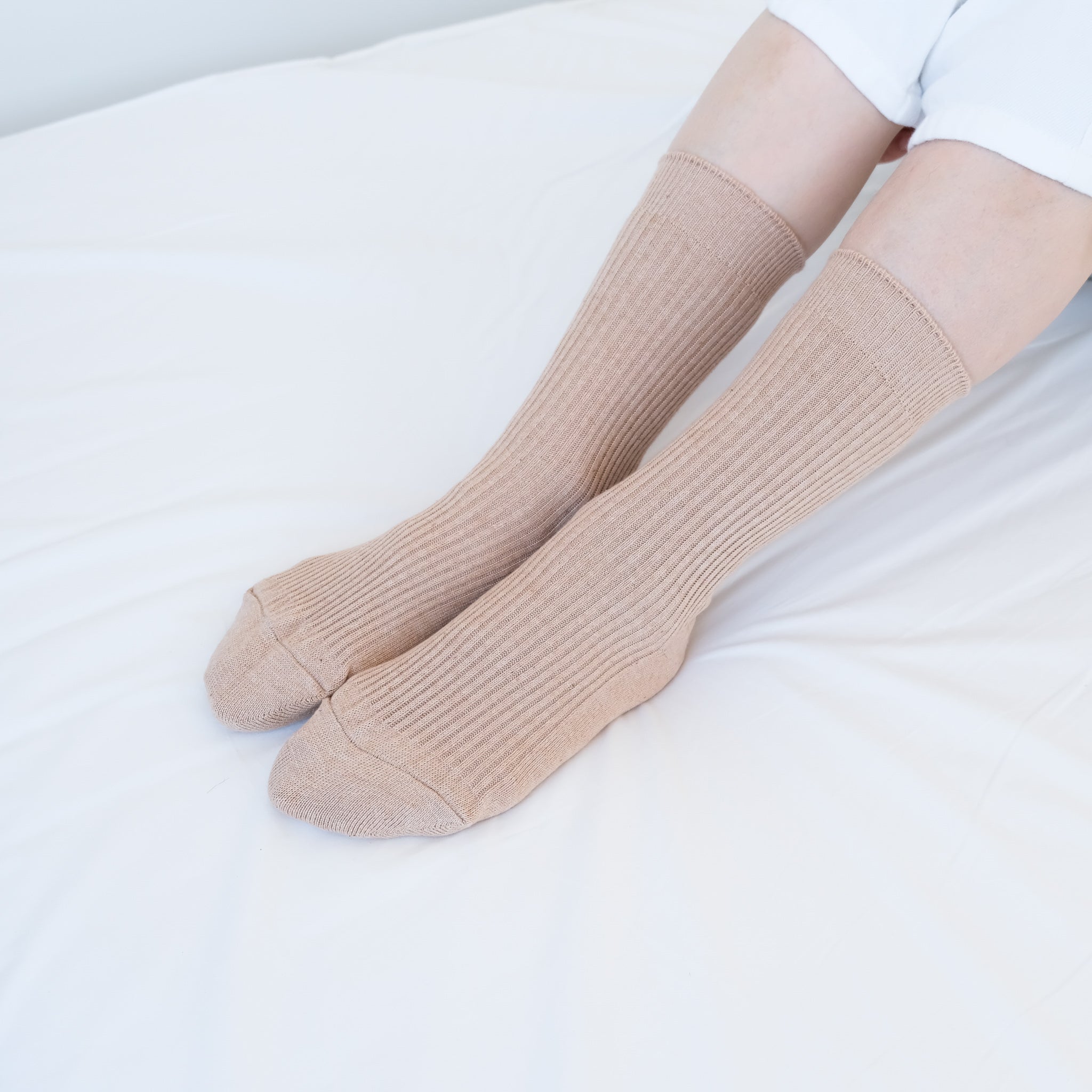 通常ソックスに入れるナイロン糸やポリウレタン糸を使用せず綿のみで編み立てたオーガニックコットン100%の靴下です。天然の素材を、化学薬品を一切使用しない自然の染め(彩土染め)で仕上げました。しめつけ感が苦手な方や敏感肌の方にオススメです。伸縮性のあるリブ編みでフィット性を出しました。履き口のゴム部分は天然ゴムを使用しています。