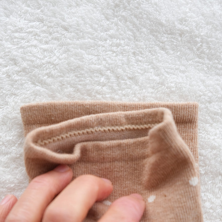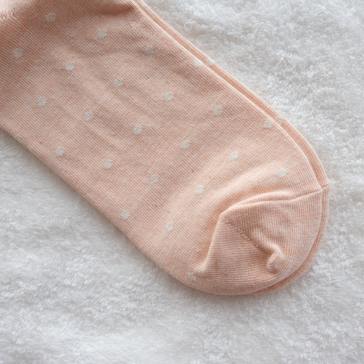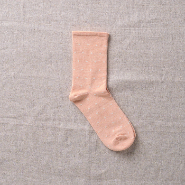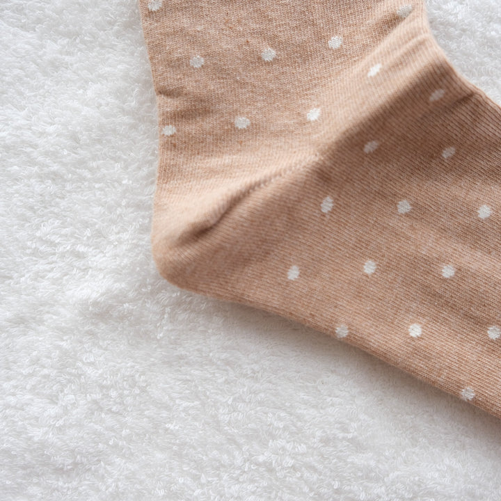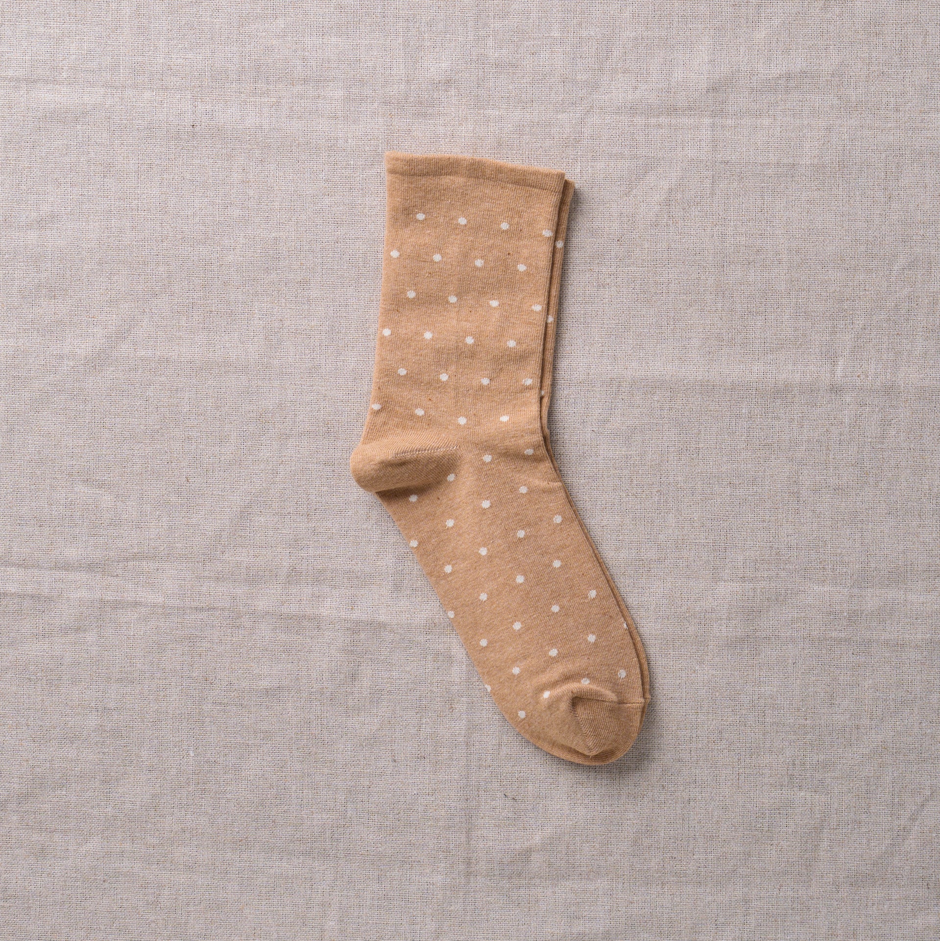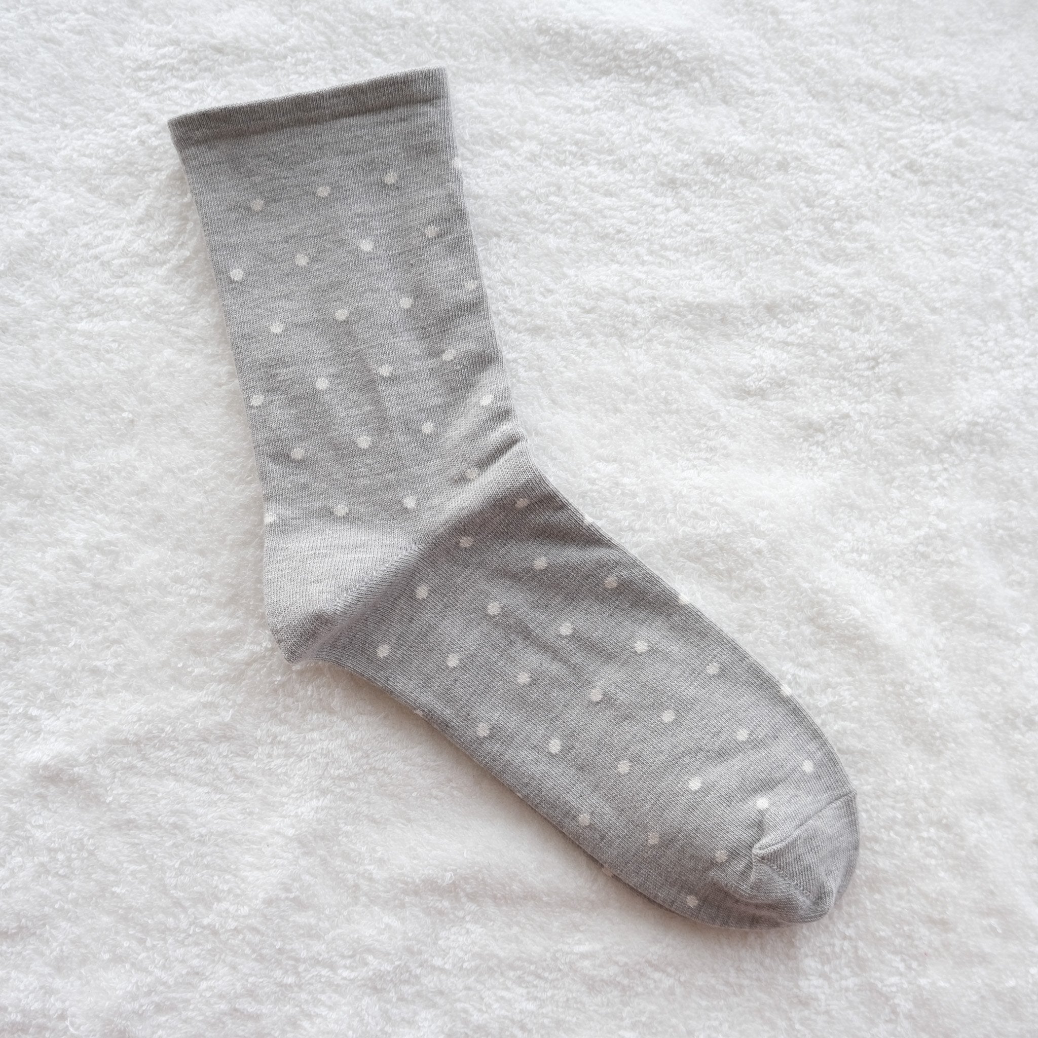 足元が楽しくなるドット柄。履きぐちにゴムを入れていないので締めつけず、程よいフィット感で足をやさしく包み込みます。靴を選ばない厚みです。