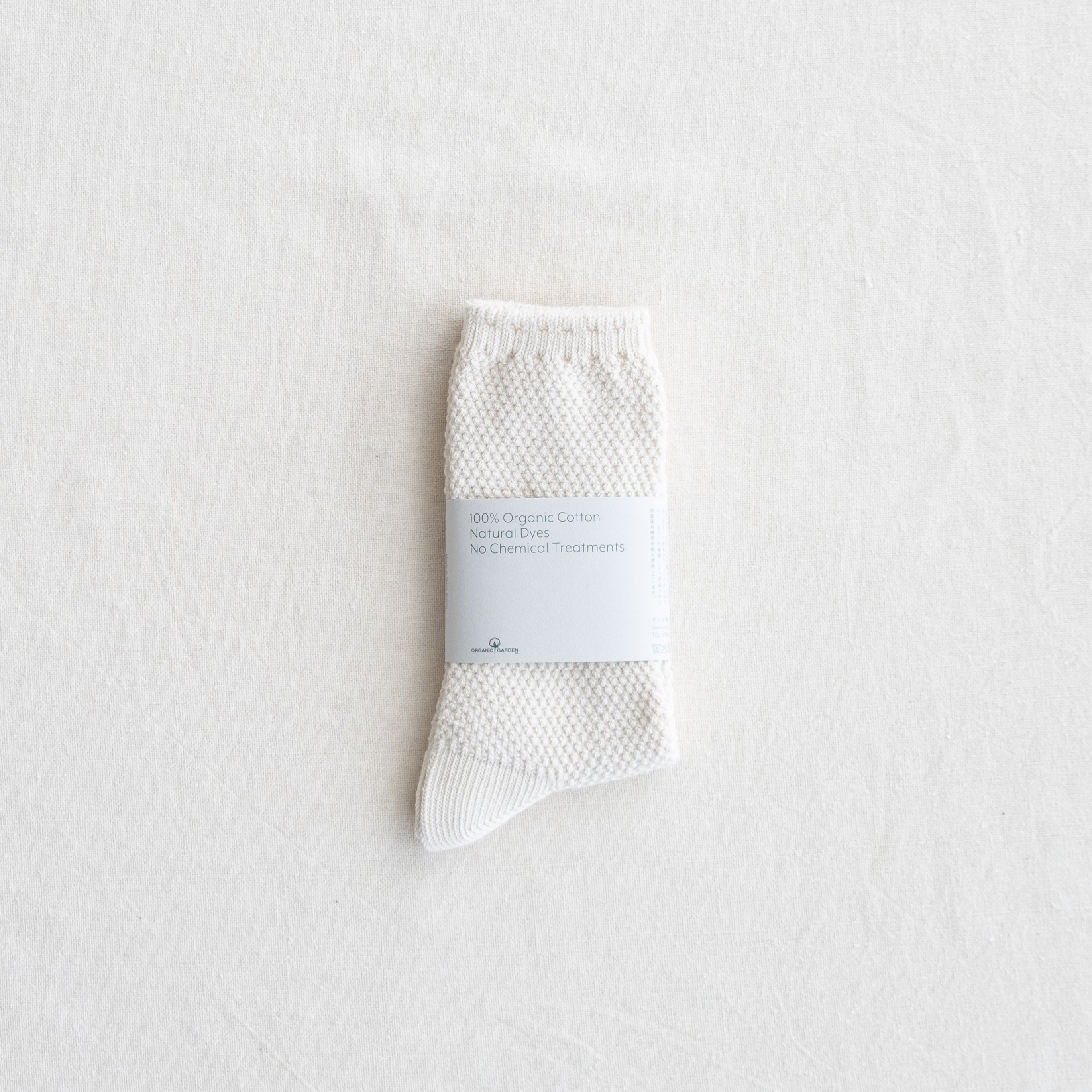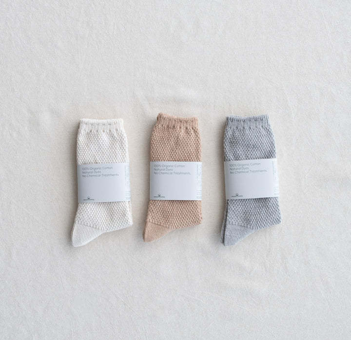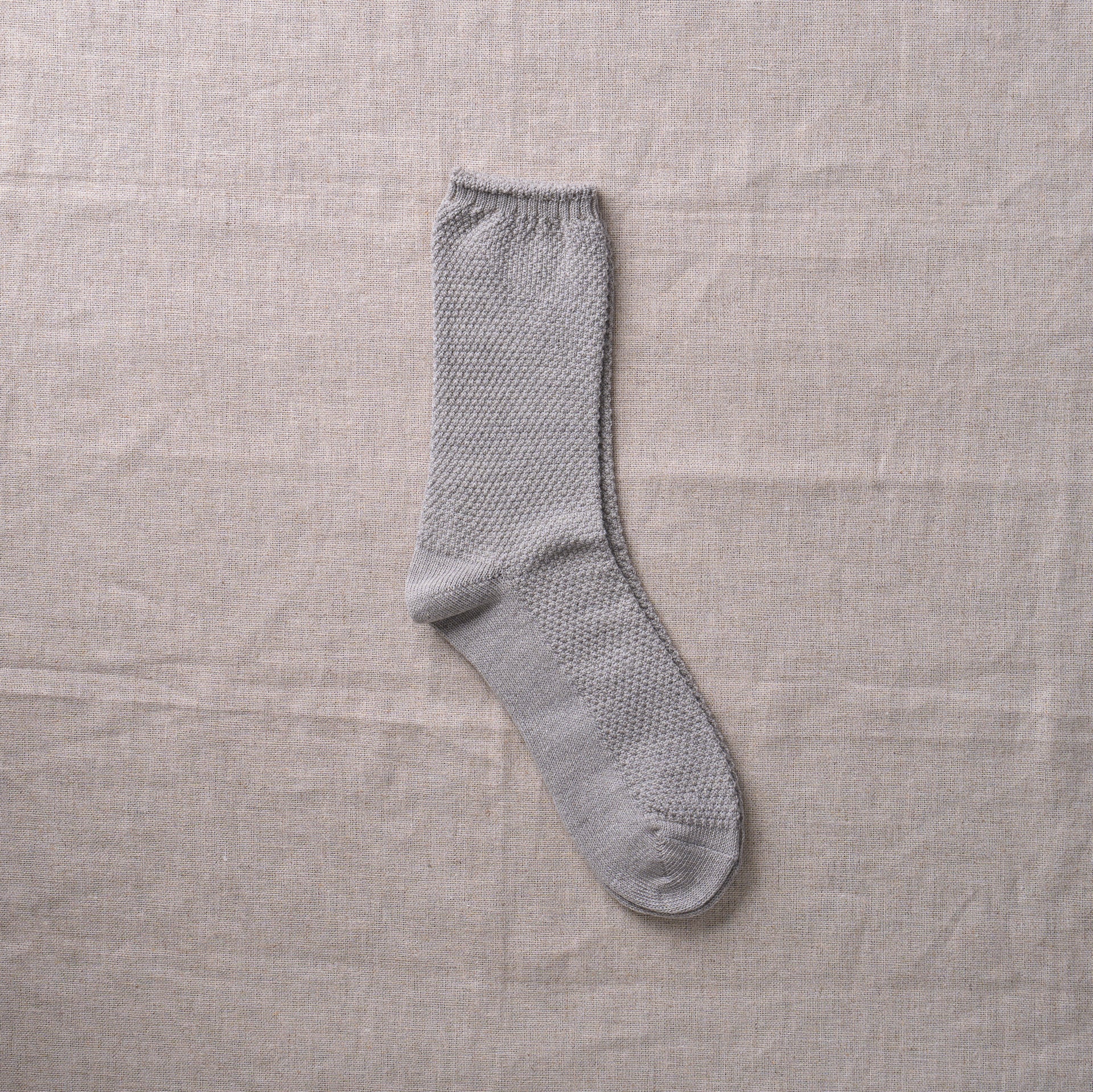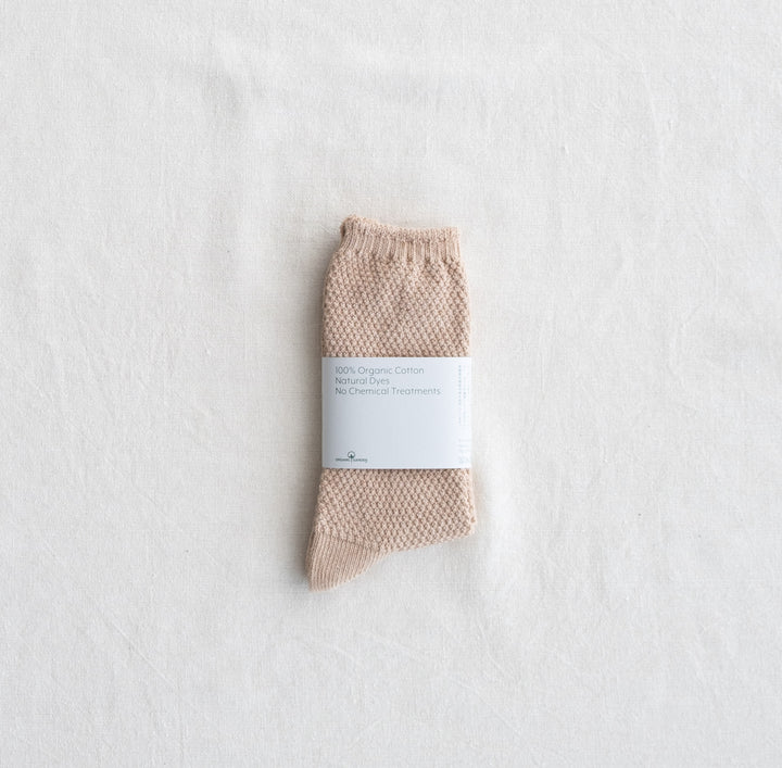 生地に凹凸があり通気性に優れている鹿の子編みのソックスです。 生成は原綿の色、ブラウンはカラードコットン茶綿。グレーは、バリ島の地層の色素で染めた彩土(ハニ)染めオーガニックコットン糸を使用しています。肌にやさしく、伸びも良い快適な履き心地をお楽しみ下さい。