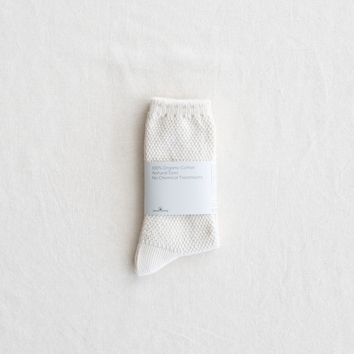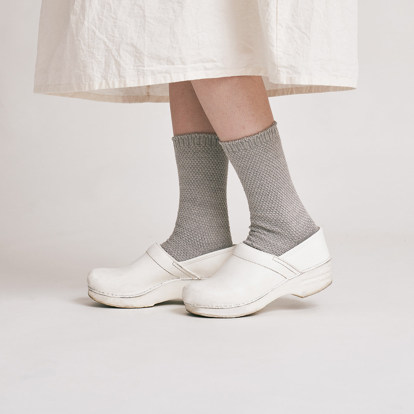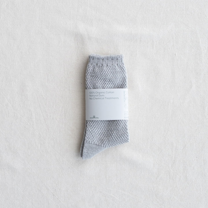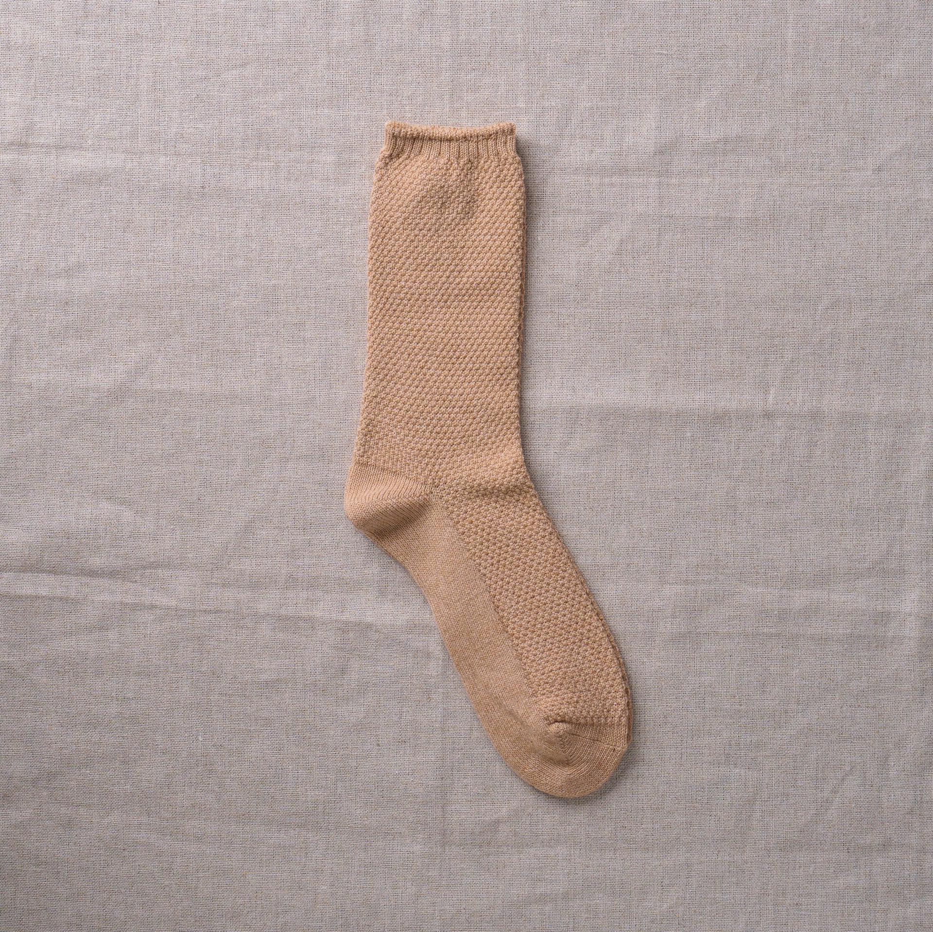 生地に凹凸があり通気性に優れている鹿の子編みのソックスです。 生成は原綿の色、ブラウンはカラードコットン茶綿。グレーは、バリ島の地層の色素で染めた彩土(ハニ)染めオーガニックコットン糸を使用しています。肌にやさしく、伸びも良い快適な履き心地をお楽しみ下さい。