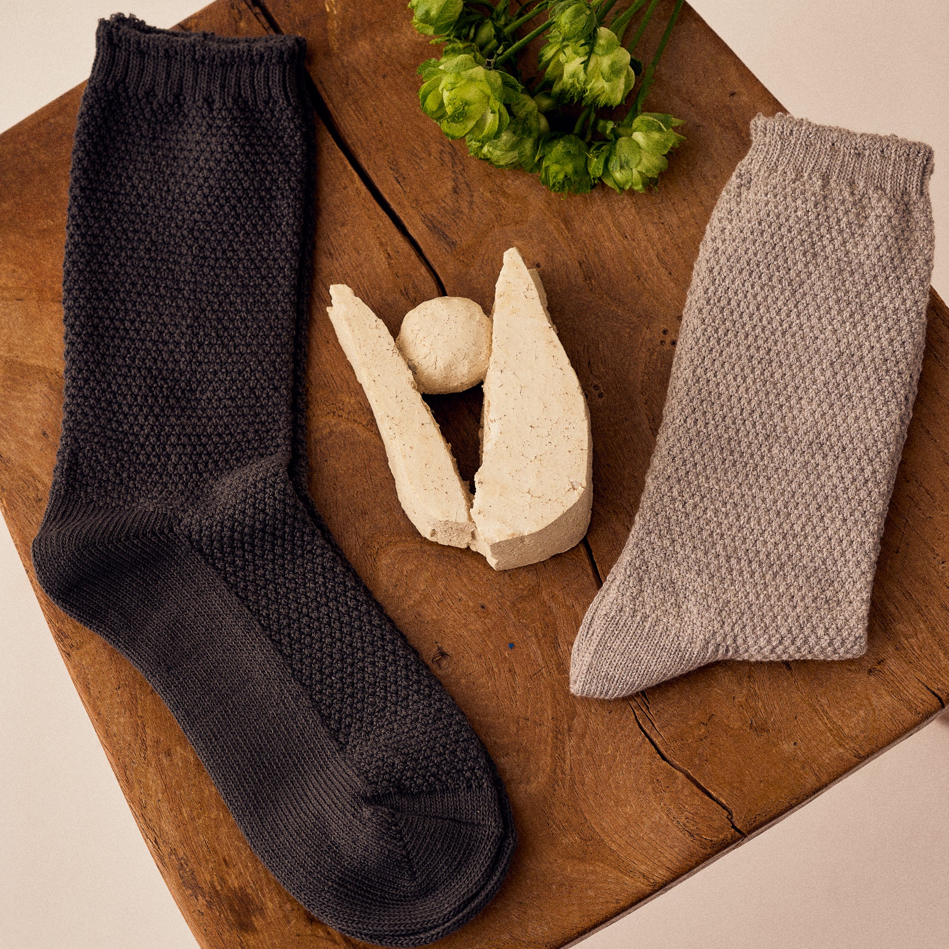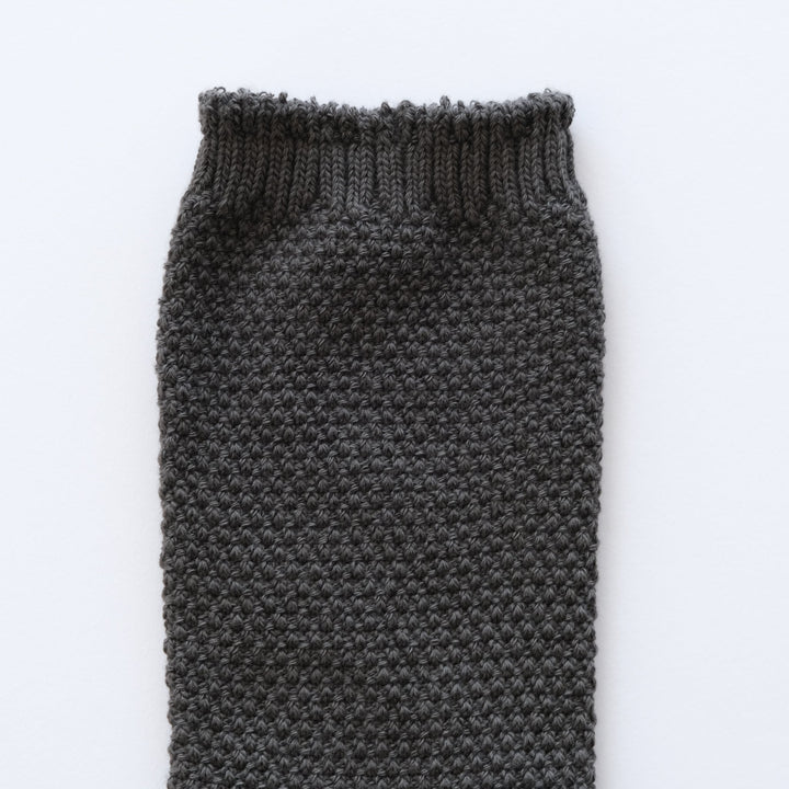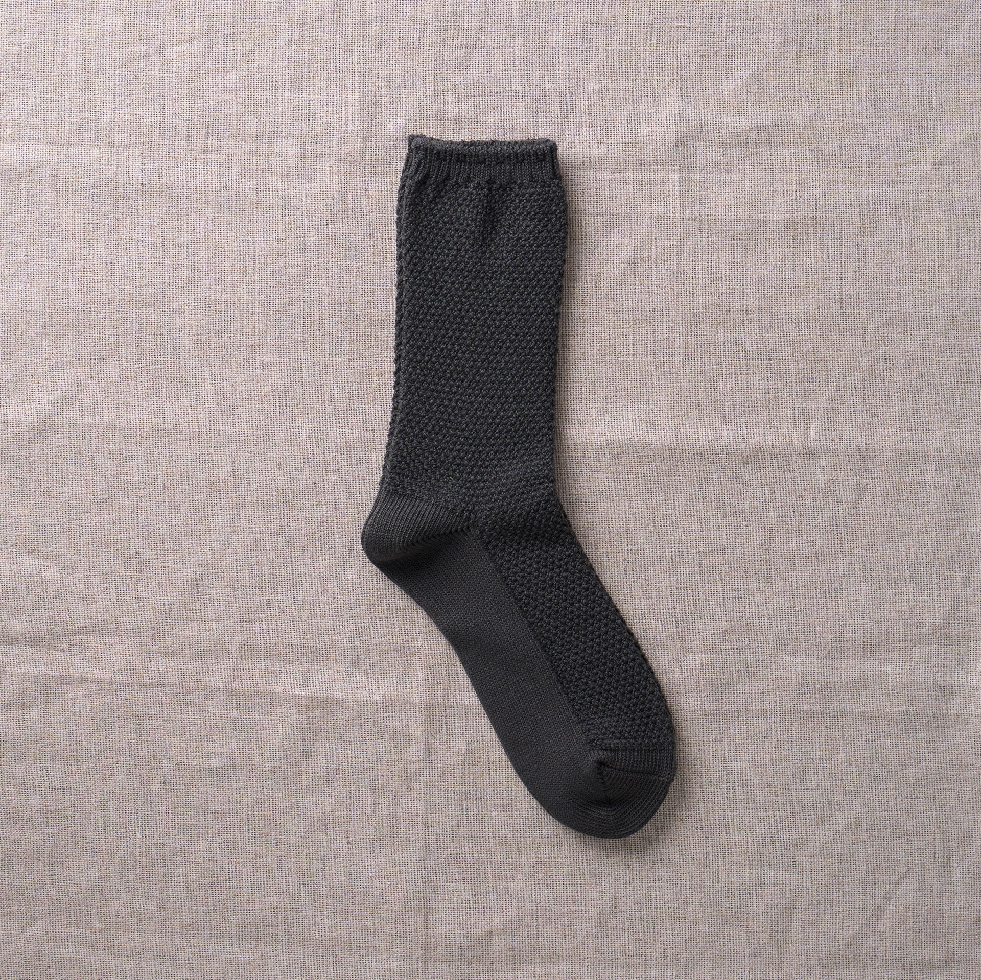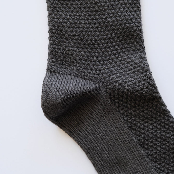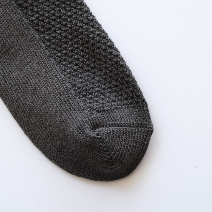五倍子染めのナチュラルブラックカラーのソックス。生地に凹凸があり通気性に優れている鹿の子編み。 肌にやさしく、伸びも良い快適な履き心地をお楽しみ下さい。