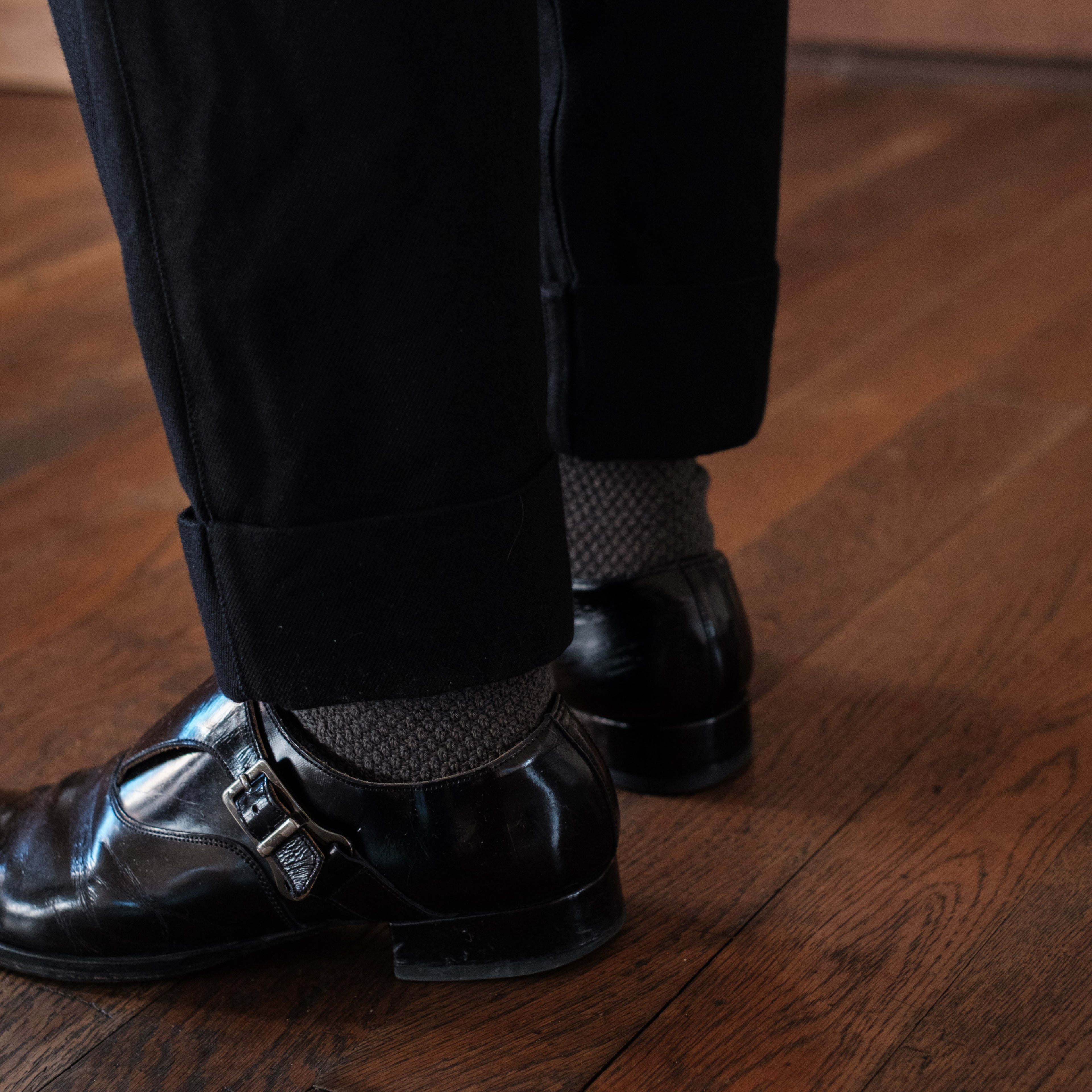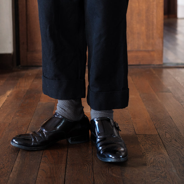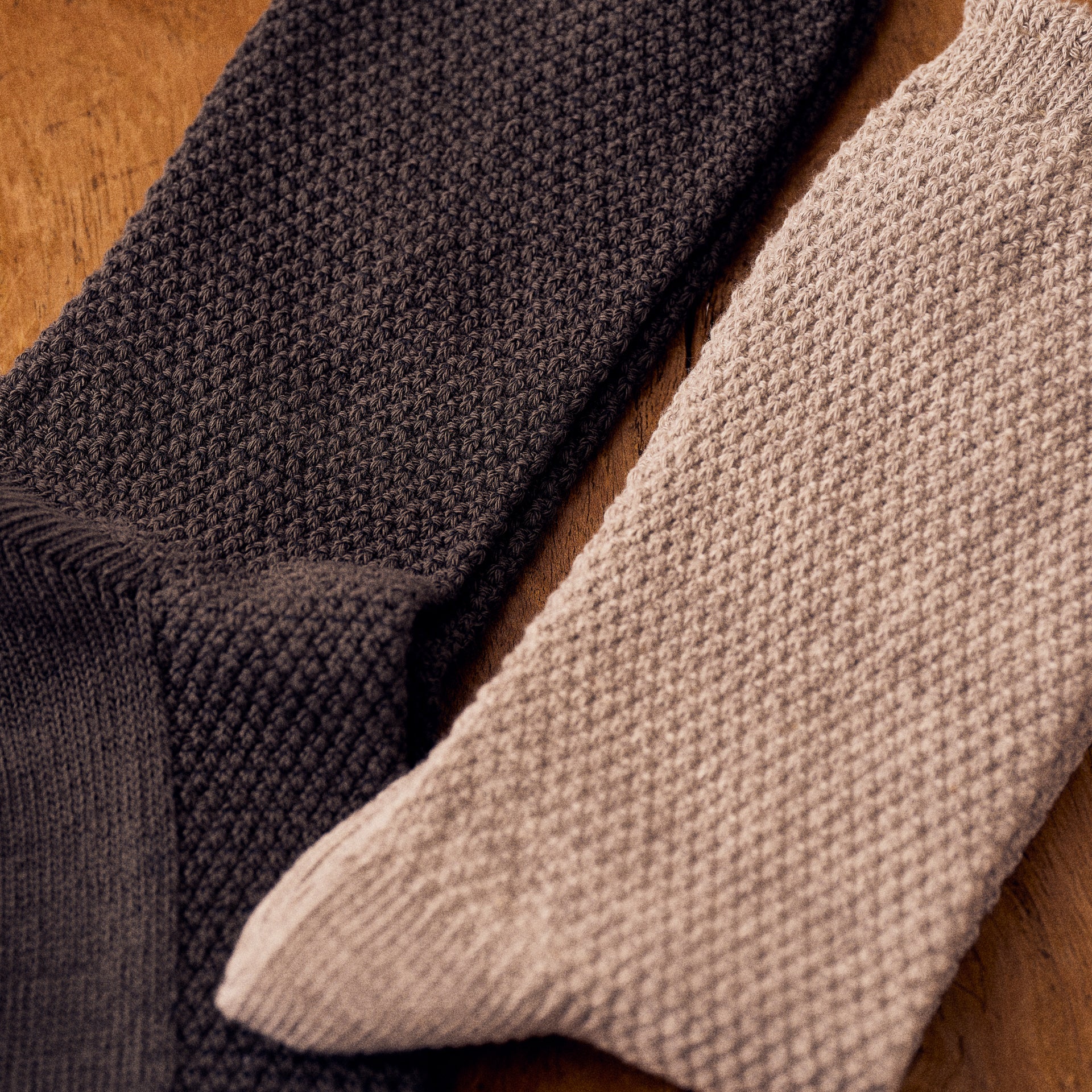 五倍子染めのナチュラルブラックカラーのソックス。生地に凹凸があり通気性に優れている鹿の子編み。 肌にやさしく、伸びも良い快適な履き心地をお楽しみ下さい。