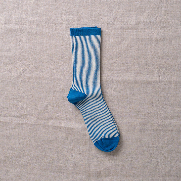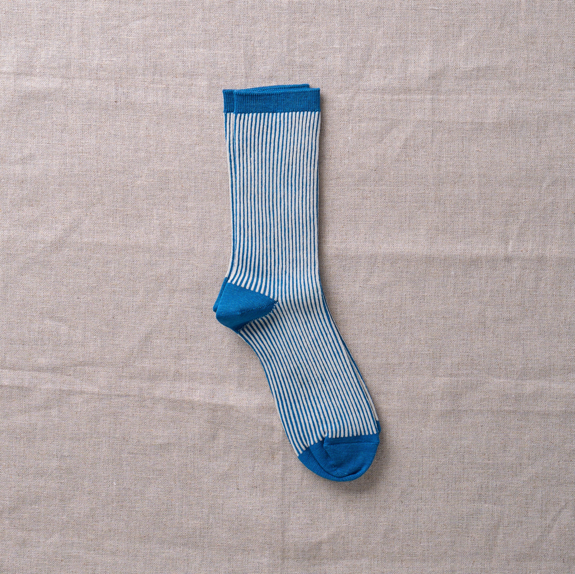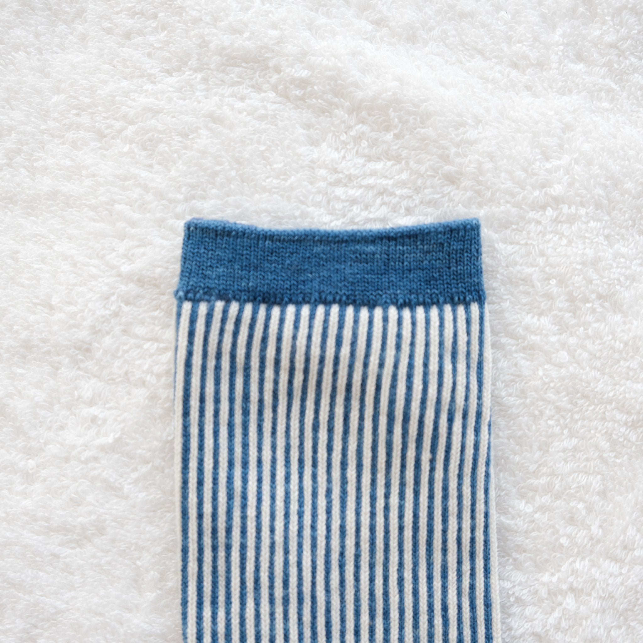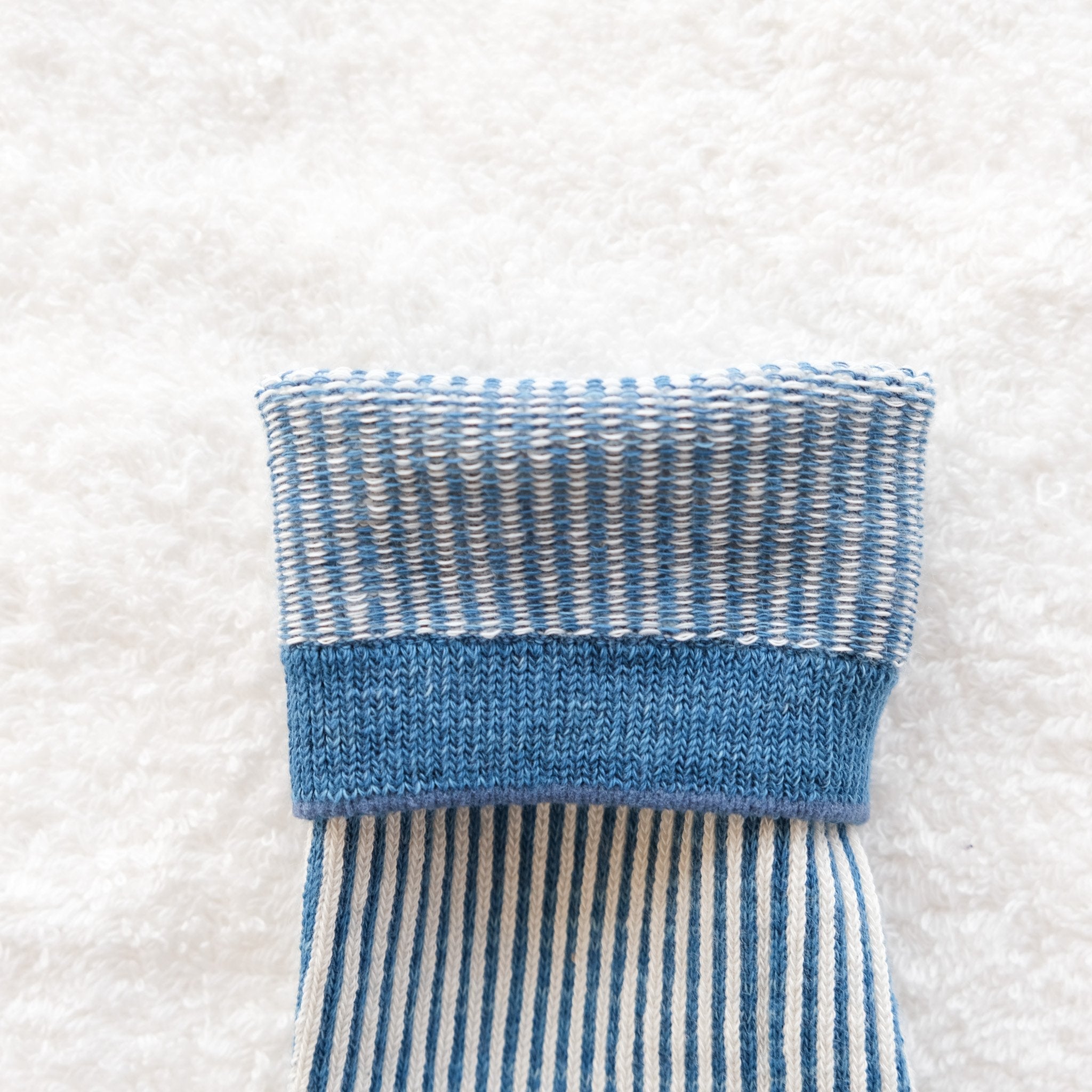 足元にリズムが生まれるストライプ柄。「天然藍発酵建て」という日本古来の技法を用いた藍染めの綿糸と、ホワイトオーガニックコットン(無着色の生成)のストライプ柄です。