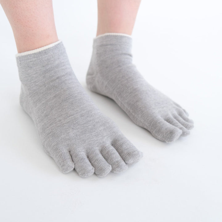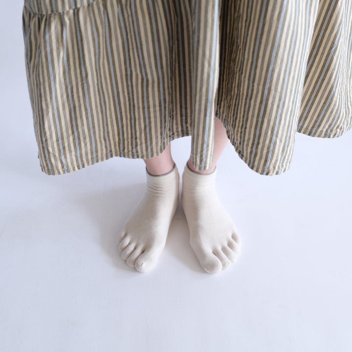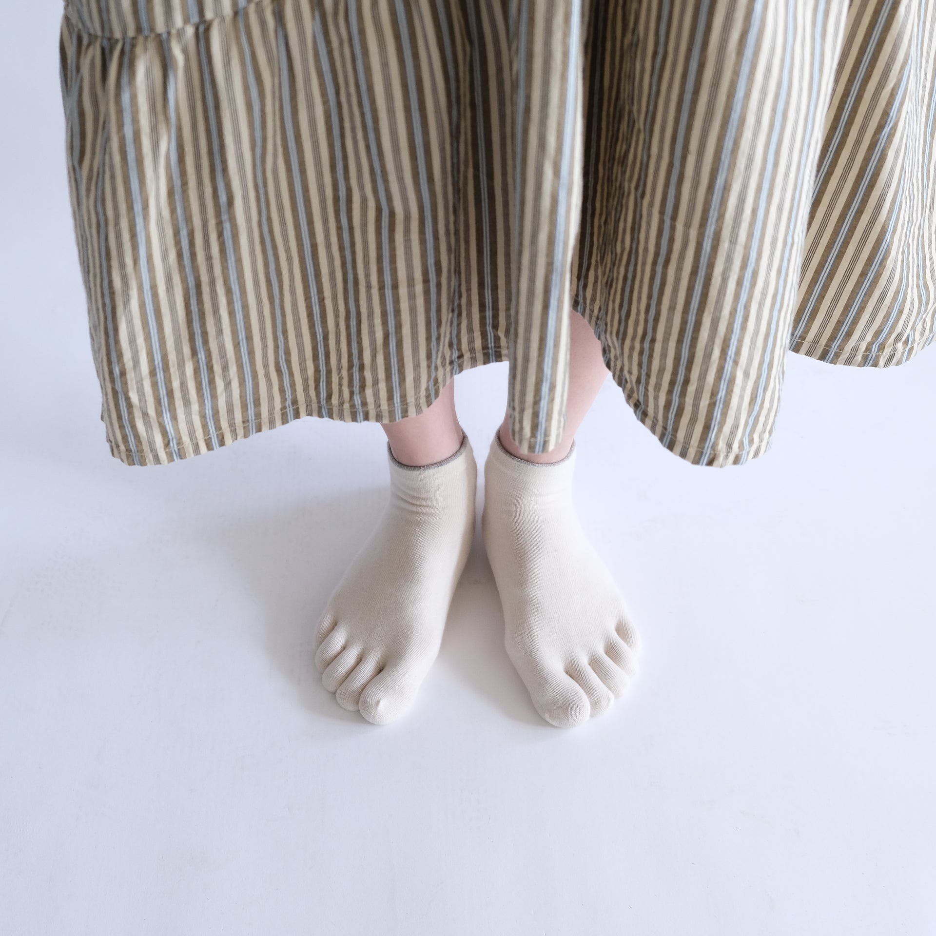 オーガニックコットンを天然染めした、くるぶしあたりまでの短め5本指ソックスです。