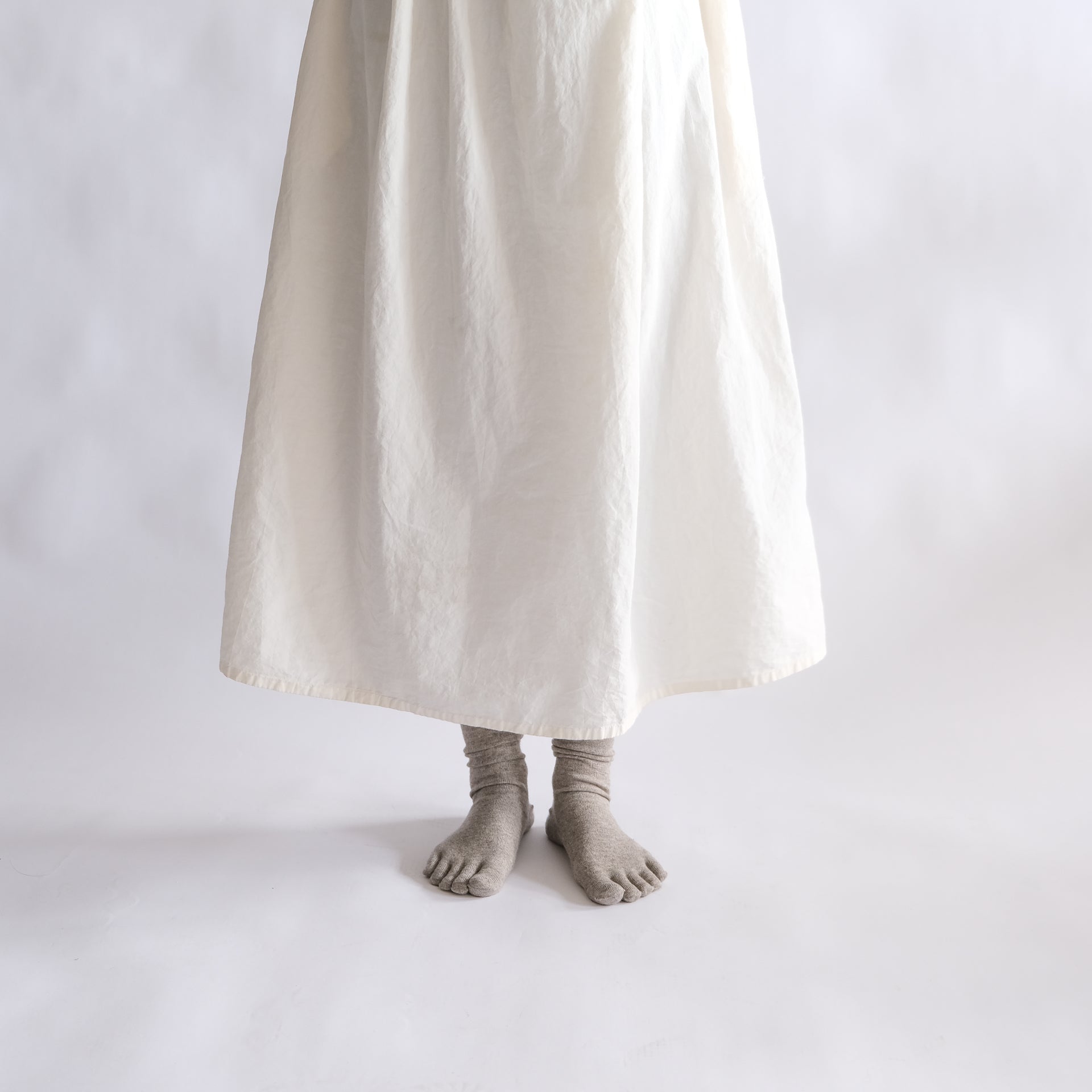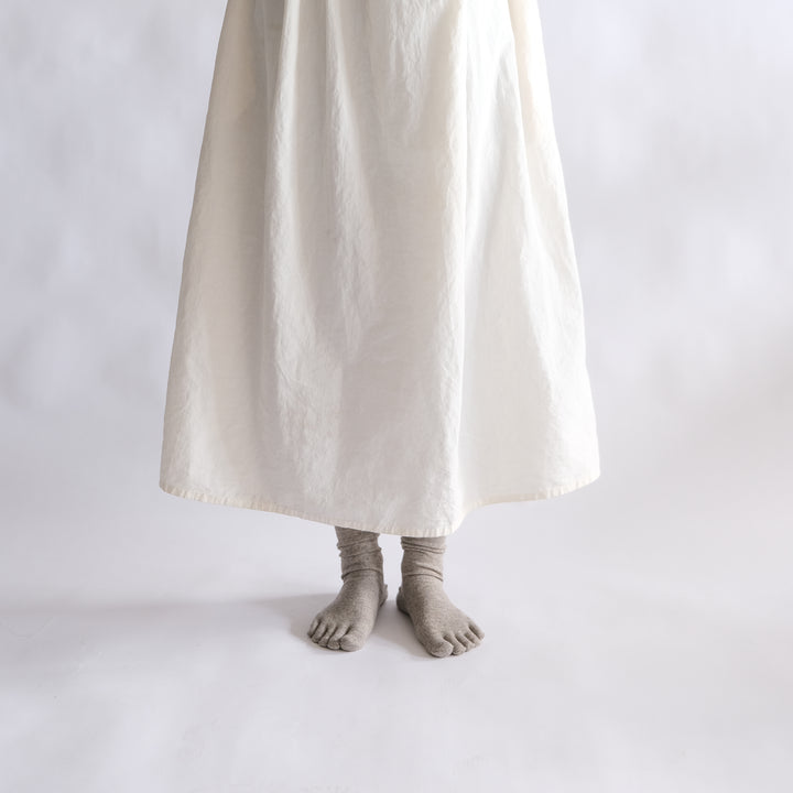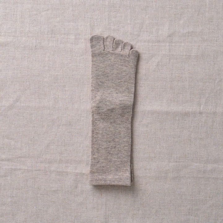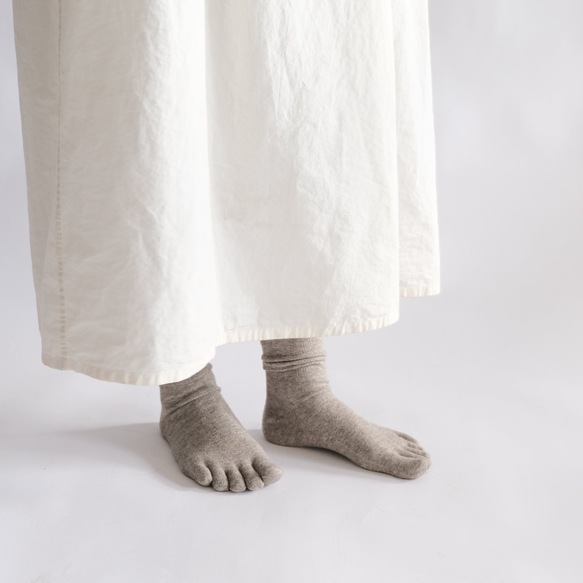 しなやかな超長綿のスーピマオーガニックコットンと高い保温性を持つヤクの混紡糸で編んだやわらかな履き心地。とてもあたたかなソックスです。生地がやわらかいので指先も脱着しやすく、1年中履きやすいレギュラー丈の5本指ソックスです。