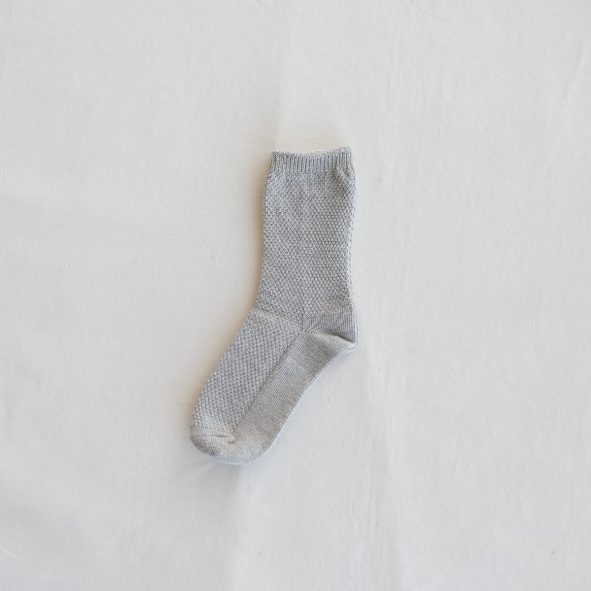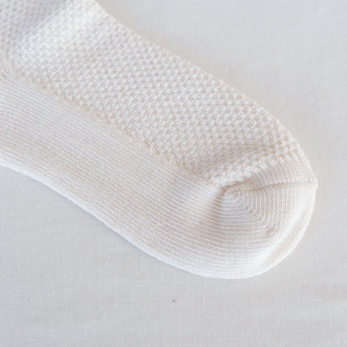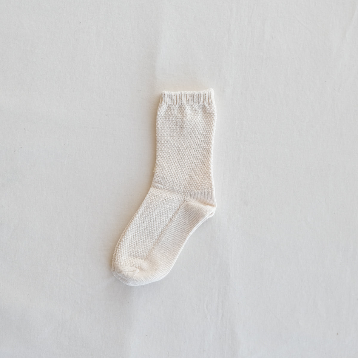 定番の編地ともいえる鹿の子編みのキッズ靴下です。生地が細かく凹凸編みになっていて密着感がなく、通気性に優れており、さわやかな履き心地です。生成は原綿の色、ブラウンはカラードコットン茶綿。グレーは、地層の色素で染めた彩土(ハニ)染めオーガニックコットン糸を使用しています。肌にやさしく、伸びも良い快適な履き心地をお楽しみ下さい。