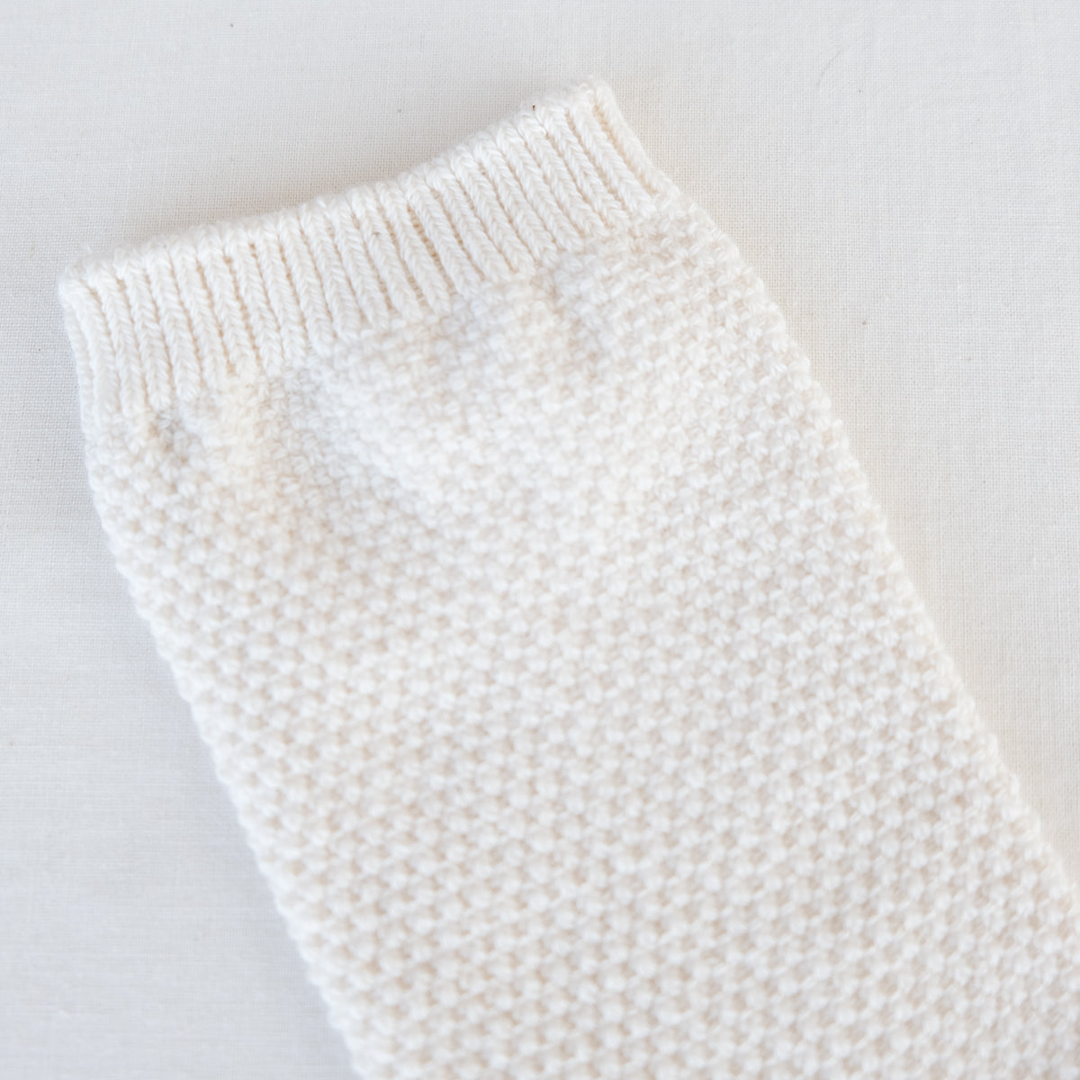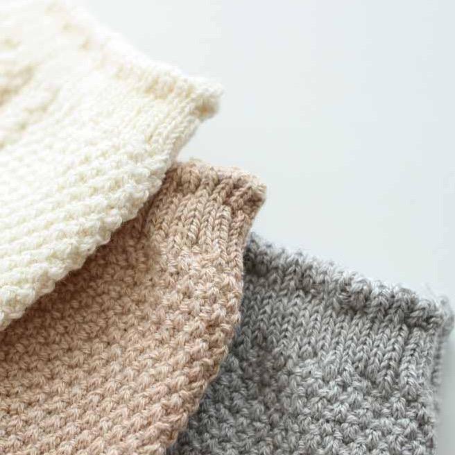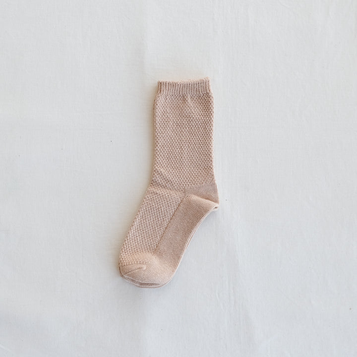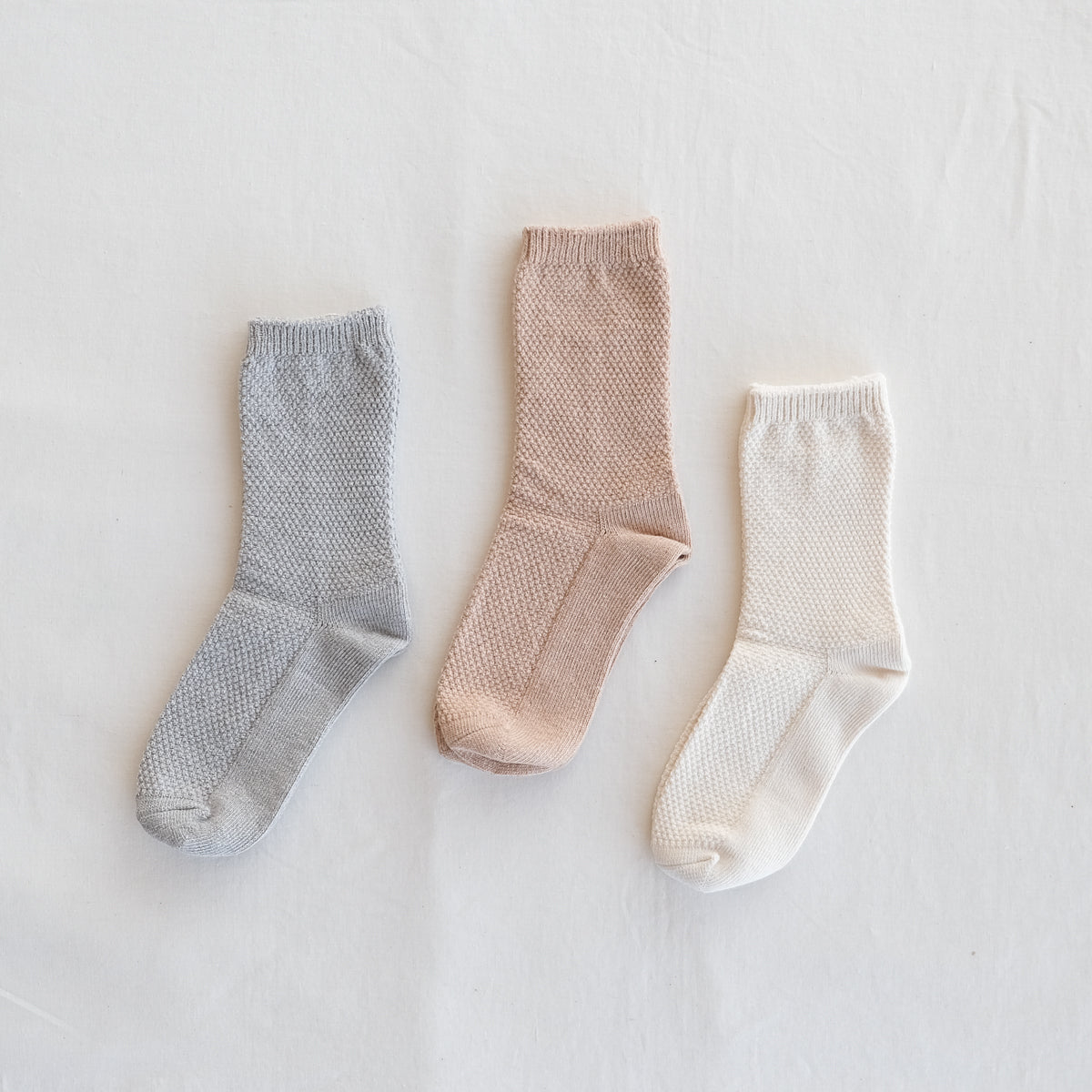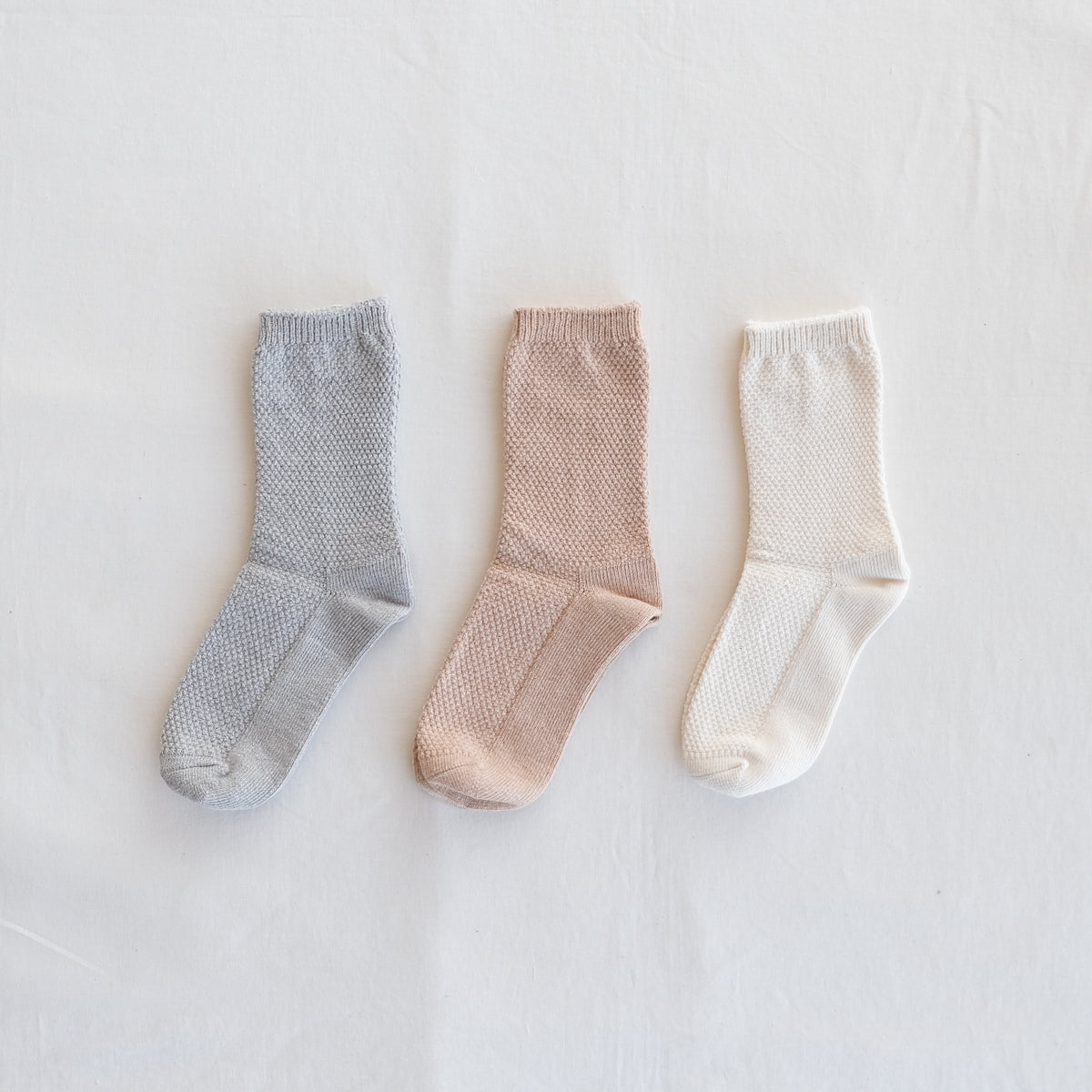 定番の編地ともいえる鹿の子編みのキッズ靴下です。生地が細かく凹凸編みになっていて密着感がなく、通気性に優れており、さわやかな履き心地です。生成は原綿の色、ブラウンはカラードコットン茶綿。グレーは、地層の色素で染めた彩土(ハニ)染めオーガニックコットン糸を使用しています。肌にやさしく、伸びも良い快適な履き心地をお楽しみ下さい。