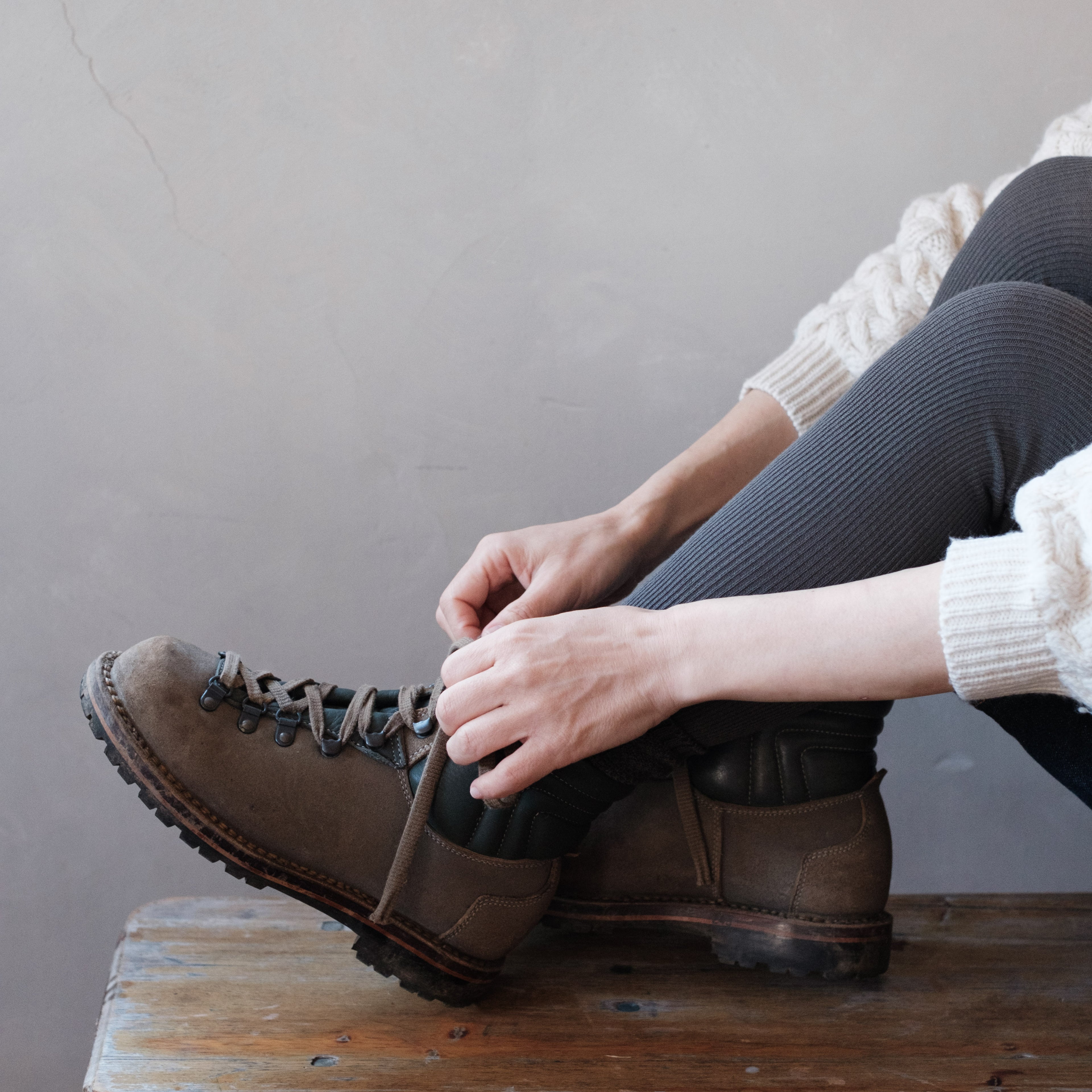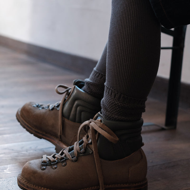 天然染料の「五倍子染め」で染めているので、ナチュラルな印象の黒です。伸縮性のある細いリブは優しく足を包み込みます。