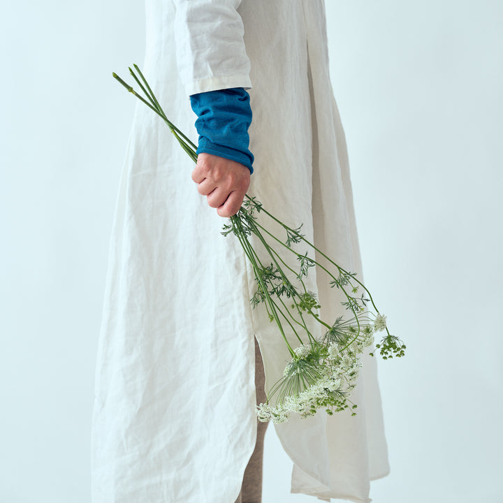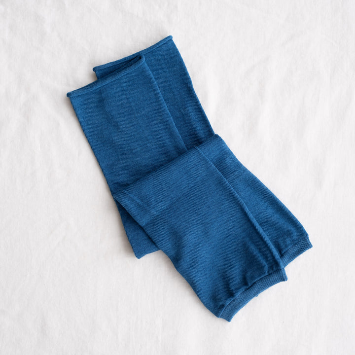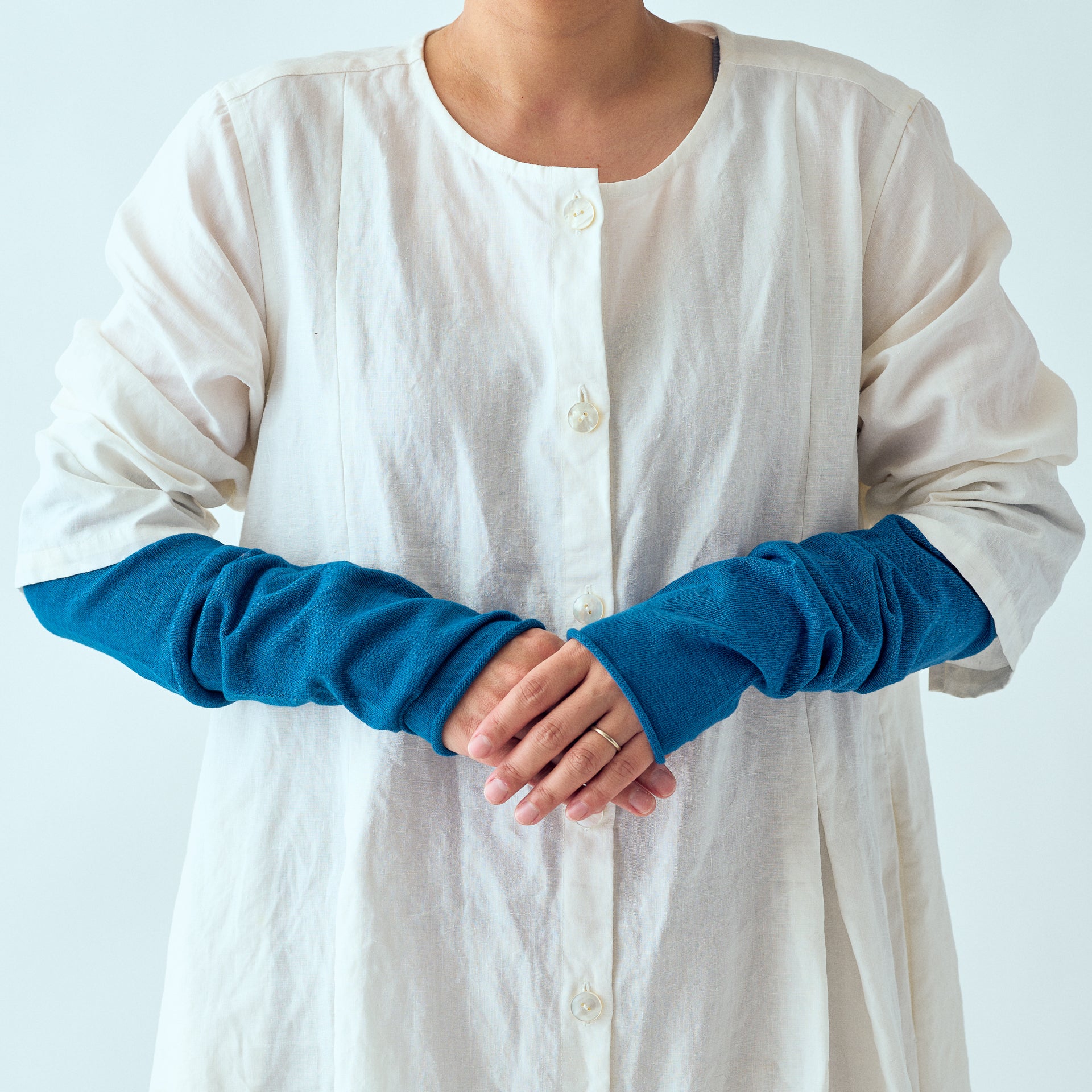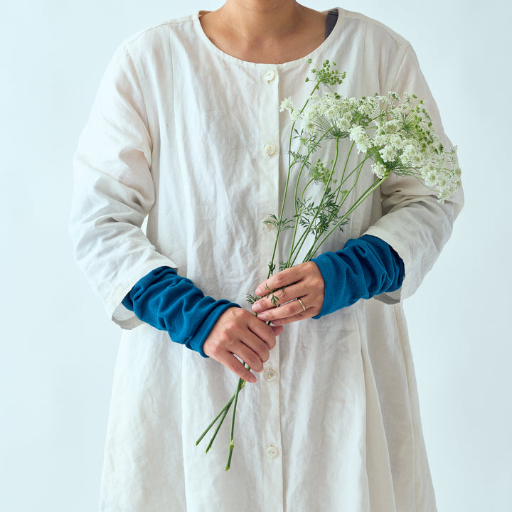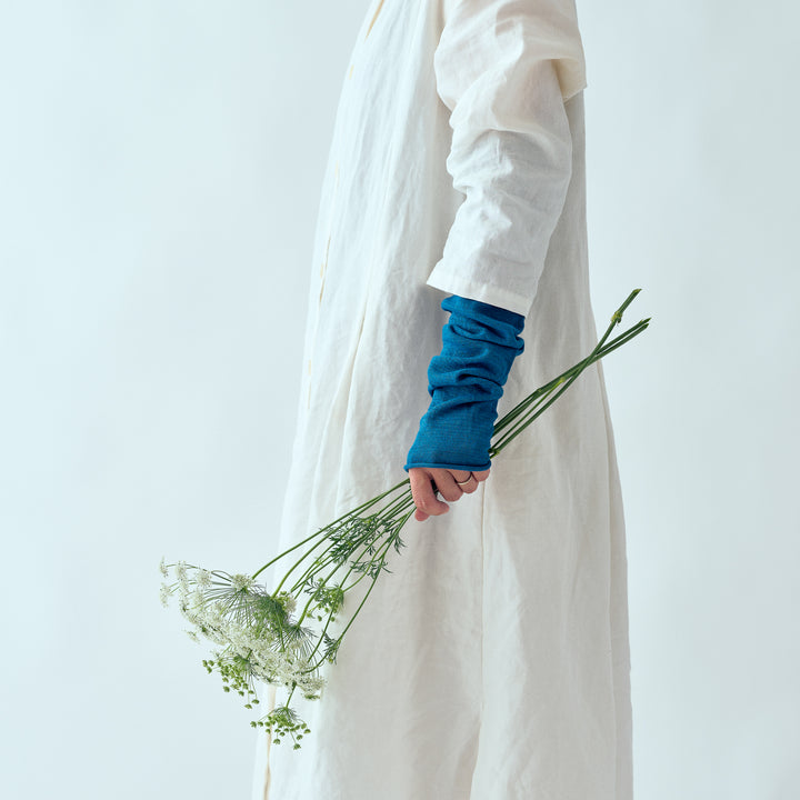 本藍染めのアームカバー。伸ばすと二の腕まであり、しめ付けを感じないゆったりとした着け心地でとっても薄手のアームカバーです。上品な透け感があり、夏でもさわやかにお使い頂けます。