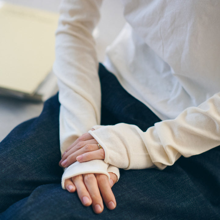 紫外線をカットしてくれる指先フリーのアームカバーです。手の甲まですっぽりカバーできて、安心です。自転車や車の運転にも大活躍!オーガニックコットン100%で肌ざわりもやわらかです。