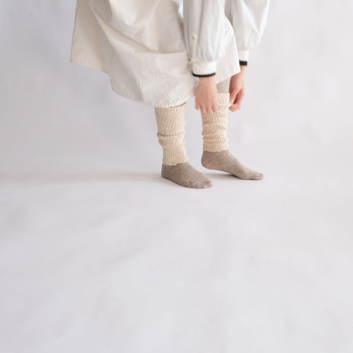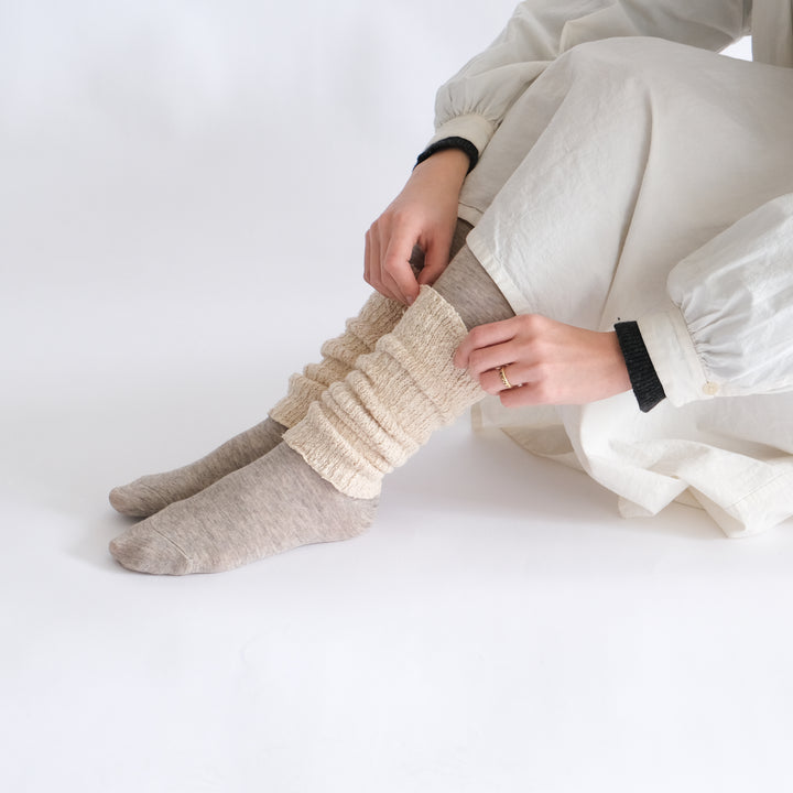 糸の太さが不均一なことで編み地に独特の凹凸感があり、ほどよくフィットするのでとてもあたたかでタオルのような優しい肌触りです。