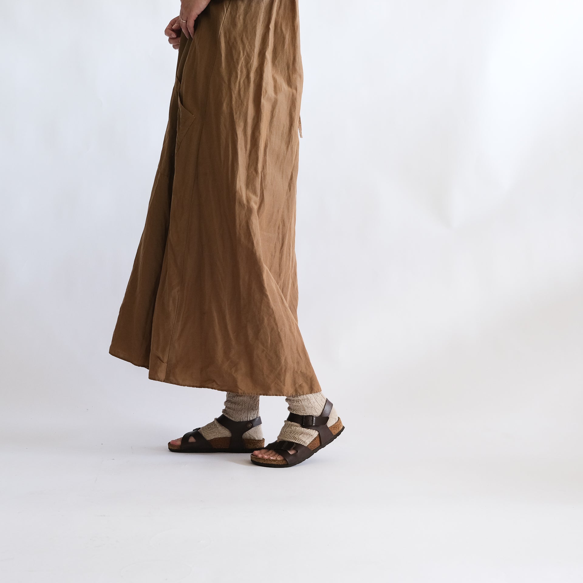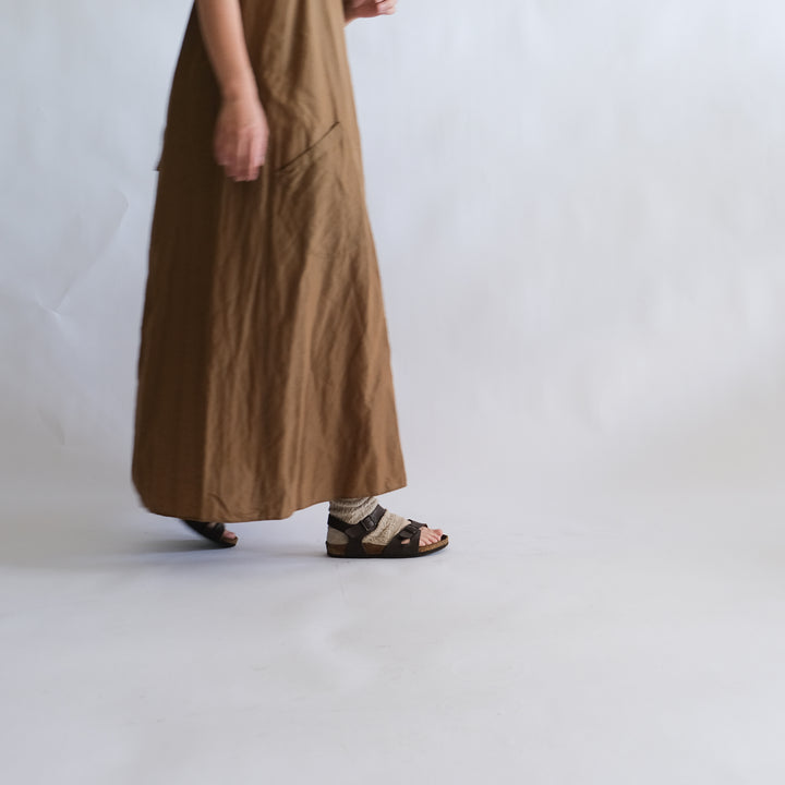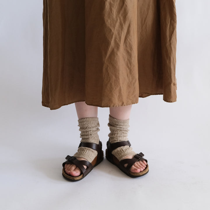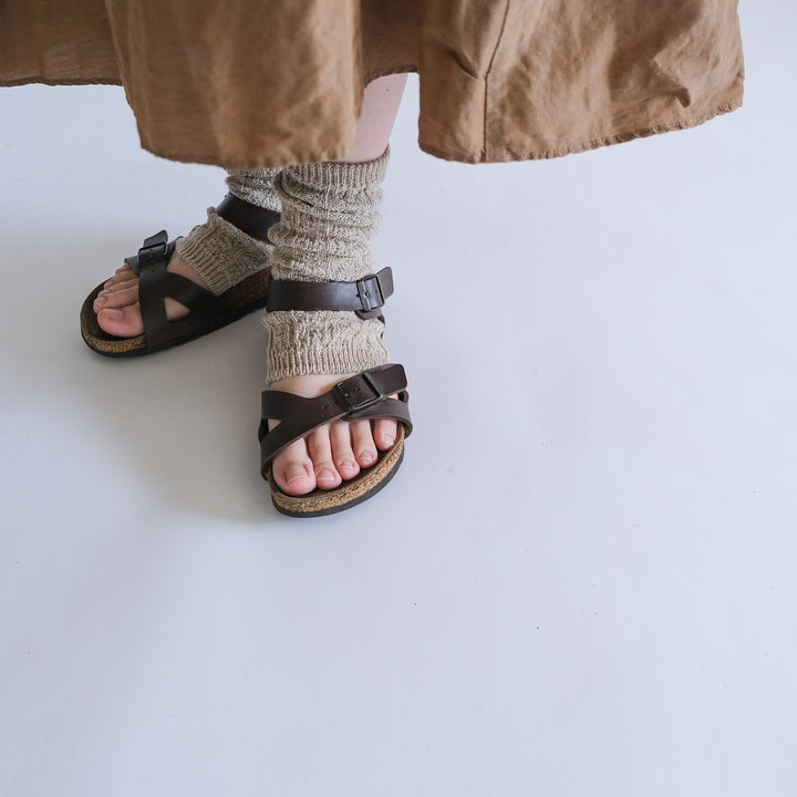 リネンのそのままの色は肌になじみやすく、コンフォートサンダルにもぴったりです。くつしたの上から重ね履きにもお使いいただけます。