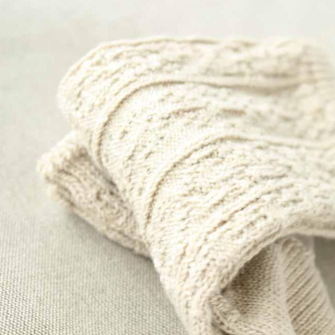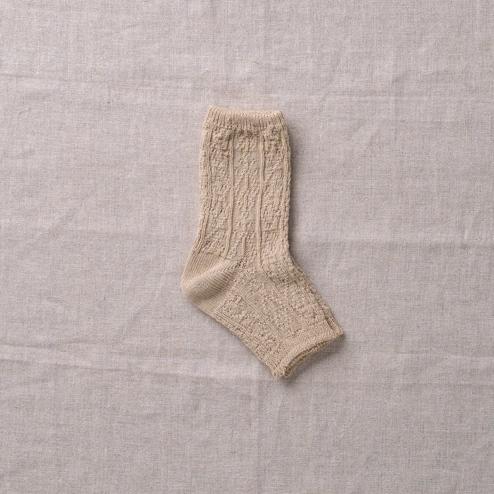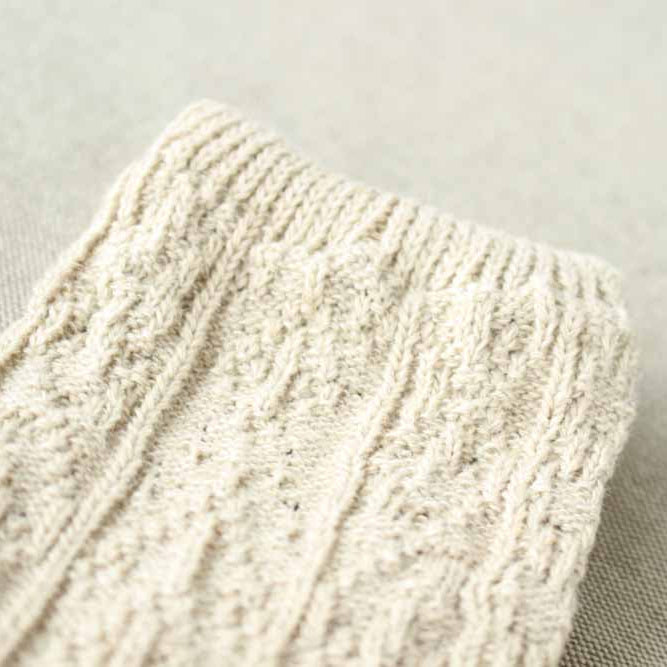 夏のおすすめ・リネン。綿麻糸をリンクス編みにしたサンダルソックスです。夏の冷えから足首を守ってくれます。