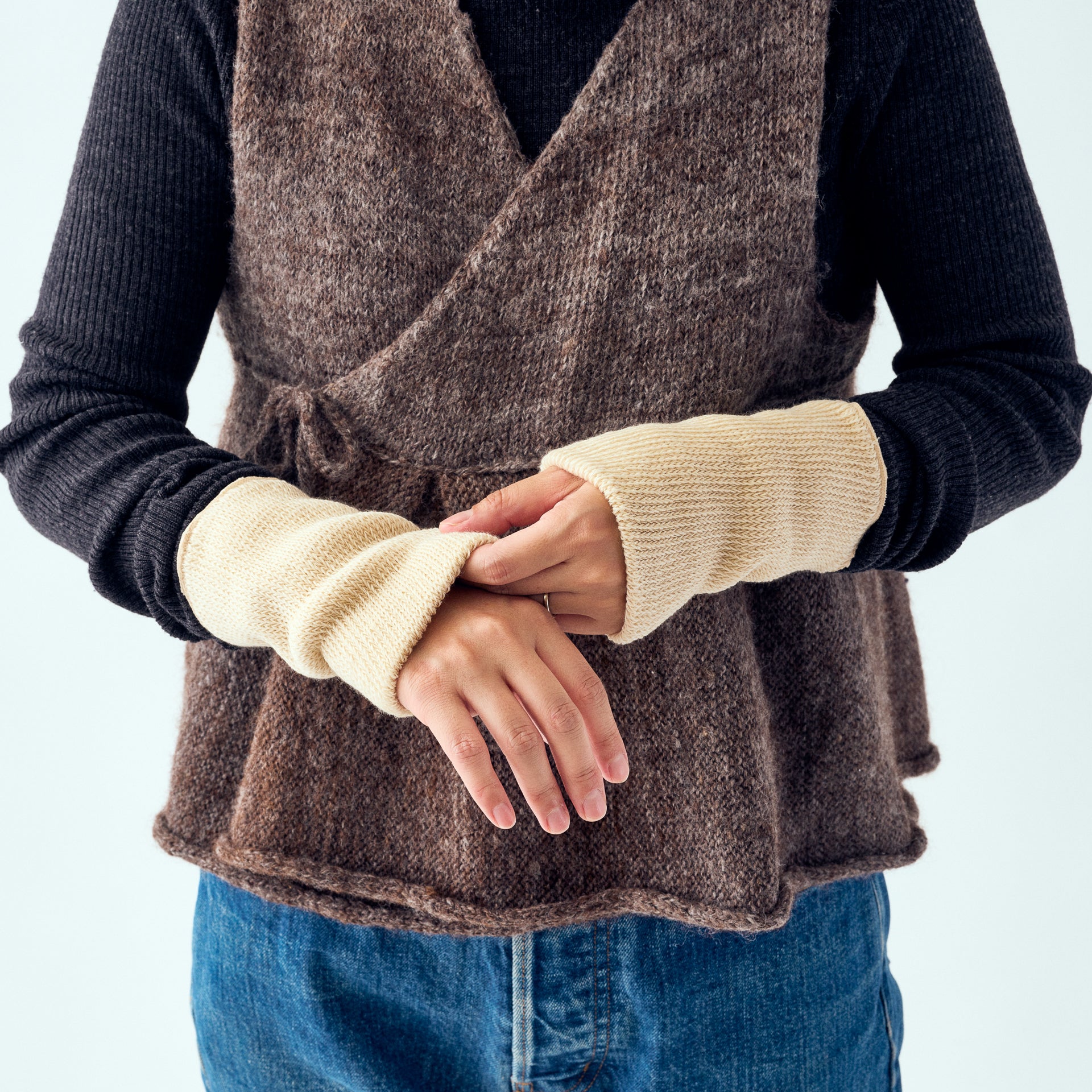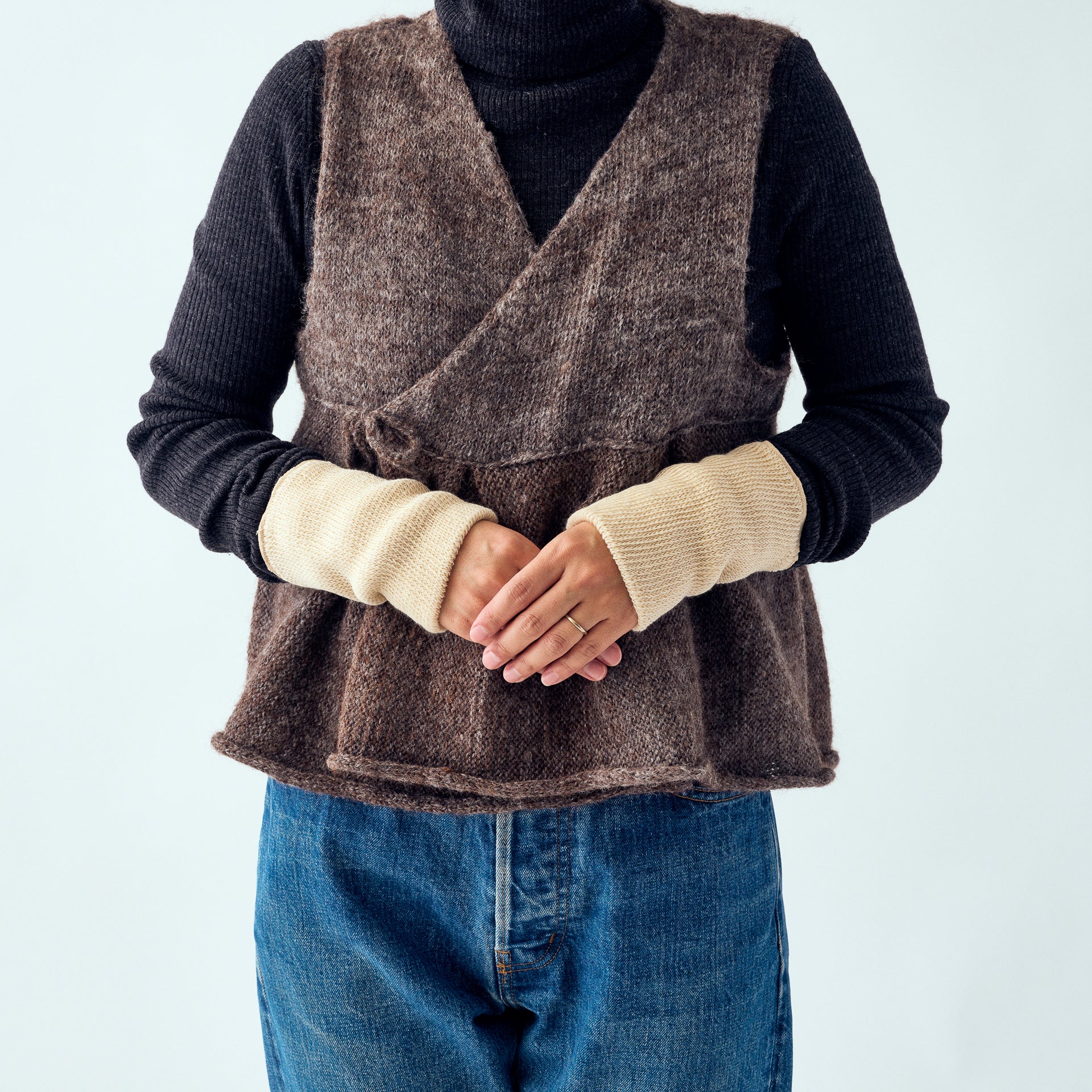 ふわふわやわらか、生地がふっくらしているヤク混のショートウォーマーです。