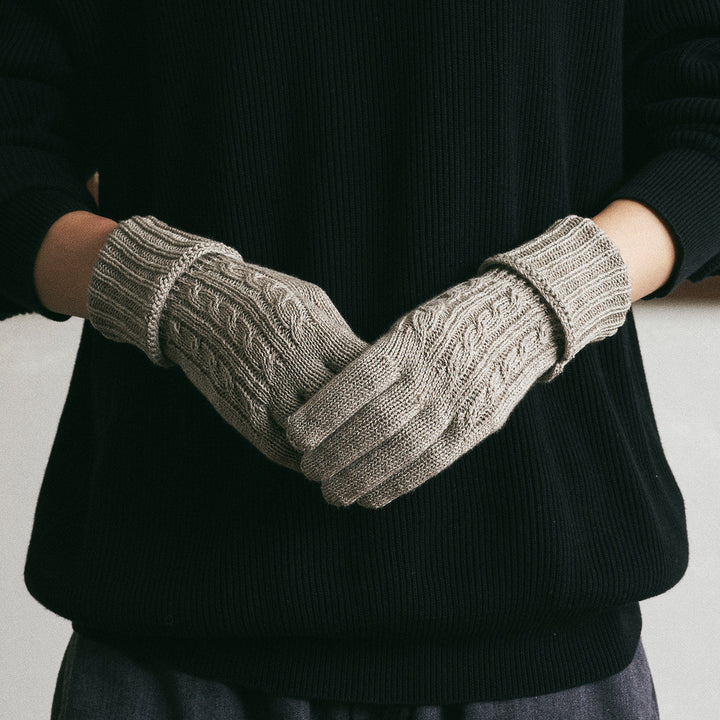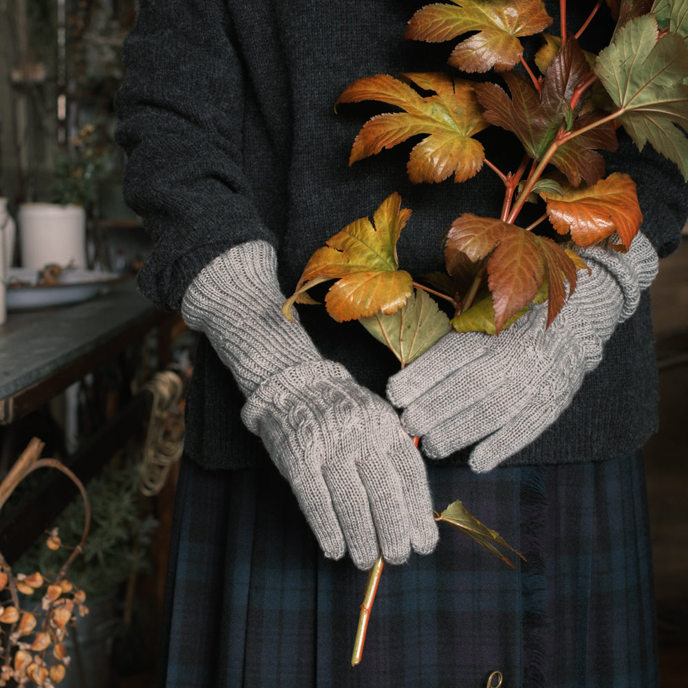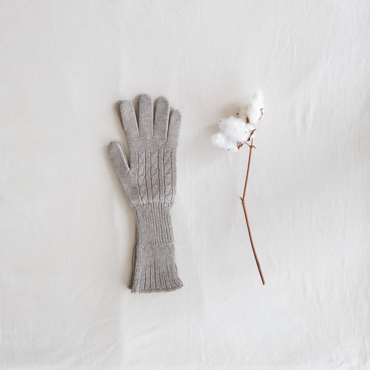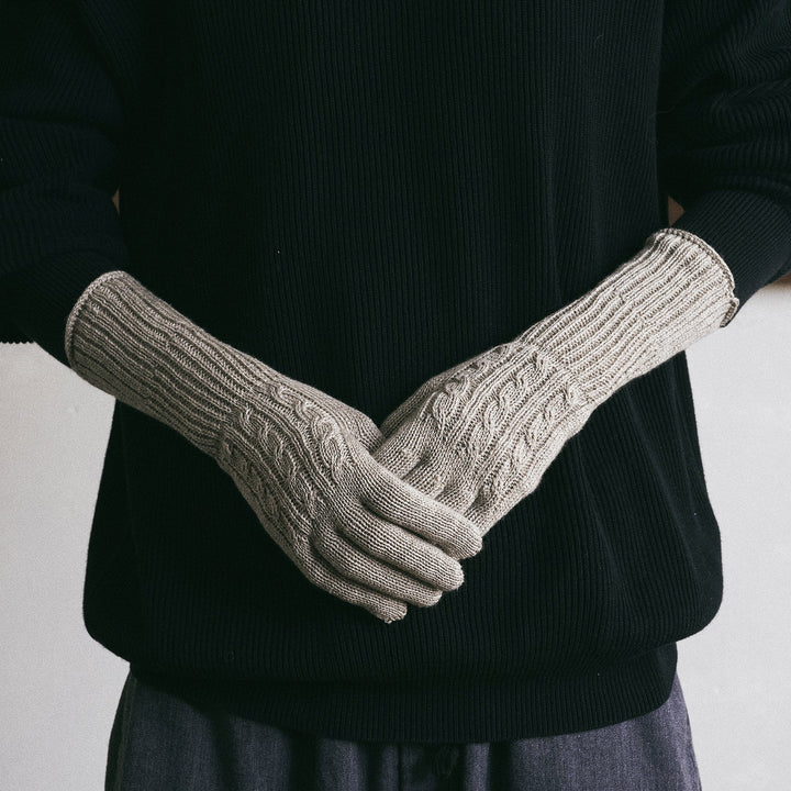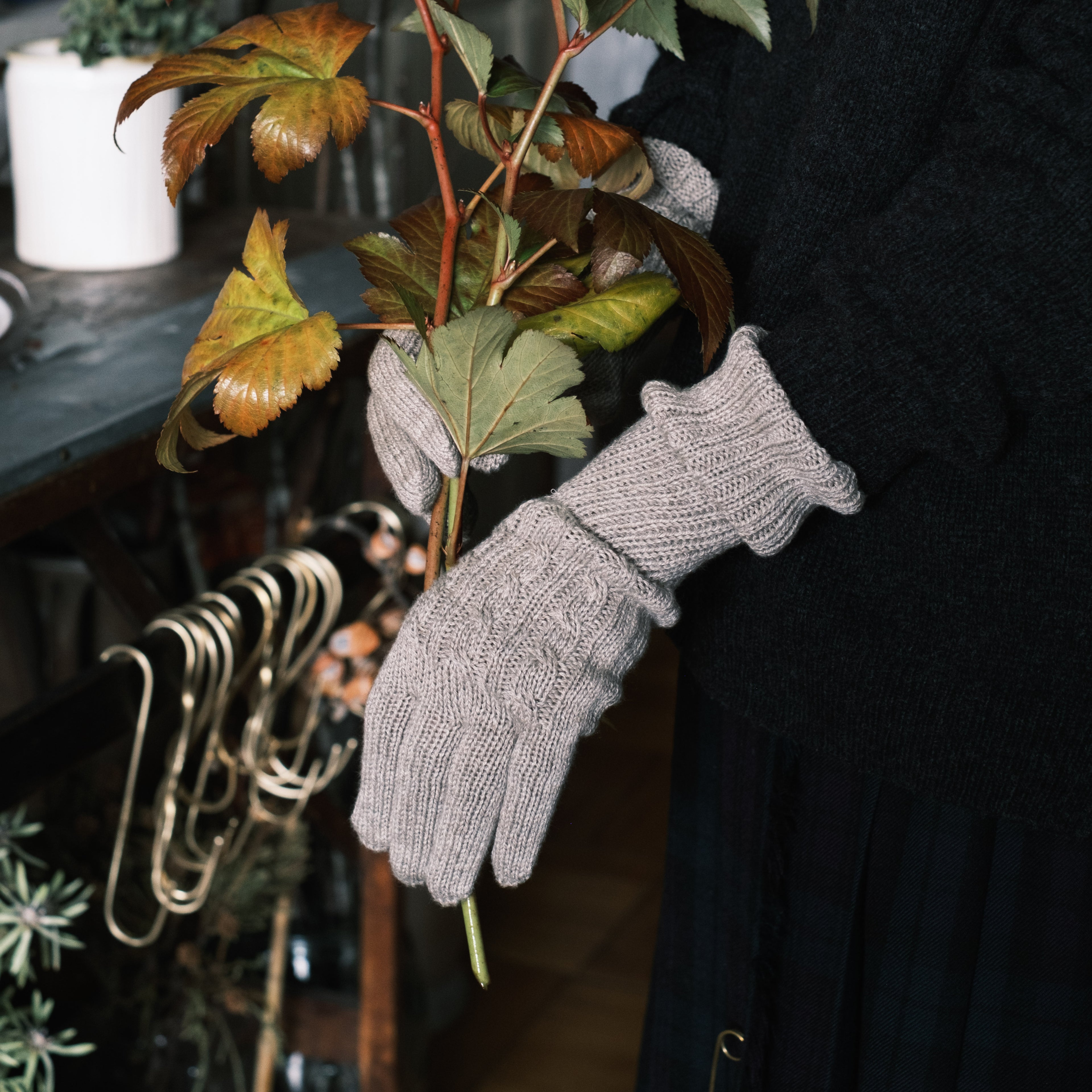 しなやかな超長綿のスーピマオーガニックコットンと高い保温性を持つヤクの混紡糸で編んだやわらかで、とてもあたたかい手袋です。手首リブ部分は袖口の広いアウターなど隙間からの寒さからしっかりガードできるよう長めになっています。二重に折り返すとよりあたたかさを感じます。