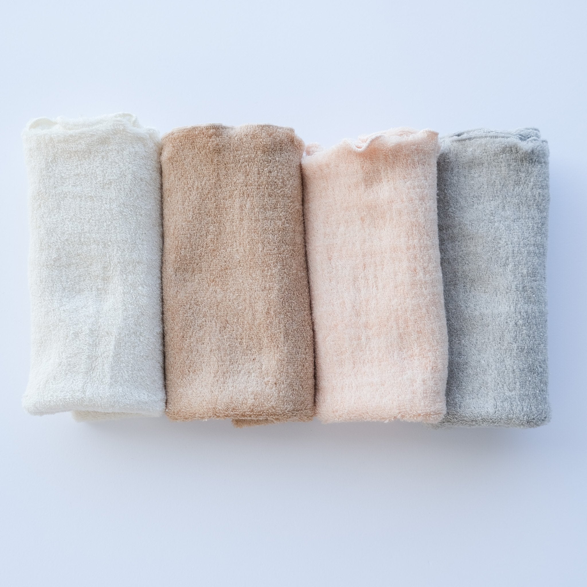 生成と茶綿はオーガニックコットン原綿そのままの色で、アースレッド・アースグレーは地層の色で染めた彩土( ハニ) 染めオーガニックコットン糸を使用しています。