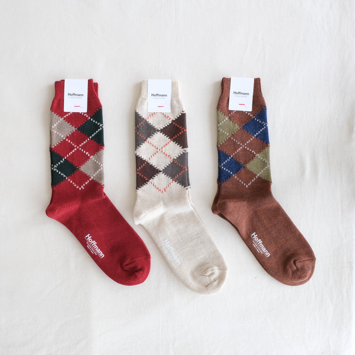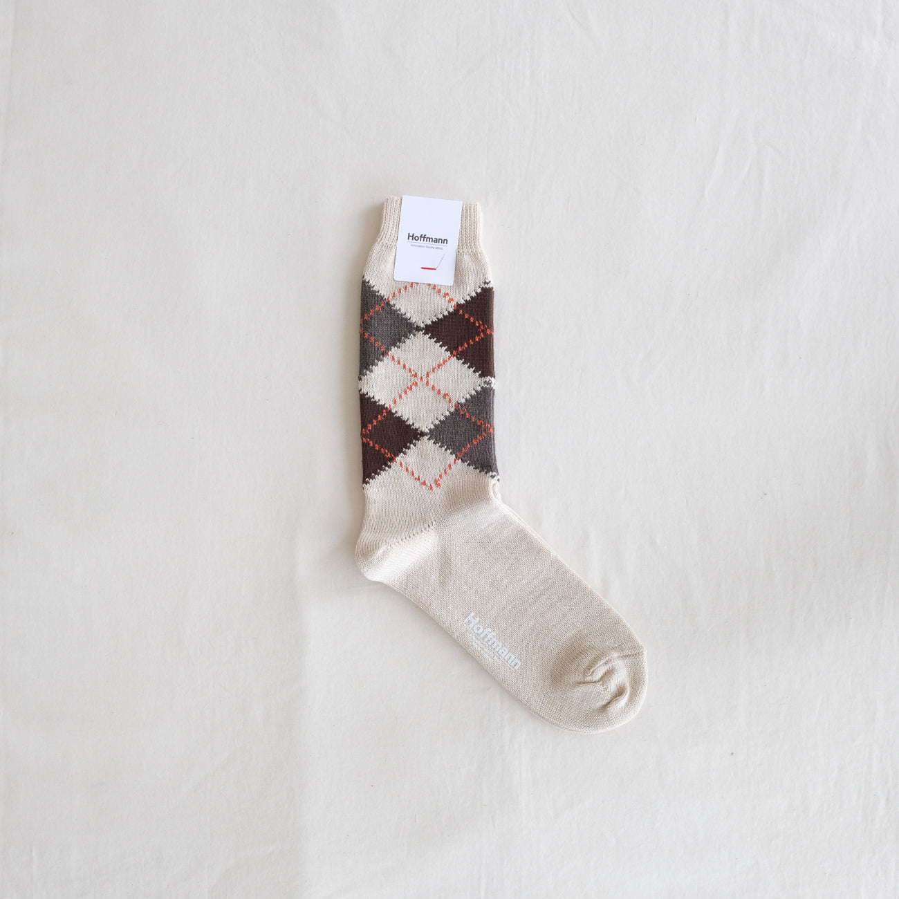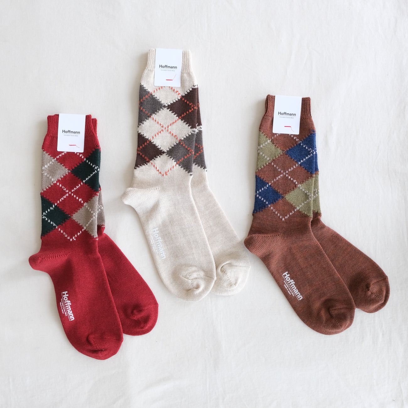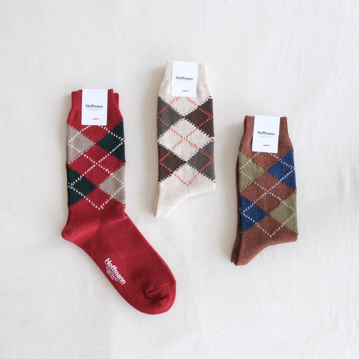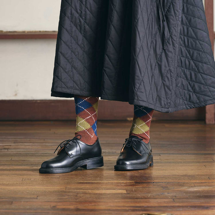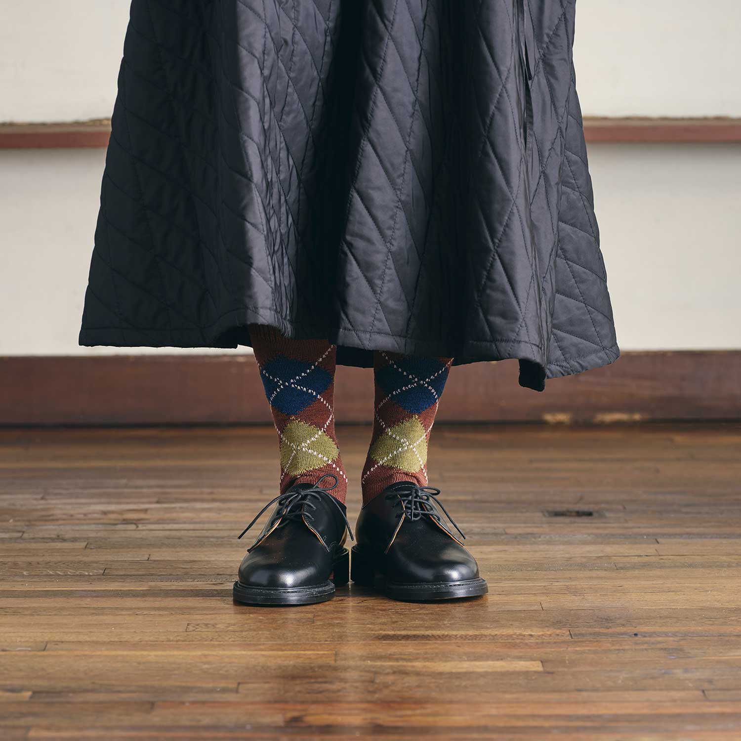 由来は諸説あるそうですが、スコットランドにあるアーガイル城の王女が恋人への贈り物として考え出したと言われるアーガイル柄。滑らかで肌触りの良い梳毛のウールと柔らかなコットンの混紡糸で編み立てました。大切な方への贈り物にもおすすめの1足です。