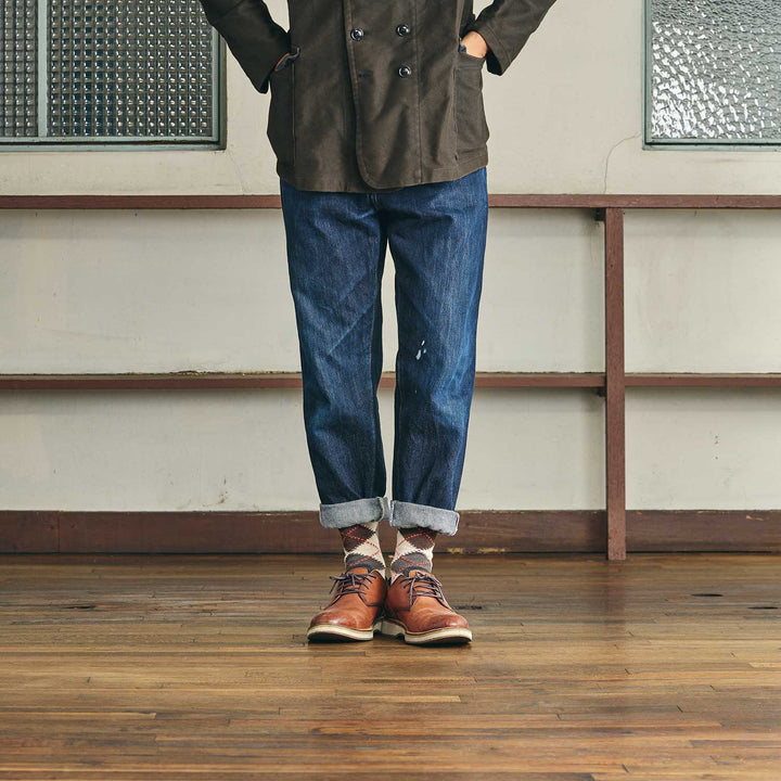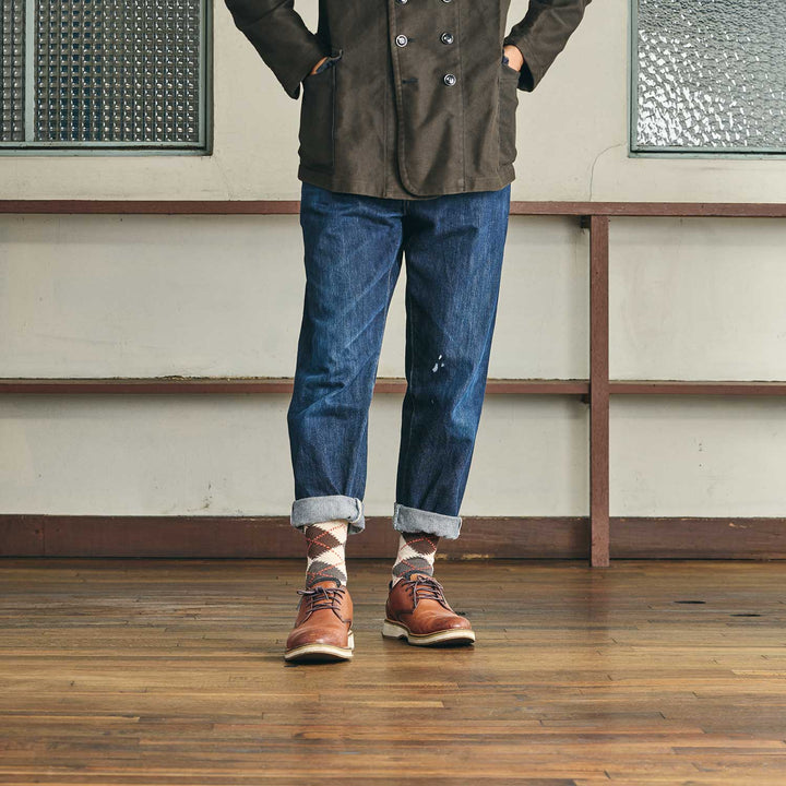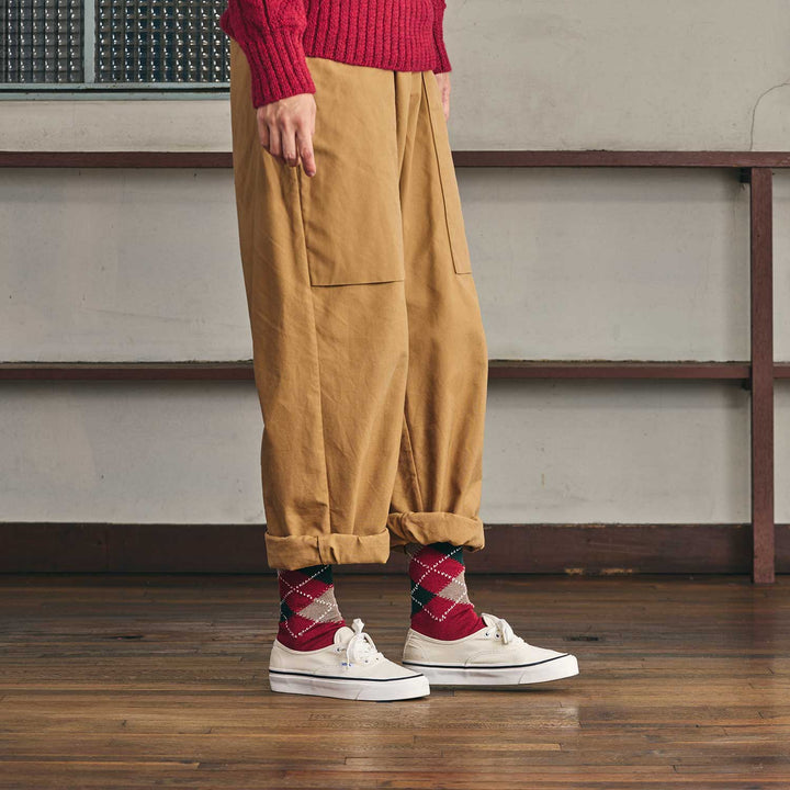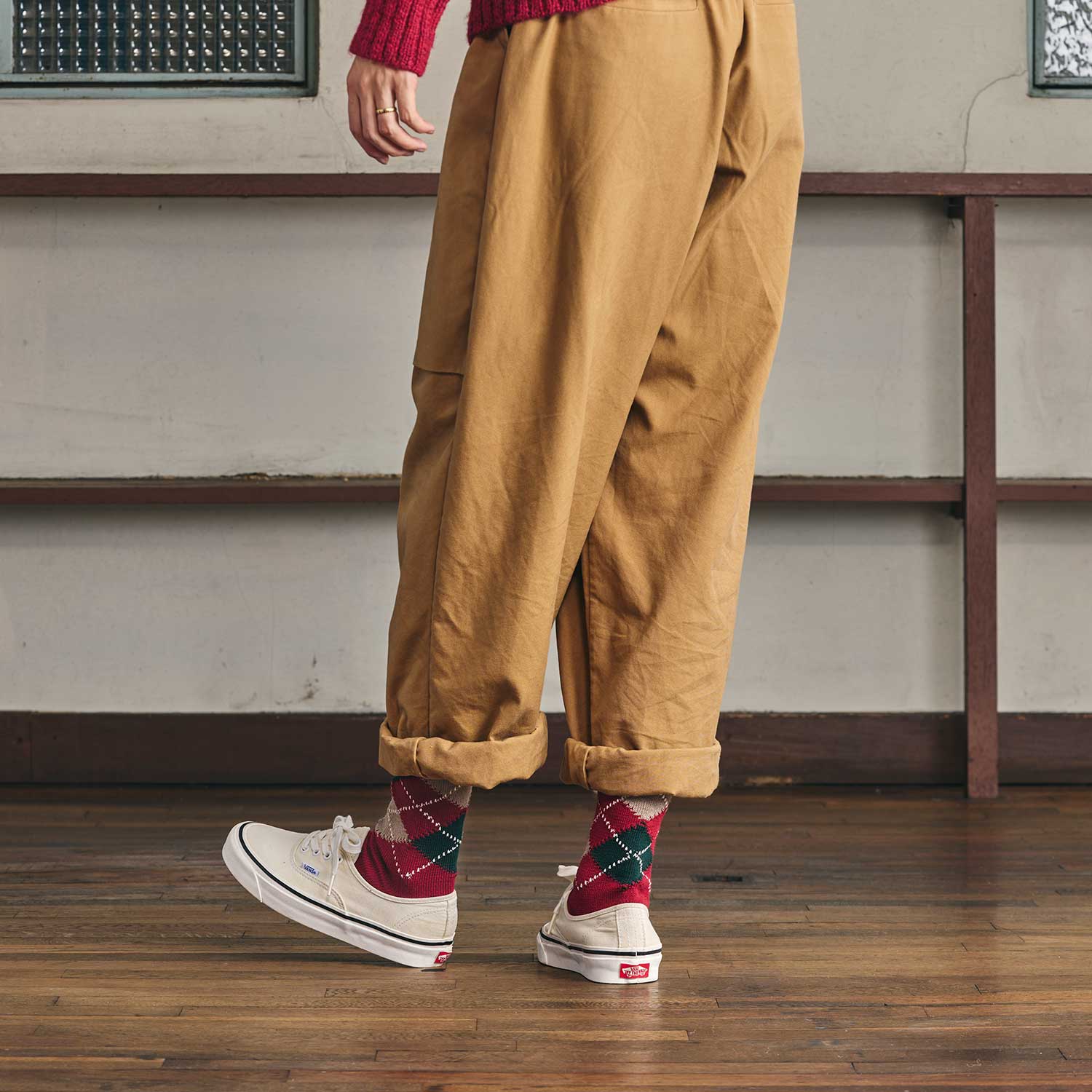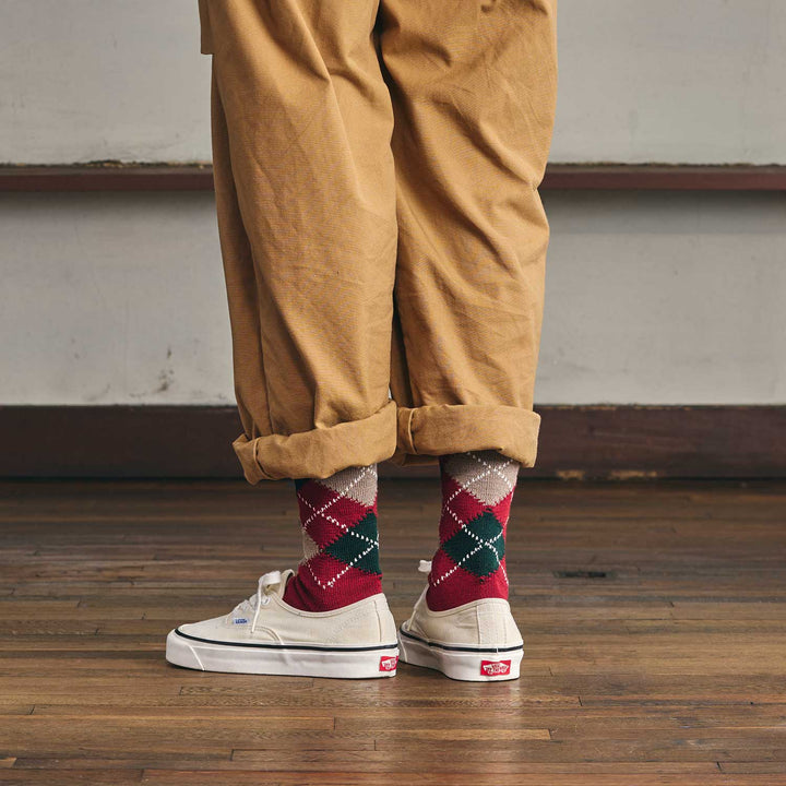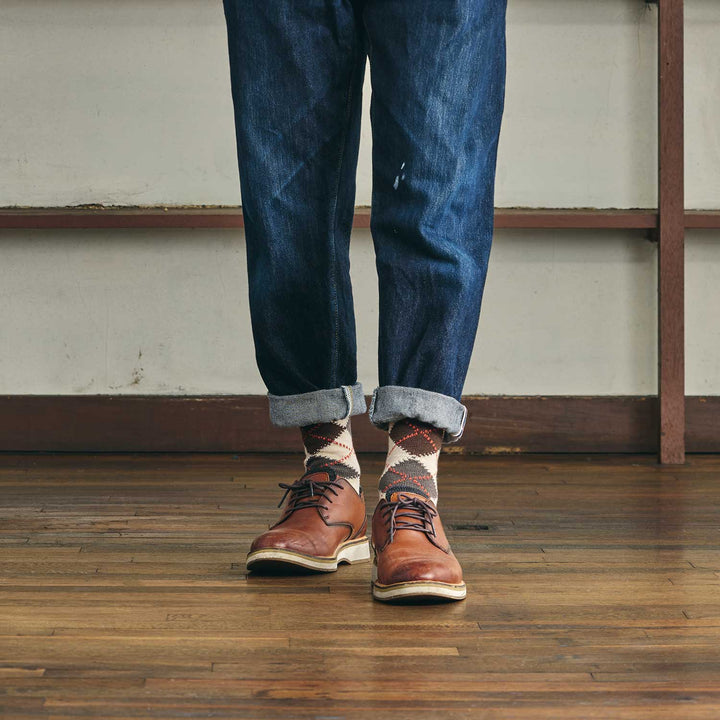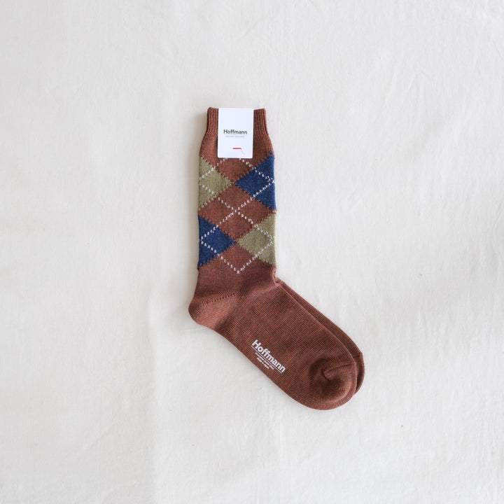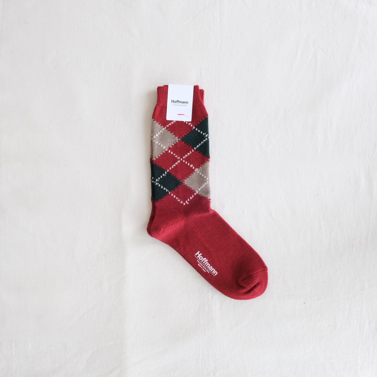 由来は諸説あるそうですが、スコットランドにあるアーガイル城の王女が恋人への贈り物として考え出したと言われるアーガイル柄。滑らかで肌触りの良い梳毛のウールと柔らかなコットンの混紡糸で編み立てました。大切な方への贈り物にもおすすめの1足です。