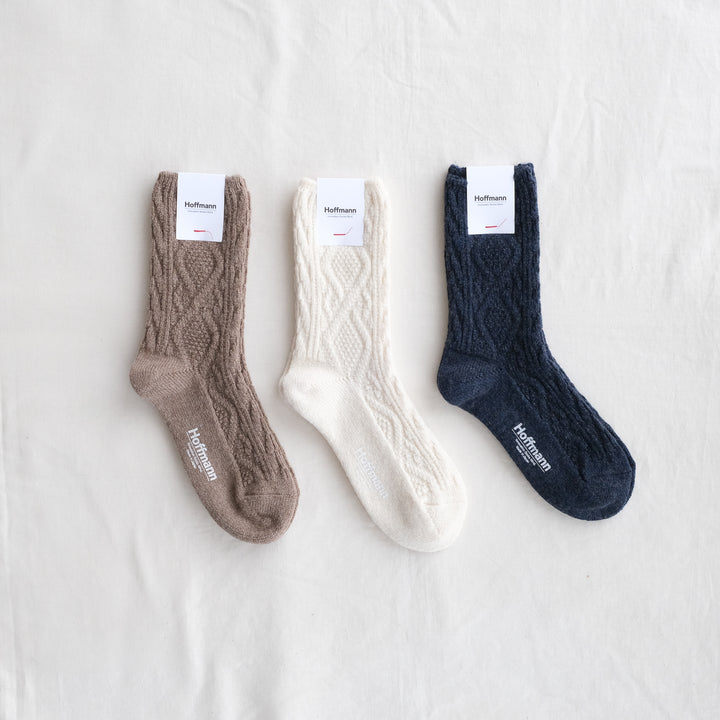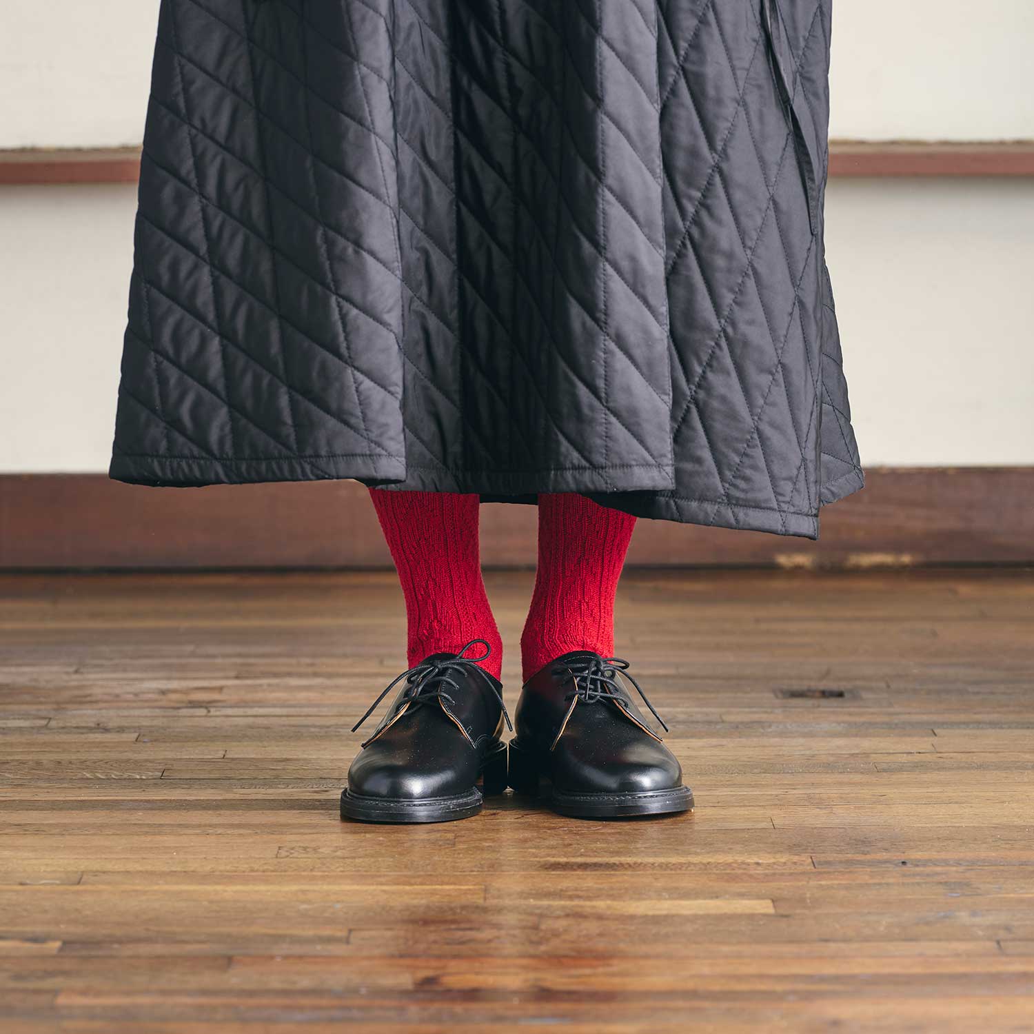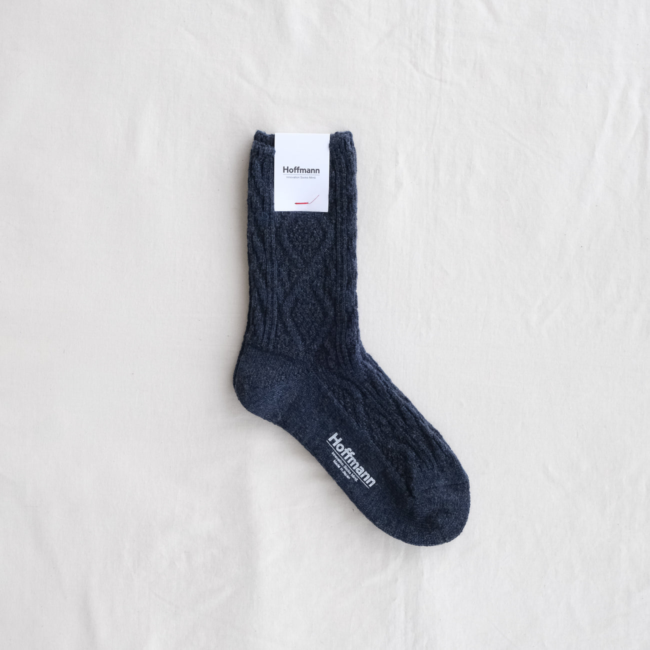 ローゲージの機械で編み立てた、あたたか味のあるリンクス柄ソックス。空気を多く含んだ膨らみのある紡毛のウールを使い編み立てているため保温性に優れ、寒い季節の足元をやさしく包み込みます。大切な方への冬の贈り物にもおすすめです。