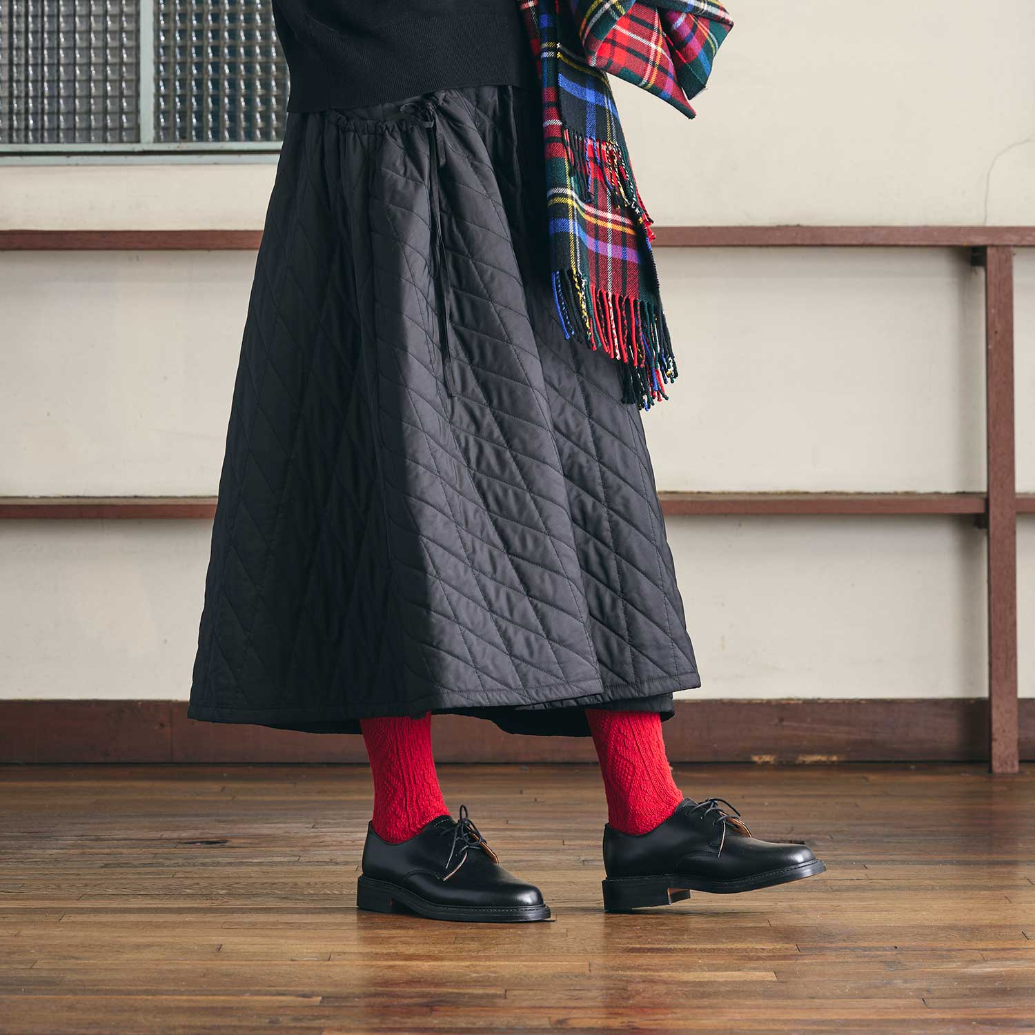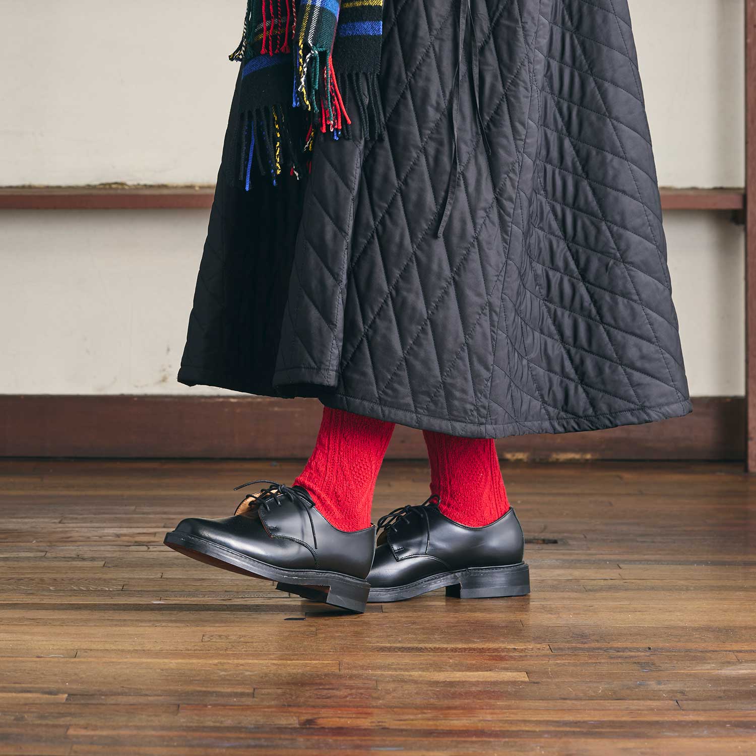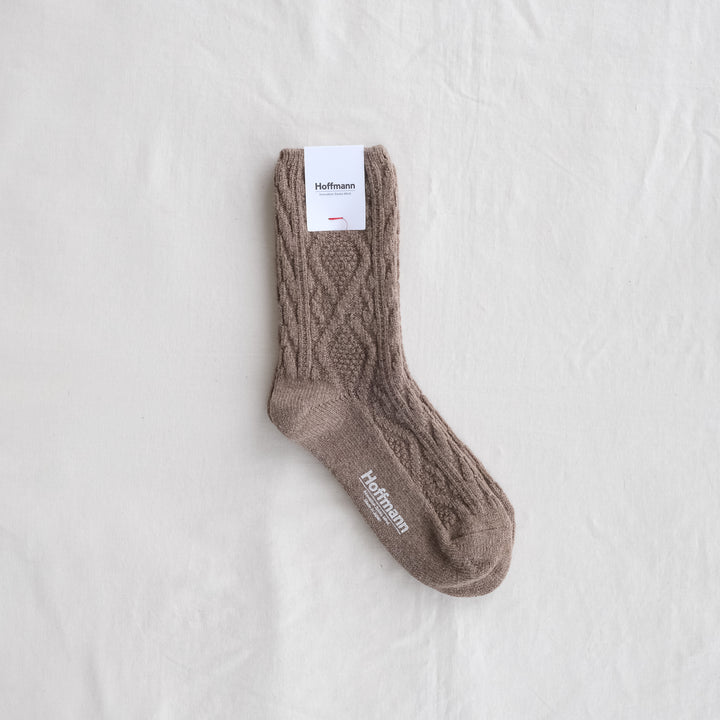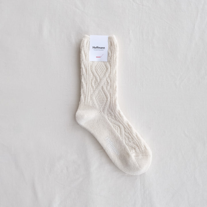 ローゲージの機械で編み立てた、あたたか味のあるリンクス柄ソックス。空気を多く含んだ膨らみのある紡毛のウールを使い編み立てているため保温性に優れ、寒い季節の足元をやさしく包み込みます。大切な方への冬の贈り物にもおすすめです。