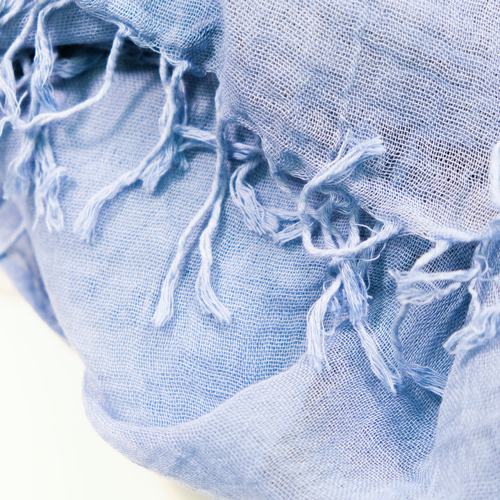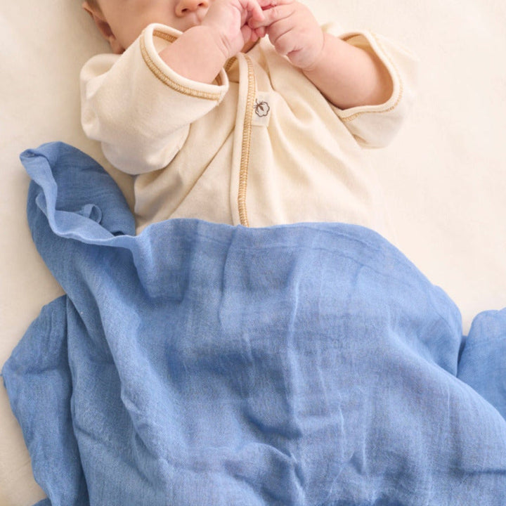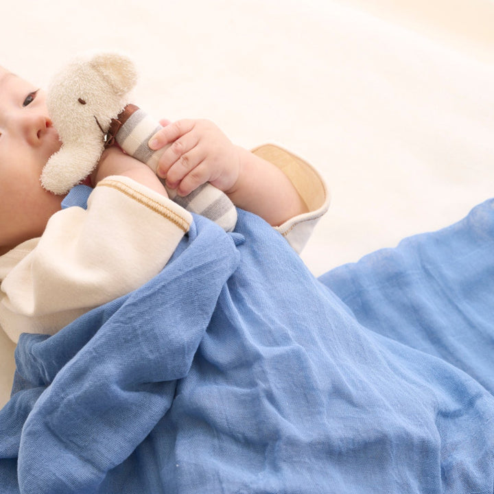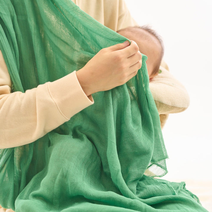 オーガニックコットンを丁寧に織り上げ、糸の本数や織るときのテンションのかけ方を工夫することでタッチが軽く、赤ちゃんも使いやすいガーゼに仕上がっているので肌掛けや授乳ケープの代用にもなり重宝します。